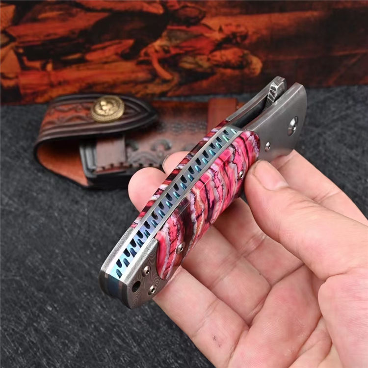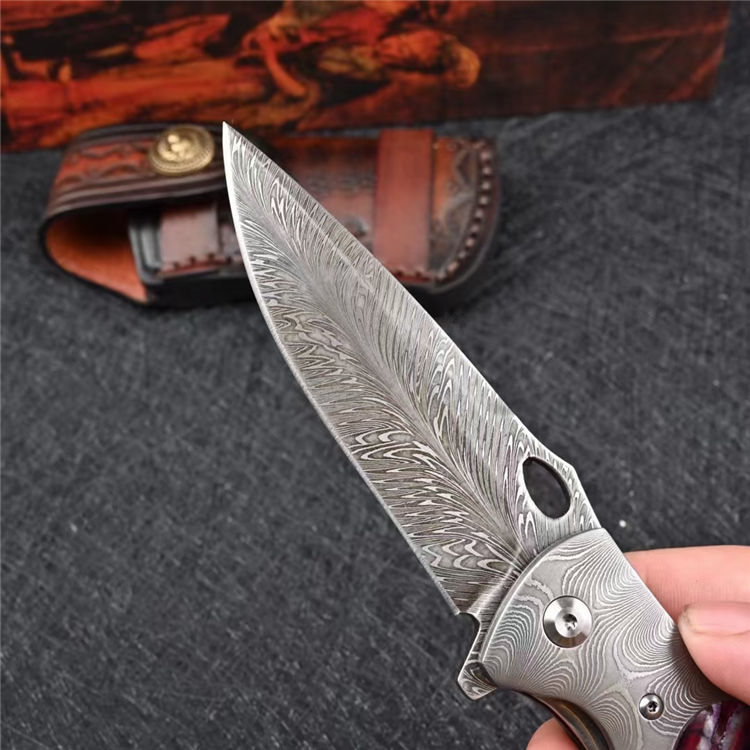 大马士革羽毛蚊钢非凡折刀 总长:20cm 折合:11.5cm 刃长:9cm 刃厚:3.1mm 刃宽:2.7cm 钢材:俄罗斯进口羽毛蚊钢 硬度:60-61HRC,真空热处理 开刃方式:二次开刃 柄材:大马士革+天然猛犸齿料制作 结构:陶瓷轴承滚珠 包装:手工黑小盒装
