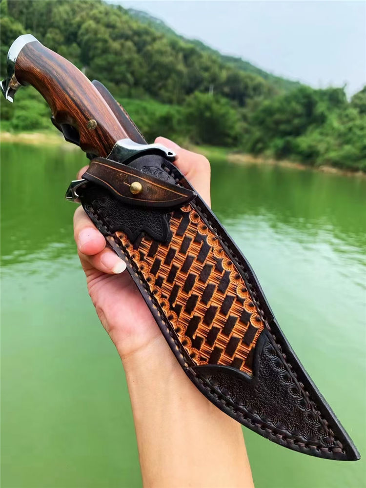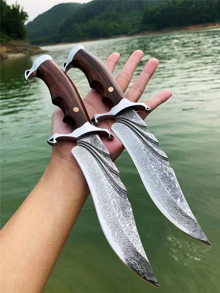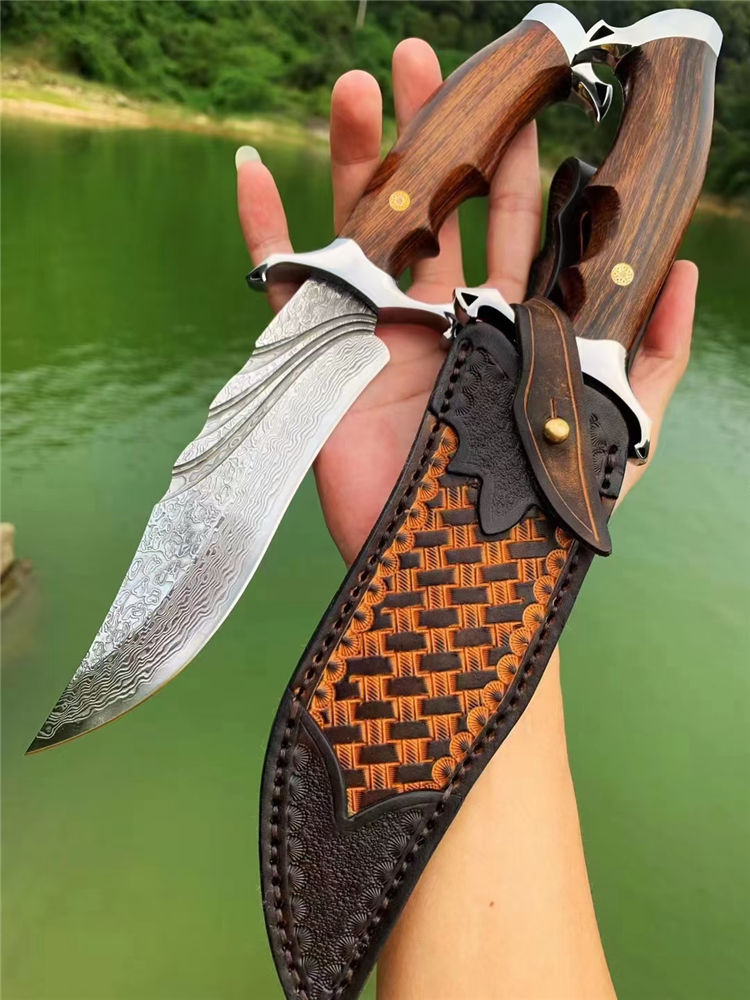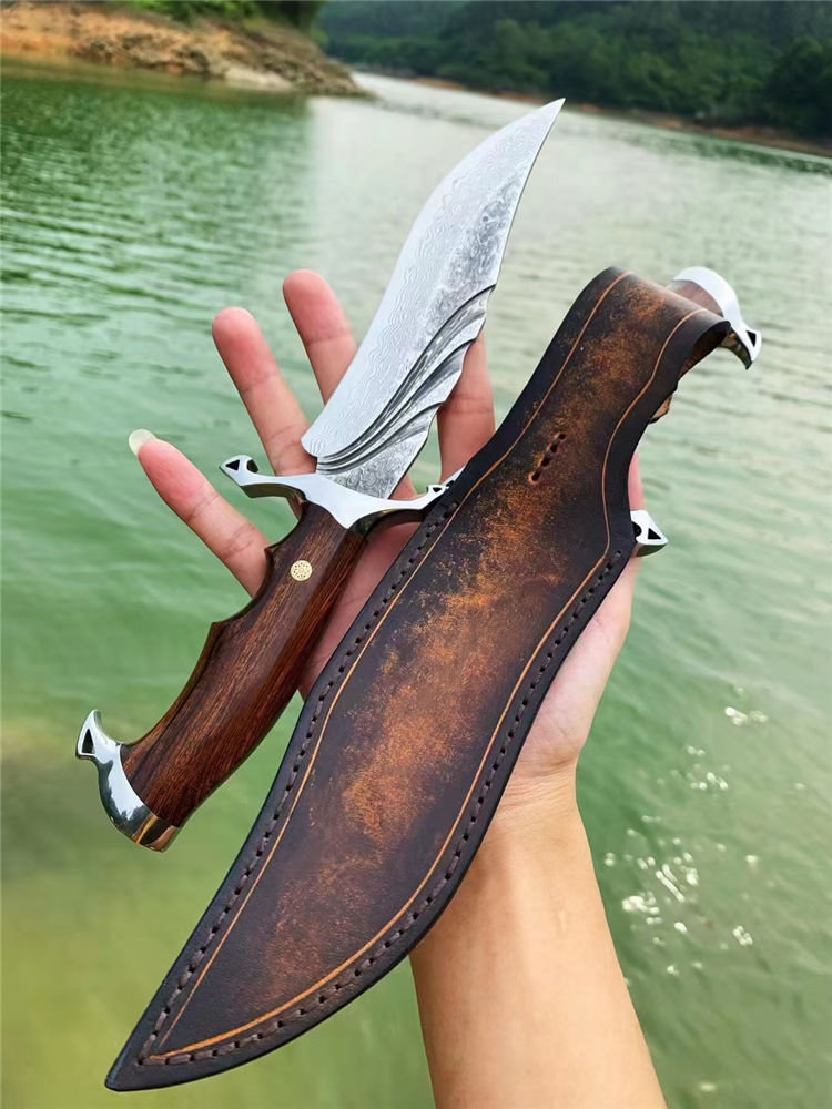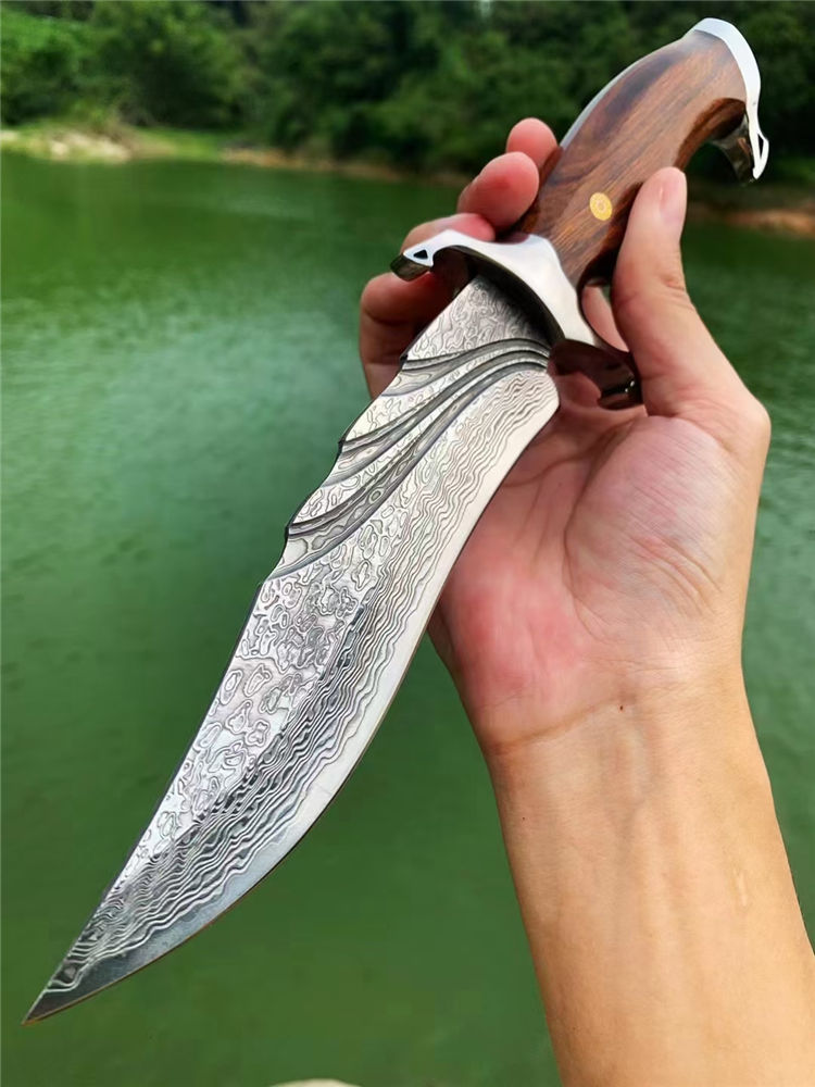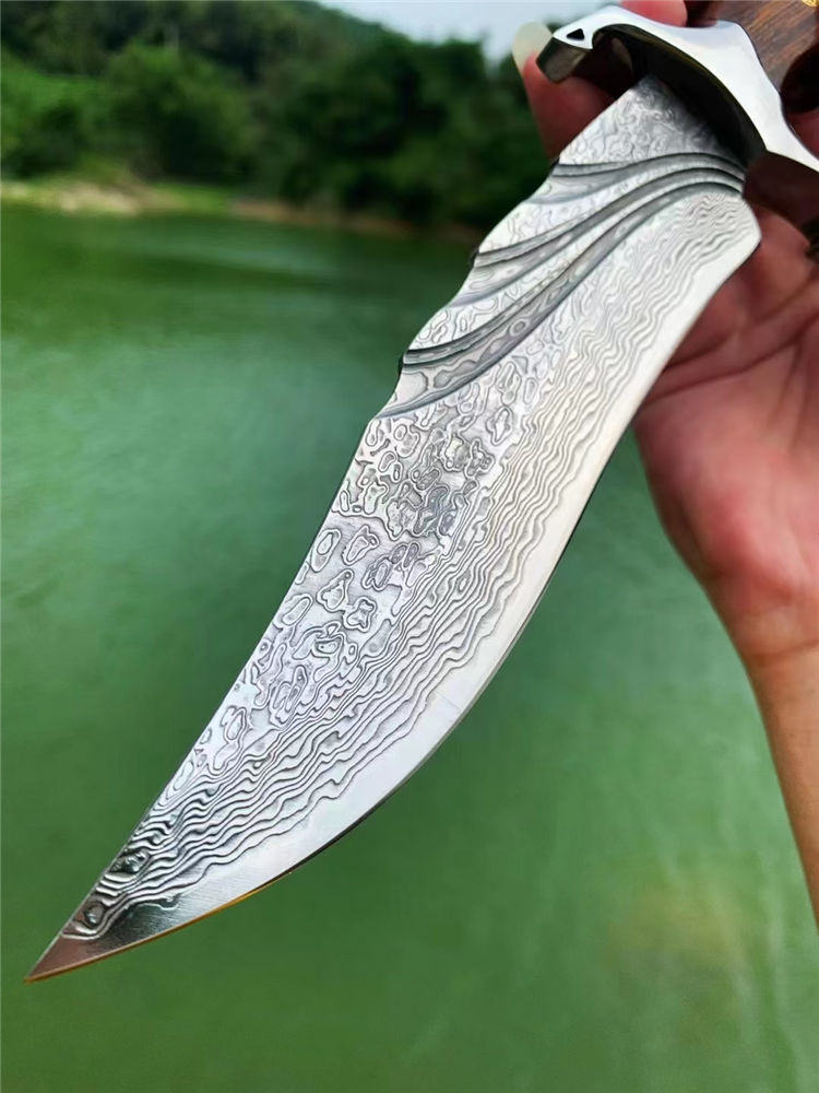 大马士革惊鸿博弈直刀 总长:28cm 刃长:16cm 柄长:12cm 刃厚:4MM 刃宽:3.5cm 刃材:VG10大马士革钢、真空热处理 硬度:60HRC 柄材:镜面钢头+美国沙铁木 包装:手工皮套+骷髅吊坠