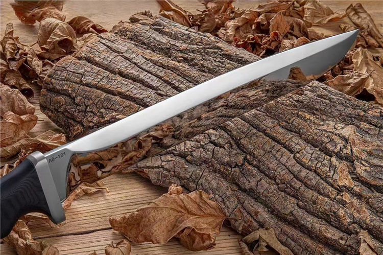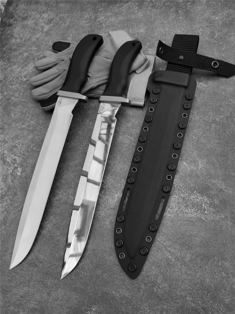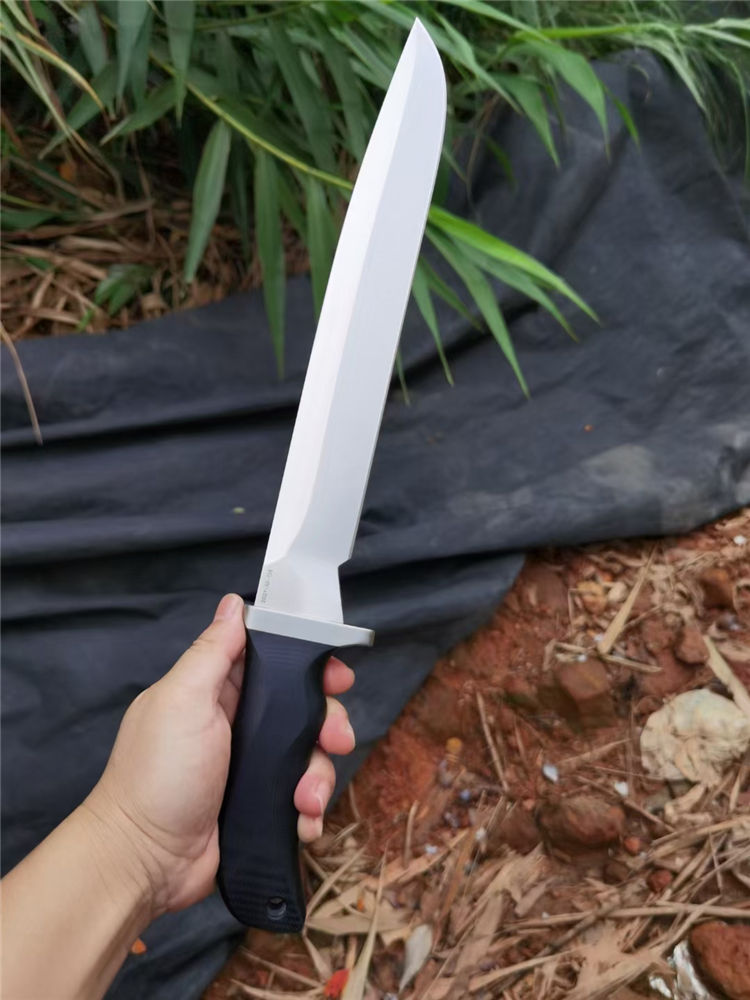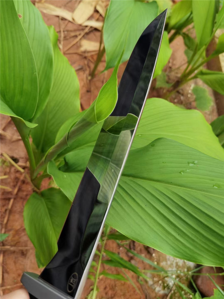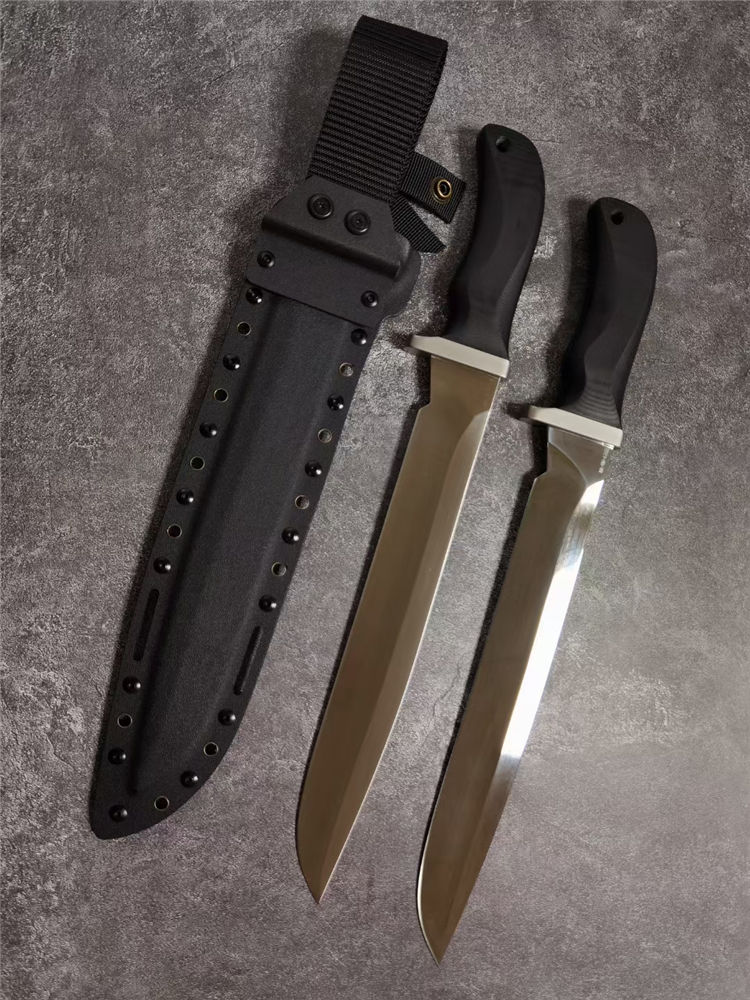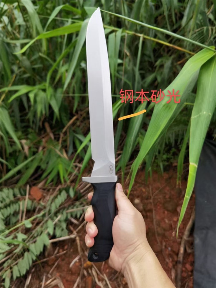 华匠坊疯狗大法器直刀 刃材:A8 全长:430mm 刃长:300mm 柄长:130mm 刃宽:37mm 刃厚:5.5mm 护手:钛合金 硬度:59-60 净重:500克 表面:刀条镜面和砂光两种 柄材:黑色G10 刀鞘:2.0美产K鞘 本刀有两种工艺: 1:刀条镜面+护手钛合金 2:刀条砂光+护手钛合金 3:刀鞘:2.0美产K鞘,鞘里面植绒,(注意:鞘里面不要弄进水)