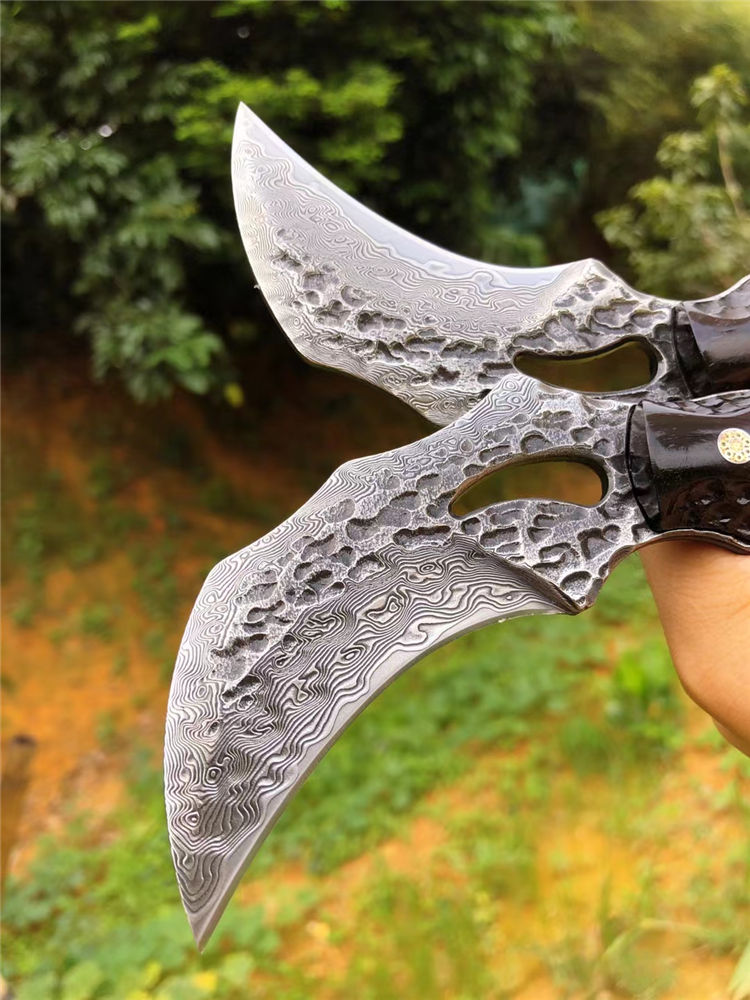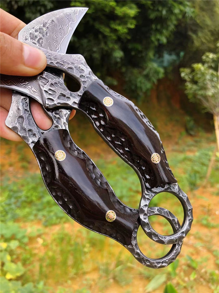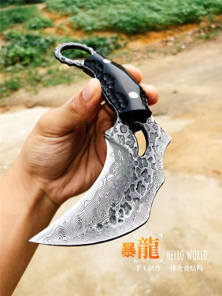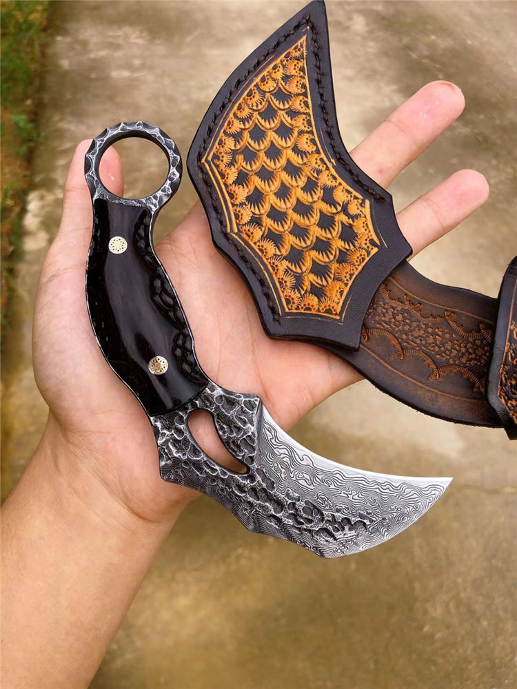 大马士革暴龙爪刀 总长:17.2cm 刃长:8cm 手柄:9cm 刃厚:4MM 钢材:进口锻造大马士革钢 硬度:60HRC 开刃方式:多次水冷二次开刃 工艺制作:纯手工打磨抛光制作 柄材:进口黑檀木手工打凹凸质感防滑 皮套:意大利进口优质植鞣皮纯手工雕花皮套
