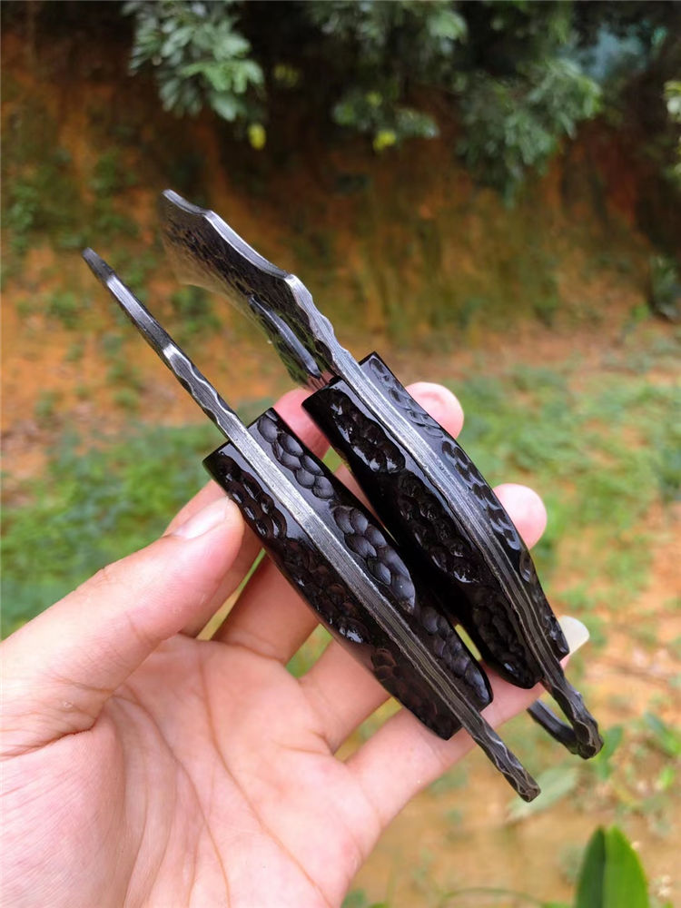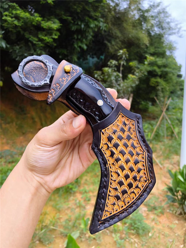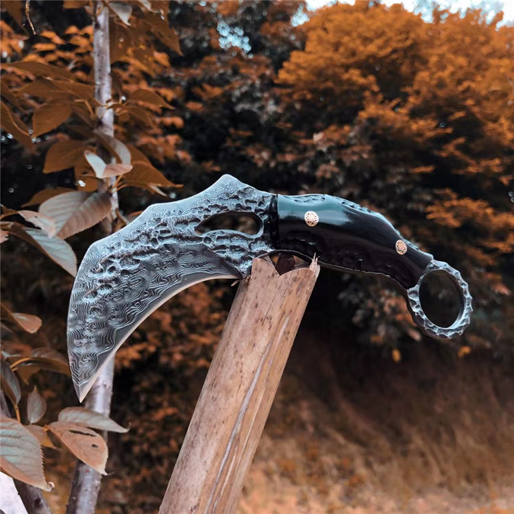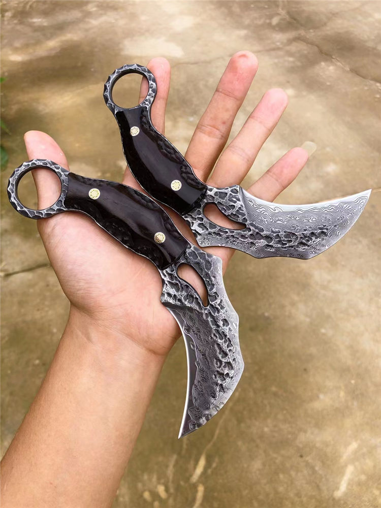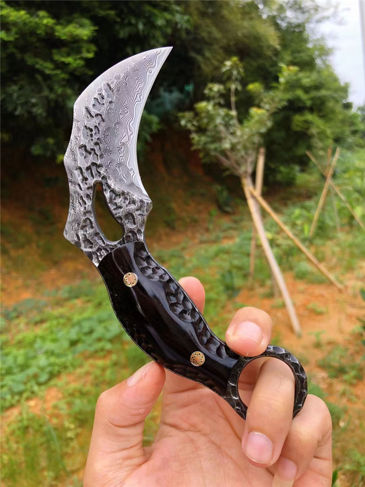 大马士革暴龙爪刀 总长:17.2cm 刃长:8cm 手柄:9cm 刃厚:4MM 钢材:进口锻造大马士革钢 硬度:60HRC 开刃方式:多次水冷二次开刃 工艺制作:纯手工打磨抛光制作 柄材:进口黑檀木手工打凹凸质感防滑 皮套:意大利进口优质植鞣皮纯手工雕花皮套