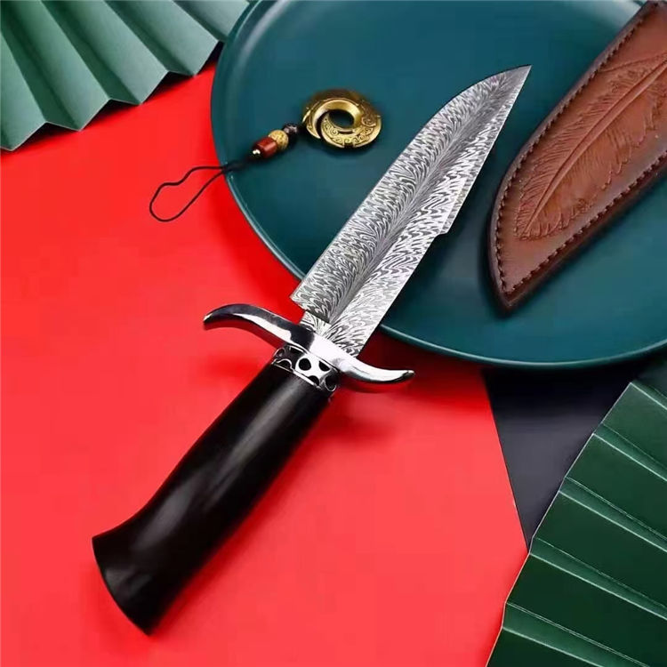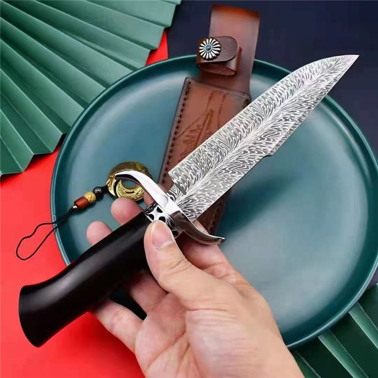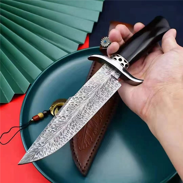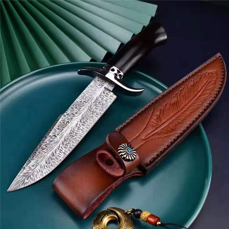 灵羽博伊直刀 总长:28cm 刃长:15cm 刃宽:3.5cm 厚度:4mm 刃材:9Cr15Mov 表面:腐蚀羽毛纹 硬度:59~60HRC 手柄:不锈钢头档手+黑檀木 皮套:真牛皮刀套+礼品盒 复古时尚,手工纯手工制作,搭配真牛皮套,9Cr15Mov刀刃表面腐蚀羽毛纹,非常漂亮耐看,原条黑檀木手柄,做工细节很好
