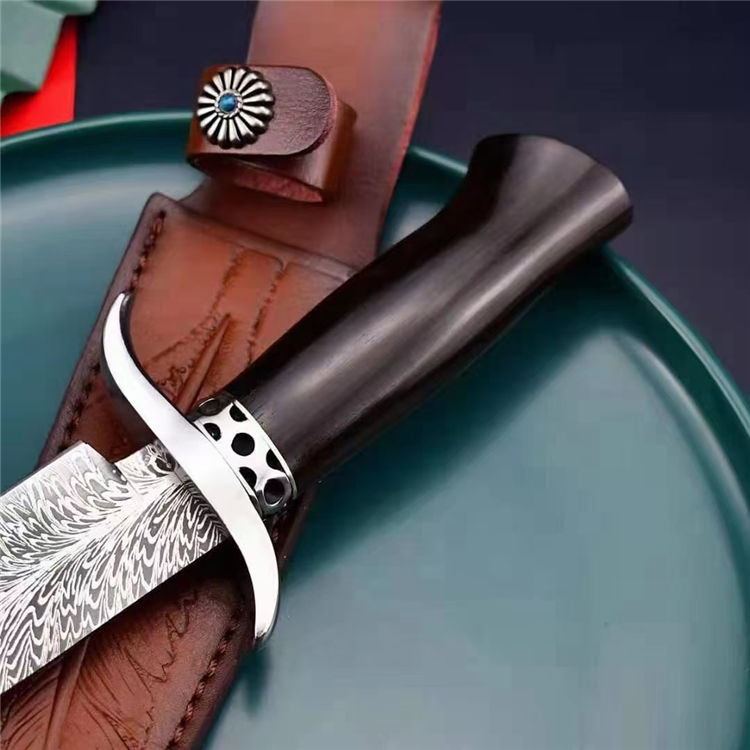 复古时尚,手工纯手工制作,搭配真牛皮套,9Cr15Mov刀刃表面腐蚀羽毛纹,非常漂亮耐看,原条黑檀木手柄,做工细节很好