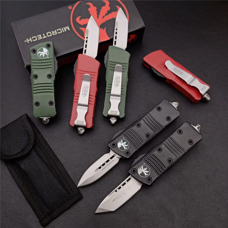 微技术经济版迷你龙直出跳刀 全长:138mm 刃长:48mm 闭合:90mm 刃宽:16mm 刃厚:3mm 刃材:9CR18 硬度:58-59HRC 柄材:锌铝合金 柄厚:101mm 螺丝:数控电脑锣 净重:110g 毛重:142g 包装:尼龙套+彩色纸盒