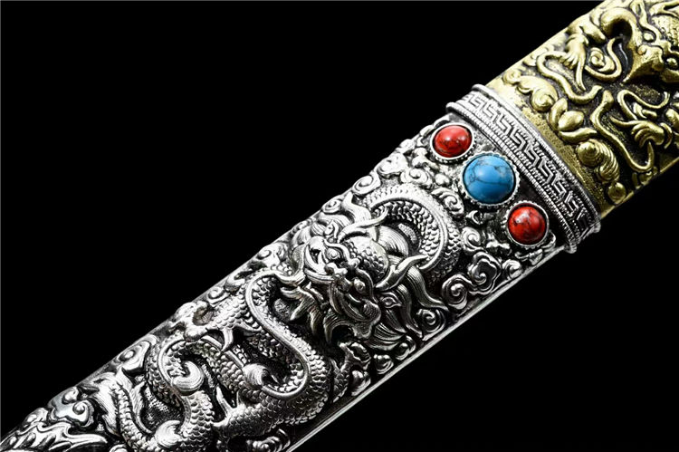 吉祥龙藏刀 全长:68cm 柄长:16.5cm 刃长:49cm 刃宽:最宽处5.1cm 刃厚:0.9cm 净重:1.78kg 硬度:60 全手工师傅手工雕刻镂空铜鞘镀金镀银,弹簧钢锻打刃材,手工打磨成型