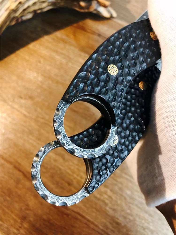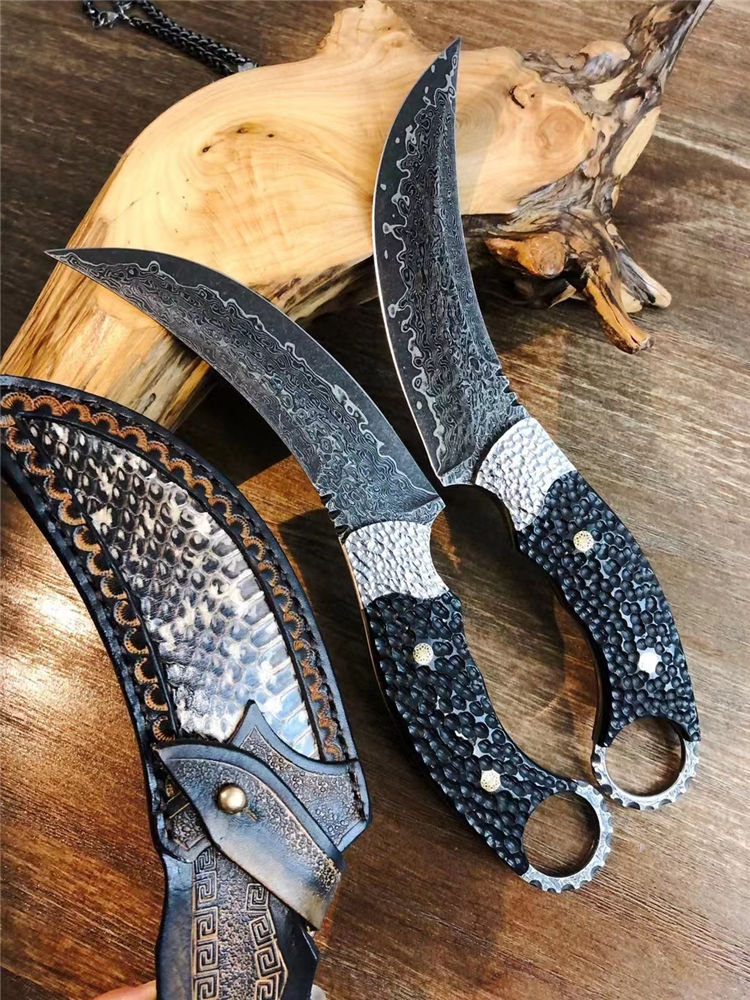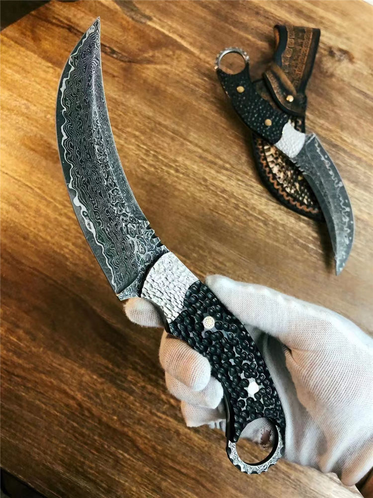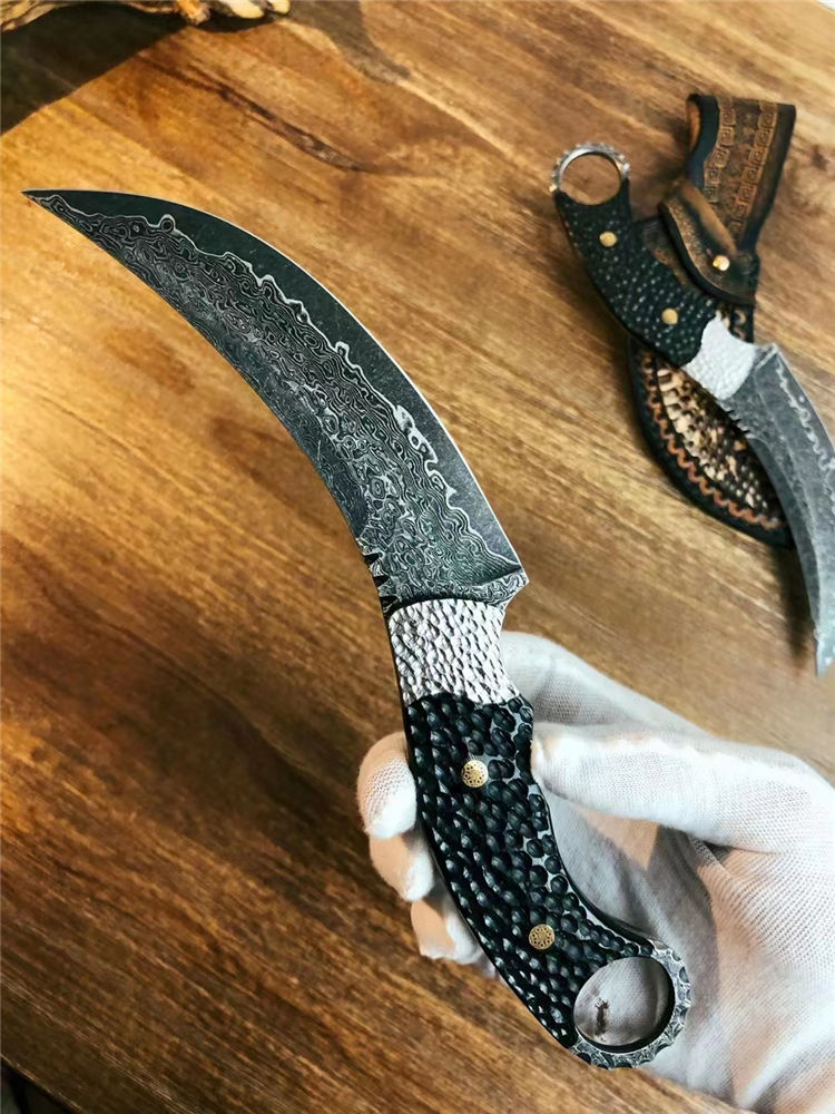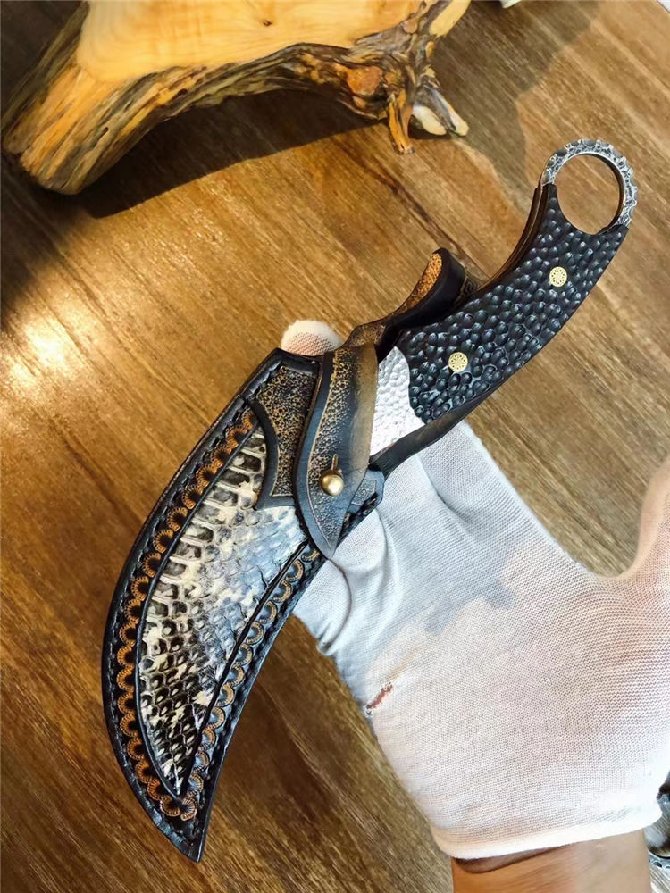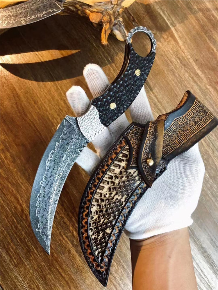 大马士革月形爪刀 总长:25cm 刃长:12.5cm 手柄:13cm 厚度:3.1MM 刃材:进口锻造大马士革钢(78层) 表面:沧桑石洗效果 硬度:60HRC 手柄:手工雕不规则钢头+黑檀木 皮套:意大利进口植鞣皮镶蛇制作
