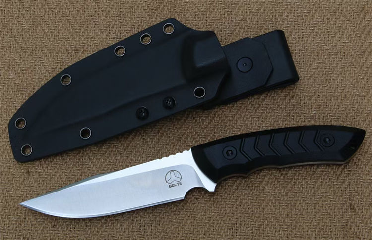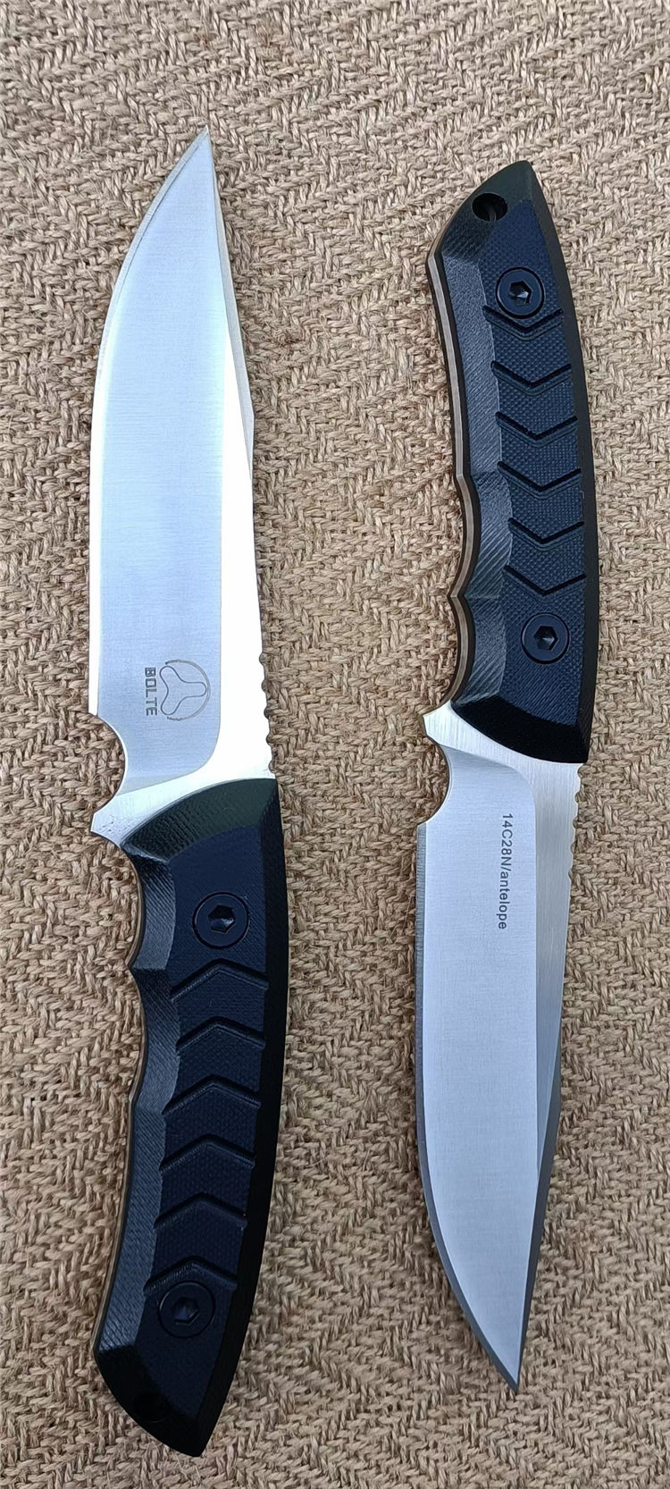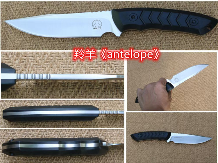 博尔特羚羊直刀 全长:242mm 刃长:110mm 刃宽:34mm 刃厚:4mm 刃面:V磨多面刃砂光,幼拉丝处理,刃线立体感超强 类型:以锋利度,切削度,韧性保持度最出色 开刃方式:二次开刃 刃材:山特维克14C28N钢,它的优点就是具有更好的防锈性和韧性,硬度高保持性优越 热处理:真空淬油热处理 硬度:60-61HRC 柄材:黑色G10 包装:精美纸盒+护刀油+伞绳 净重:220克 刀鞘:美版K鞘+360度旋转夹