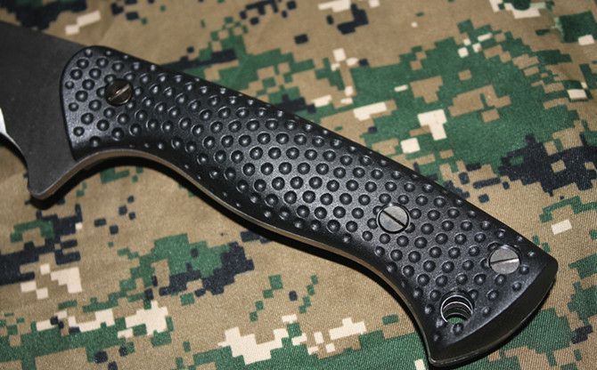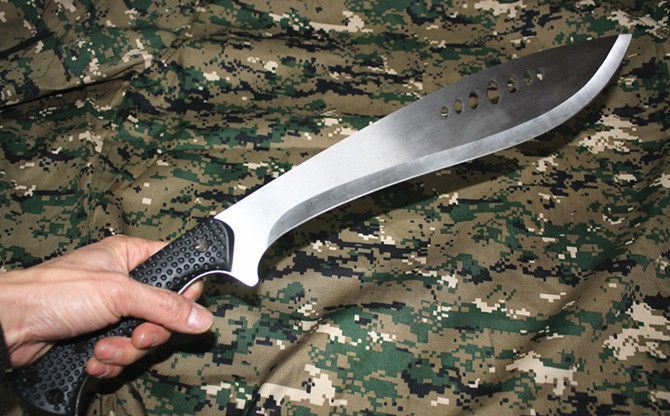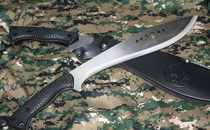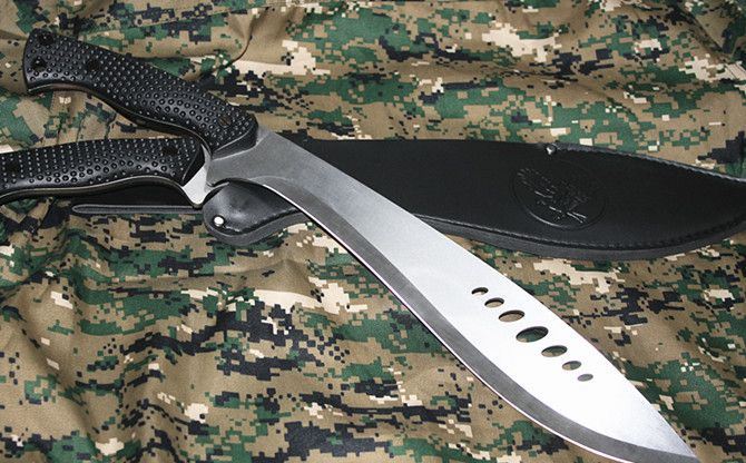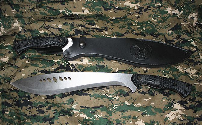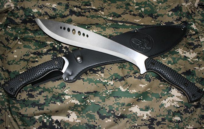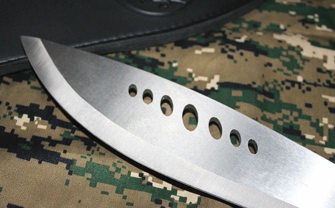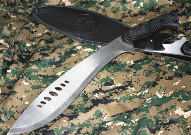 蜂窝柄116-1七眼刀(砂光) 全 长:495mm 刃 长:320mm 柄 长:163mm 刃 宽:61mm 刃 厚:3.1mm 刃 材:5Cr13Wov 重 量:760g(含刀套) 硬 度:56HRC 表 面:砂光 柄 材:ABS(塑胶) 锁 型:定锁 其 他:配尼龙套