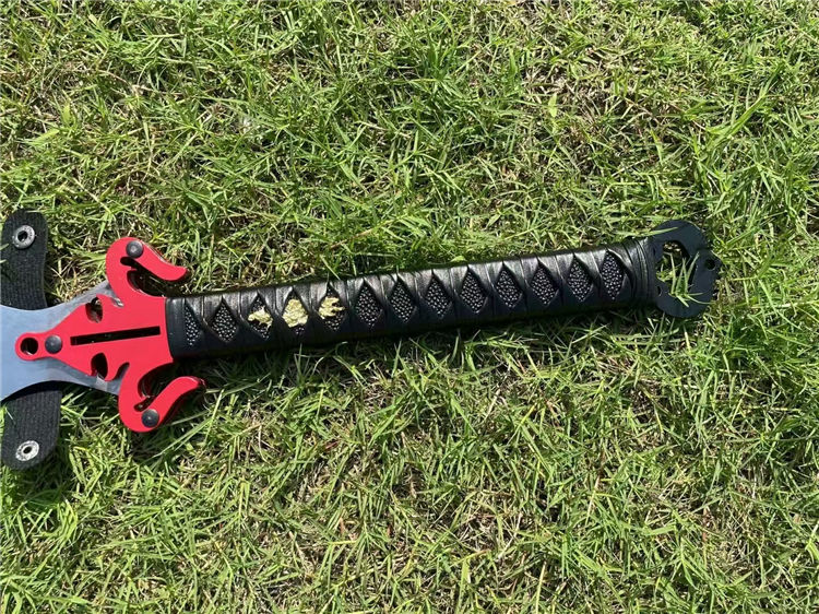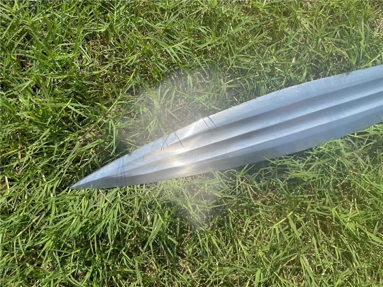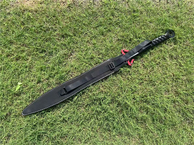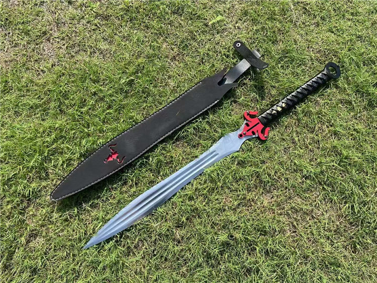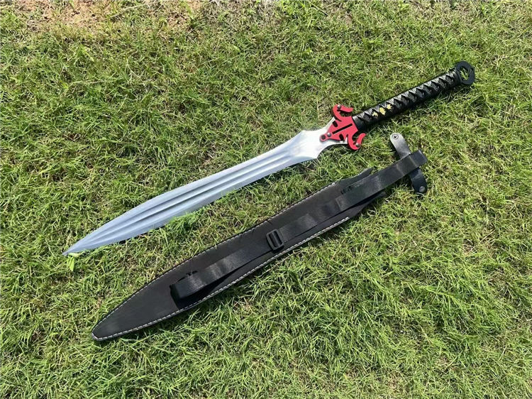 经热冷处理,硬度高达60,锋利到轻松过水瓶,轻松砍竹木等、经过手工多次打磨抛光,剑身开双大槽,柄绕防滑皮绳