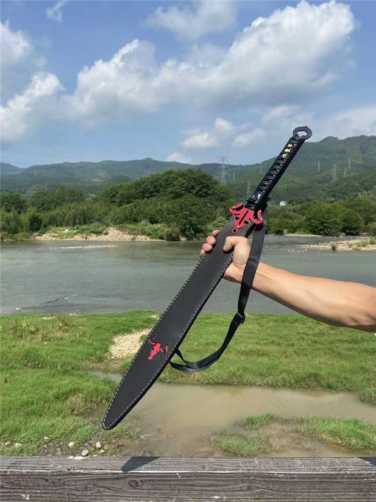 牛头酋长之剑 全长:82.5cm 刃长:48.5cm 柄长:26.5cm 刃宽:3.9-5..3cm 刃厚:0.5cm 材质:高锰钢一体锻打 经热冷处理,硬度高达60,锋利到轻松过水瓶,轻松砍竹木等、经过手工多次打磨抛光,剑身开双大槽,柄绕防滑皮绳 送PU皮套:锦盒