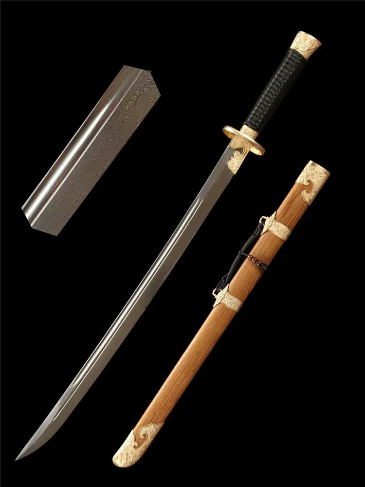 守仁雁翎刀 总长:98cm 刃长:72cm 柄长:20cm 刃宽:3.6cm 刃厚:0.7-0.5cm 刃材:十五道手工研磨 硬度:58 鞘材:花梨木 装具:铜装 总重:约1900克 净重:约1200克 刃身:一体锻打刀身 工艺:刃身手工锻造,经过打坯、热煅、铲、锉、研磨、粹火,回火、手工研磨等龙泉刀剑古法制造工序制作而成 性能:断水水瓶,草席或过竹子消纸 注:刀剑为纯手工产品存在误差,规格仅供参考