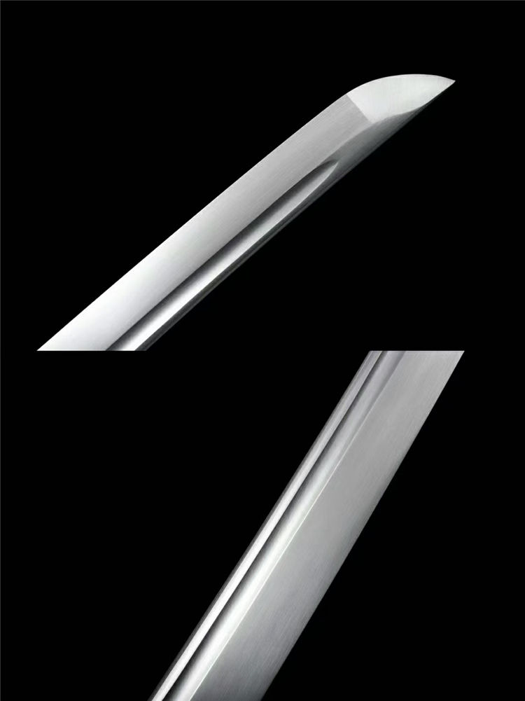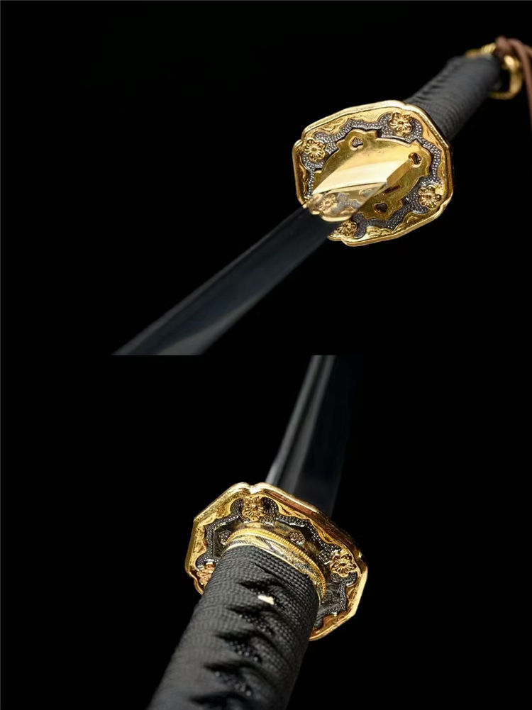 高性能锰钢淬火锻打手工镜面研磨,一体宽柄龙骨固定目钉。纯铜刀簇,双色仿金装具,仿珍珠鱼皮鲛肌,仿金菊纹目贯缠棉绳,香木鞘裹独家皮革