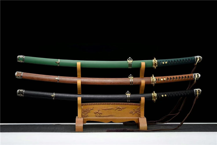 九八式军刀 全长:104cm 柄长:27cm 刃长:71cm 刃宽:3.1cm 刃厚:0.7cm 全重:1.35cm 除鞘:1.1千克 (棕款、绿款同价)赠高档锦盒 高性能锰钢淬火锻打手工镜面研磨,一体宽柄龙骨固定目钉。纯铜刀簇,双色仿金装具,仿珍珠鱼皮鲛肌,仿金菊纹目贯缠棉绳,香木鞘裹独家皮革