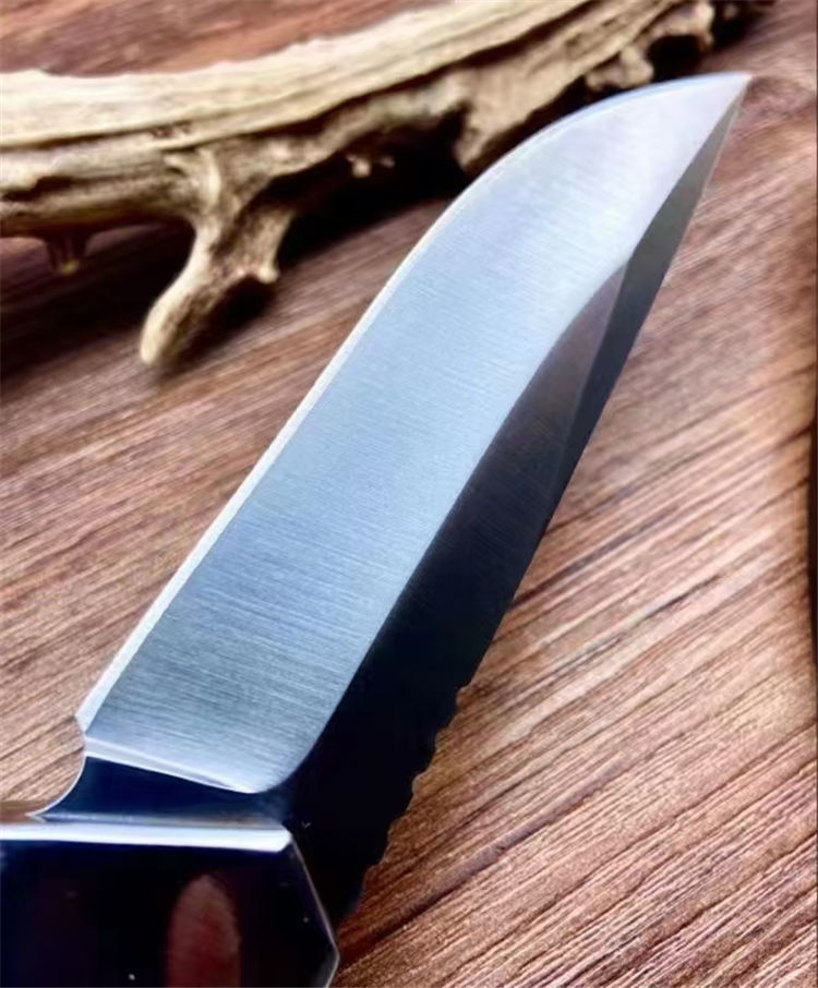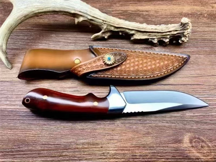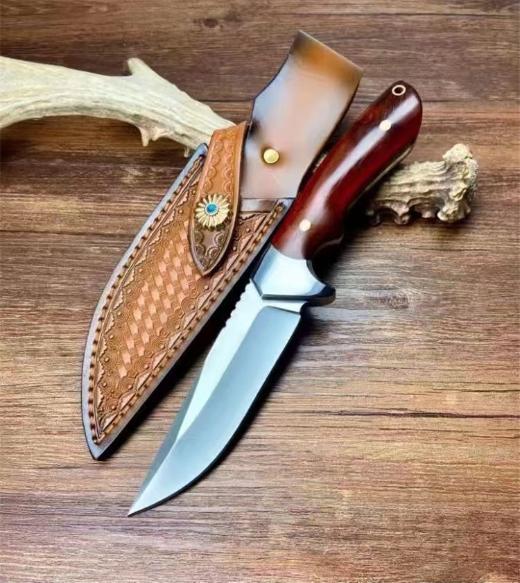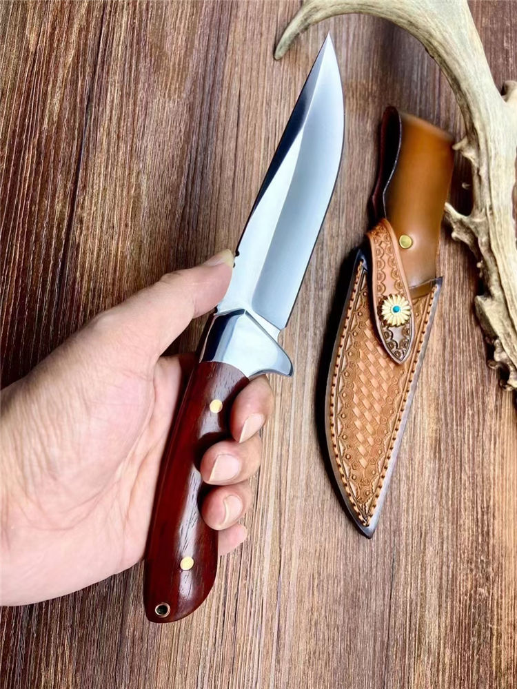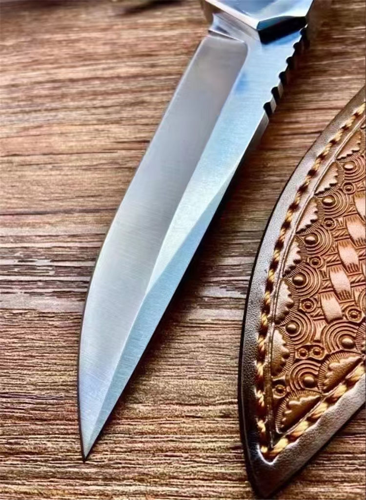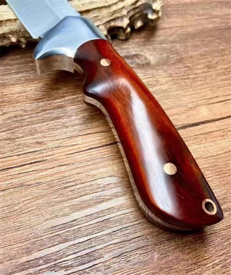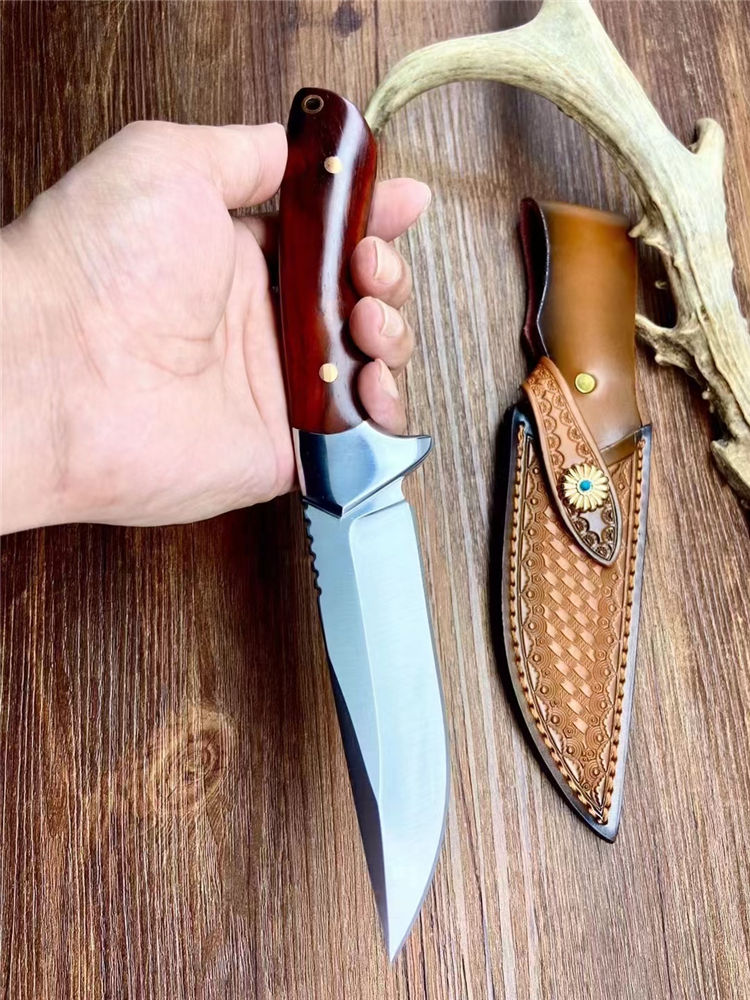 DC53战役直刀 总长:235mm 刃长:110mm 柄长:125mm 刃厚:5mm 开料:线切割开料 硬度:59-60RHC 处理方式:真空热处理 护手:加强 不锈钢护手 手柄:黄檀木材加铜管钉 刃材:DC53 手工打磨线条.立体感完美 刀套:手工皮雕花皮套 包装:精美合子