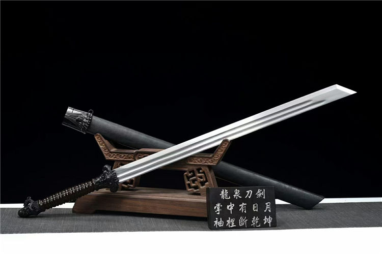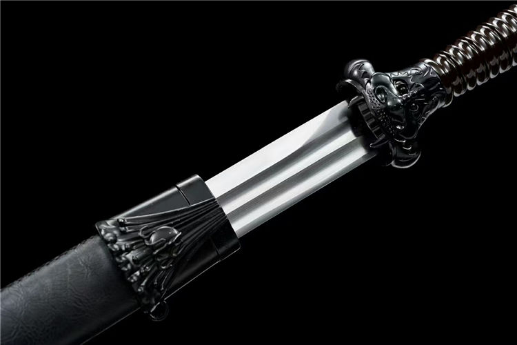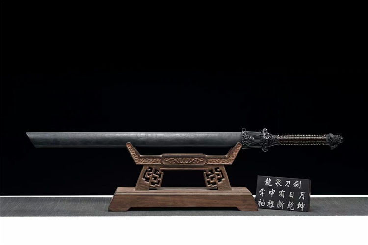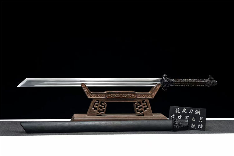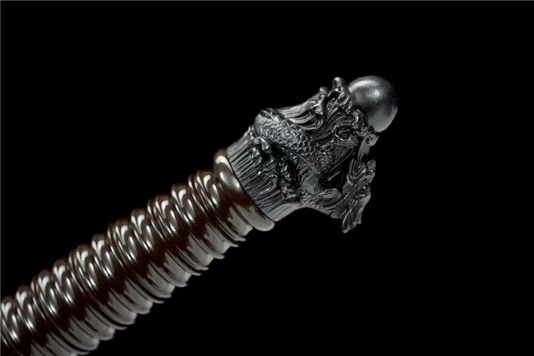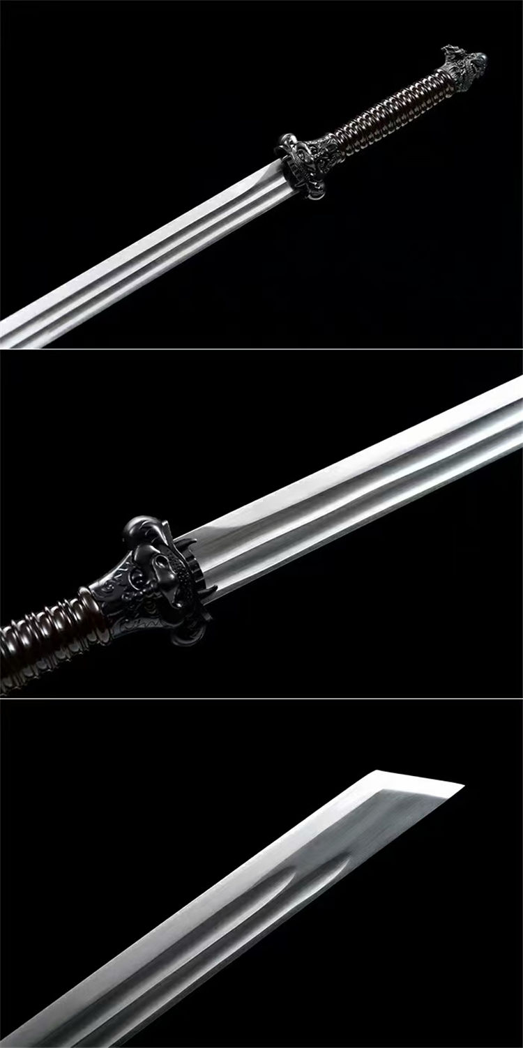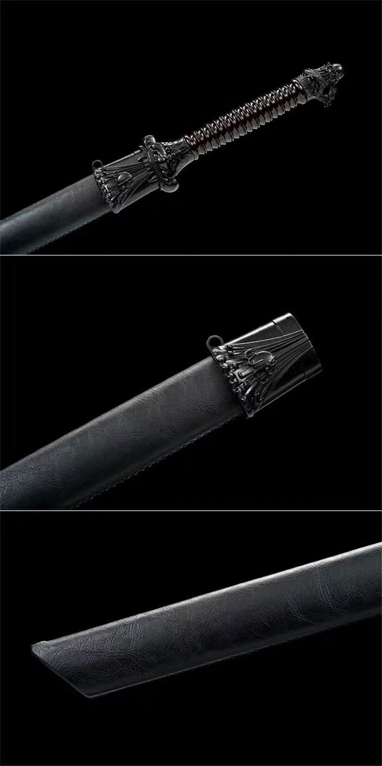 黑龙腾云斩刀 全长:89cm 刃长:61cm 刃宽:3.5cm 柄长:25cm 刃厚:0.7cm 重约:1.95kg 配件:黑色合金 刀鞘:皮革包实木 刃材:弹簧钢双大槽 手柄:金属烤漆