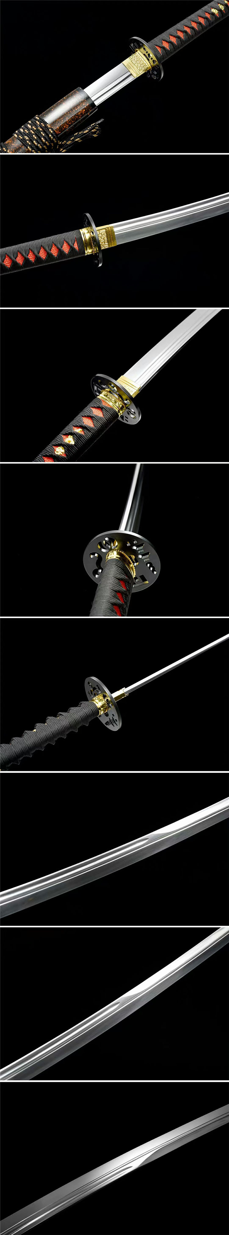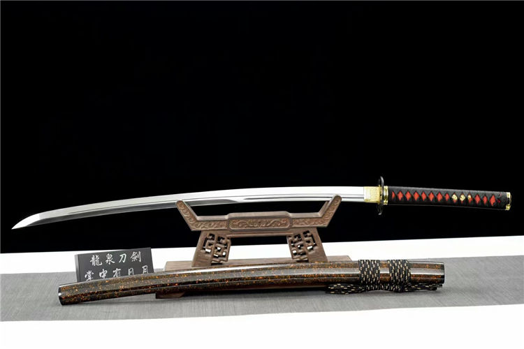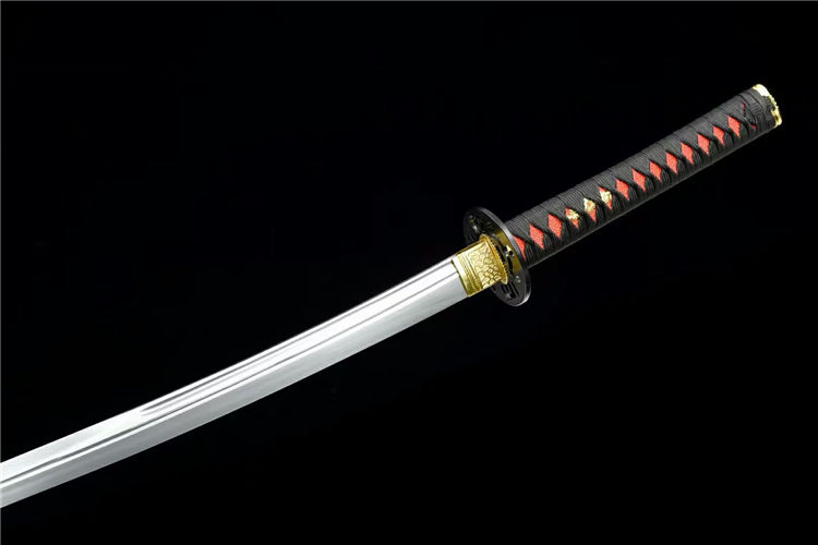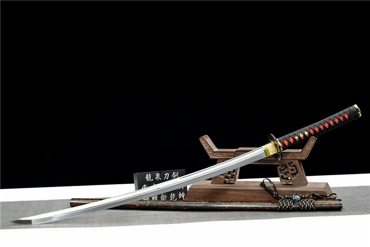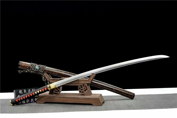 天纵云武士刀 全长:102cm 刃长:74cm 柄长:26.5cm 刃宽:3.2cm 刃厚:0.75cm 重约:1.2kg 刀鞘:实木油漆(镶嵌人工水晶栗形) 配件:合金+铁制护手 刃材:高性能铁轨钢手工锻制