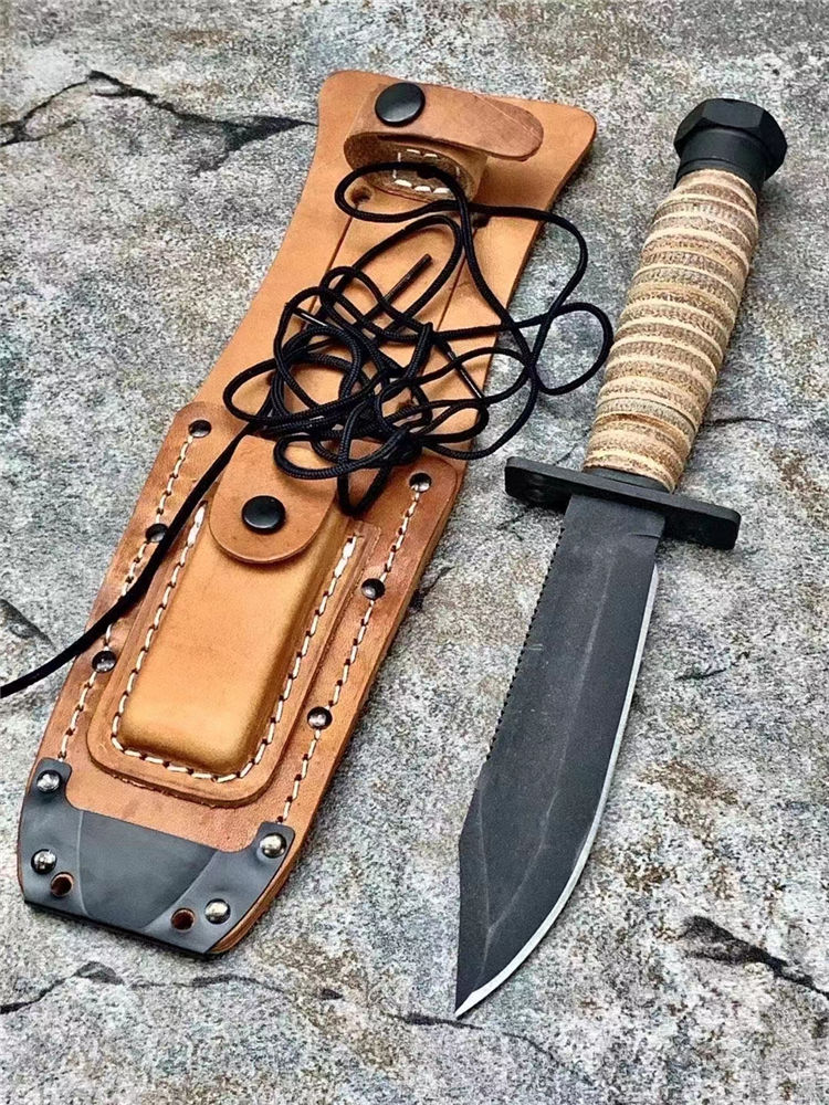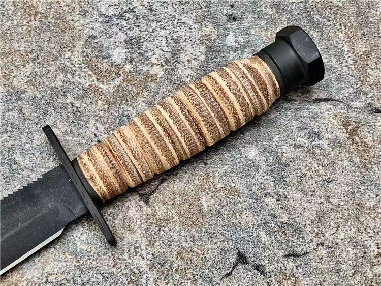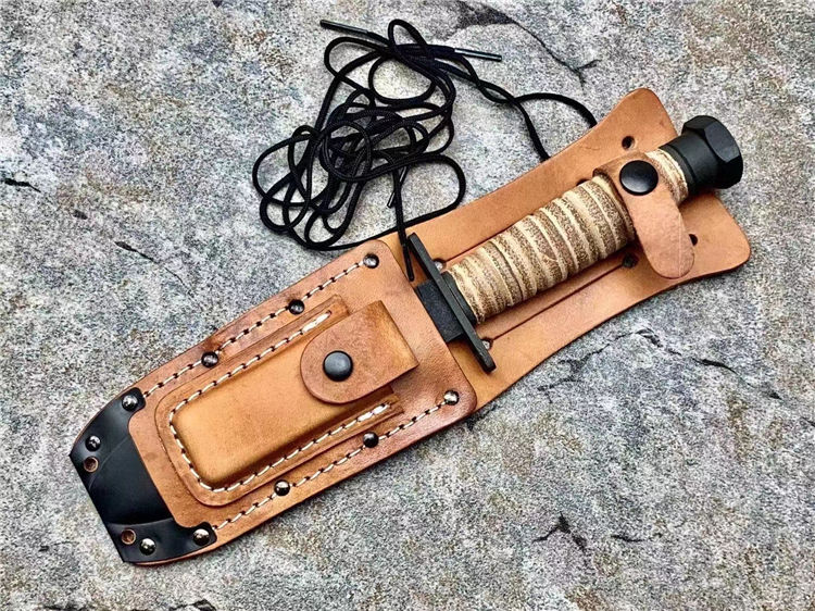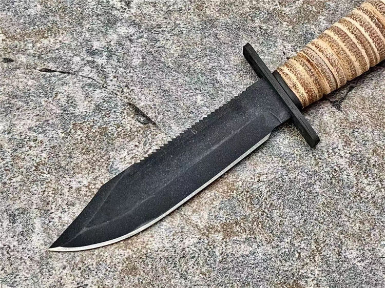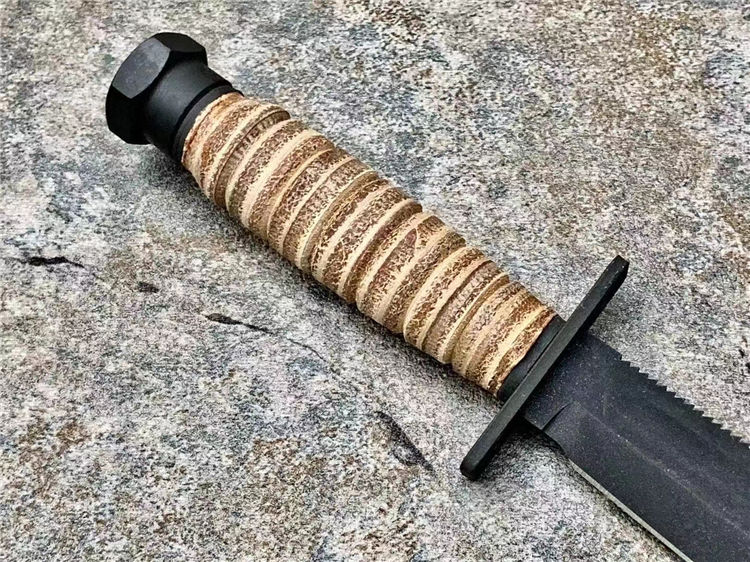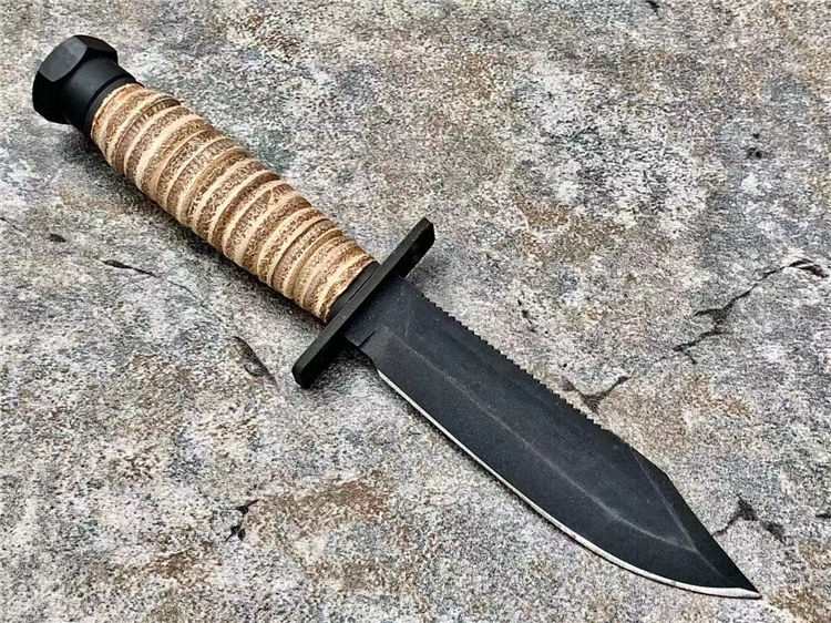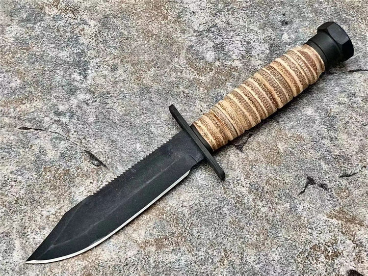 简称/4-9-9美飞经典款,飞行员等特种人员专门选择了一种生存刀,就像是最具美国特色的百年名刀Mark II 军刀一样,美飞499型号几乎再未改变过的设计保留至今,表面使用黑色磷化涂层处理,消除反光,耐腐蚀;手柄用天然牛皮环压处理,防水防滑,即便是不幸降落到海里,也不会被海水浸泡发胀。刀鞘使用的是天然皮革,内附有磨刀石,方便在野外随时保养刀具;刀鞘可以固定在 腰带上,刀鞘底部有系绳孔,可以固定在大腿上;而刀身背面设计有锯齿,可以提供强大的切割锯的能力,甚至可以锯开飞机蒙皮;在护手上段有两个圆孔,可以固定在长棍或者树枝上,作为矛来使用;这是典型的生存刀的用法。由于安大略是美国军刀的主要供应商,而美飞499是要提供给美军众多飞行员的,所在,生产数目巨大,考虑成本问题,外观做工不会像普通量产刀那样精致