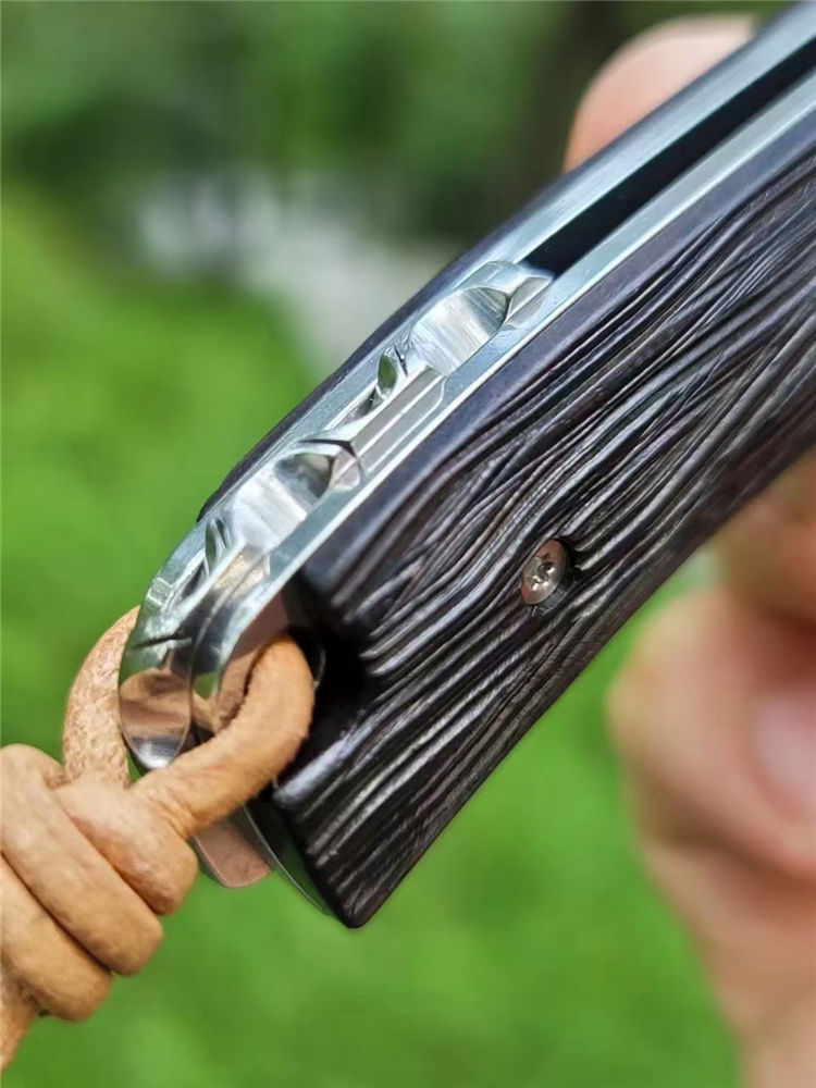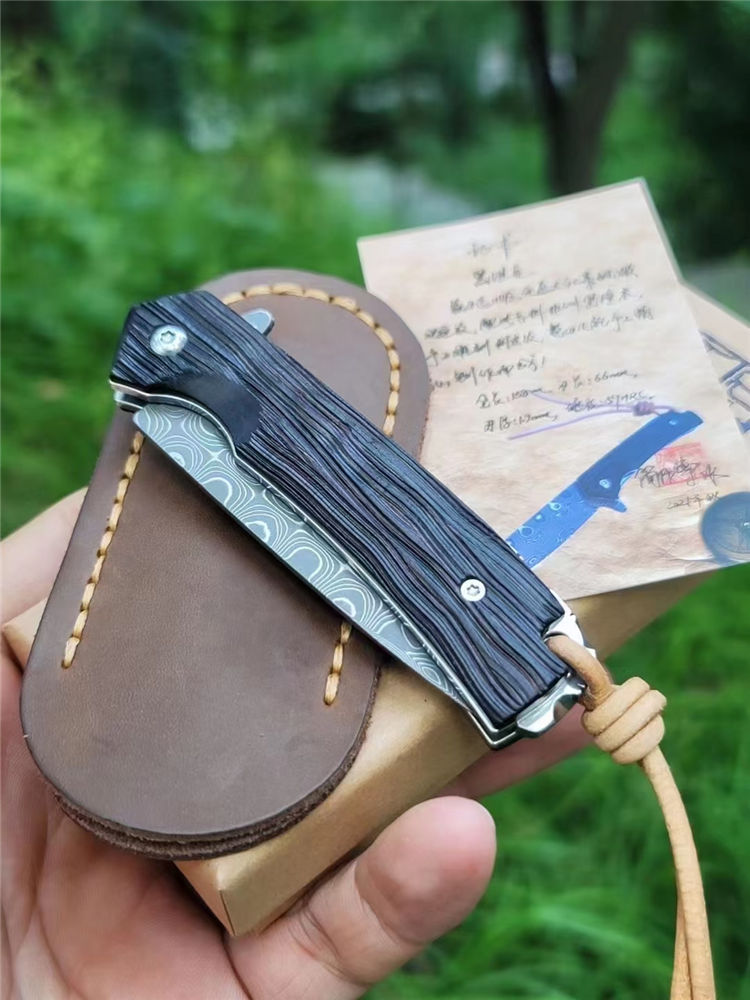 黑坦克延续了坦克系列的经典外形,刀刃升级110层回旋纹大马士革,花纹清新流畅,如石隙之间一缕清泉蜿蜒流淌,刀柄精选非洲老料黑檀木手工雕刻老树皮,再经多道打磨抛光,手感细腻温润。主轴镶嵌两片高精度滚珠轴承,一体快开设计。配头层牛皮手工缝制刀套,赠送简师傅亲笔防伪证书,复古礼盒包装。此款【黑坦克】造型经典,做工精细,是刀友日常使用、收藏把玩、馈赠好友之精品
