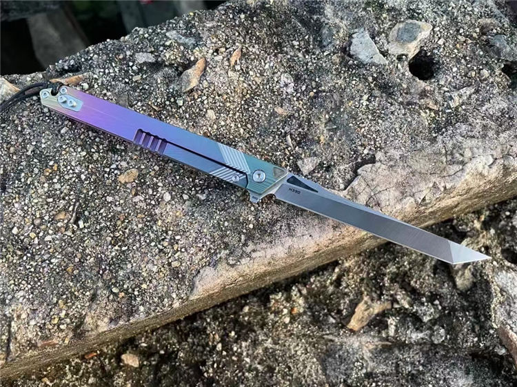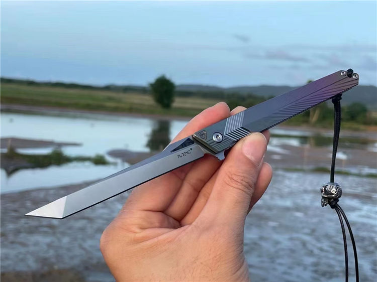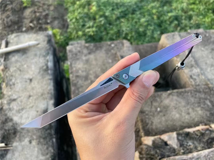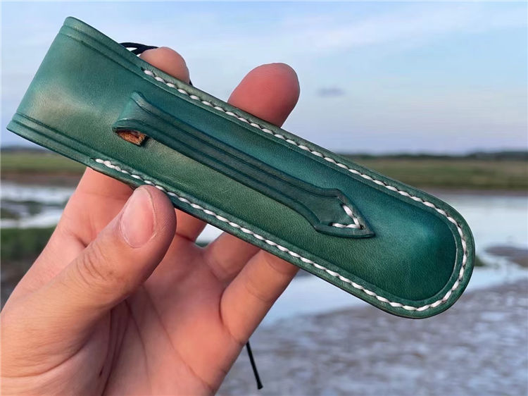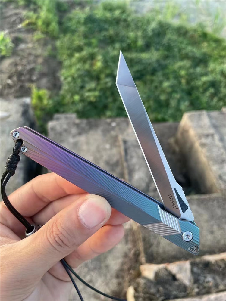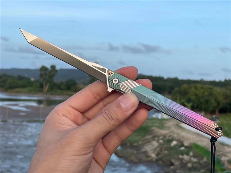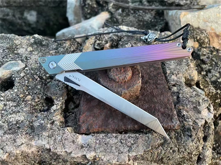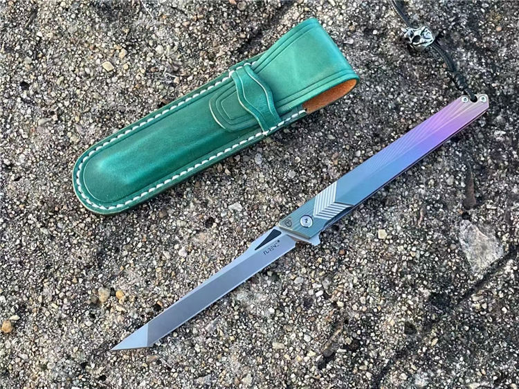 M390小武者二代折刀 总长:21.5CM 刃长:9.5CM 刃厚:2.5MM 刃宽:1.4CM 钢材:奥地利M390粉末钢 硬度:60-61HRC 热处理:真空深冷热处理,柄材TC4钛合金手工做色渐变,配骷髅头吊坠 皮套:纯手工意大利进口手工雕花皮套手工缝线植鞣皮 包装:手工盒子包装搭配进口意大利手工雕花缝线的植鞣皮套