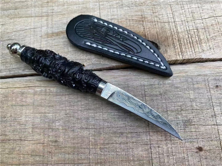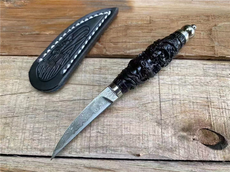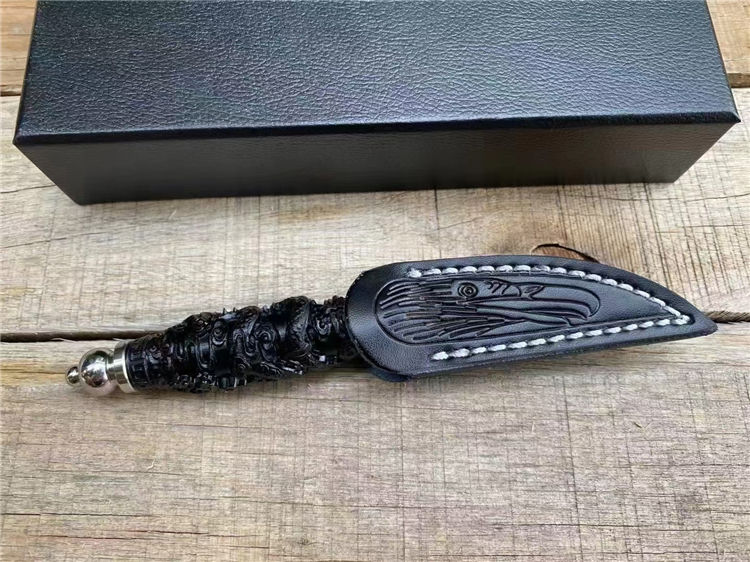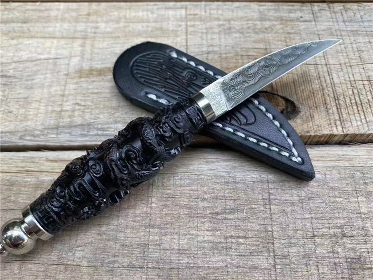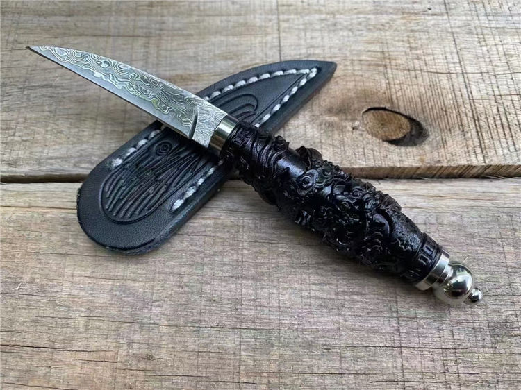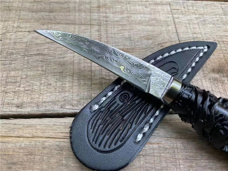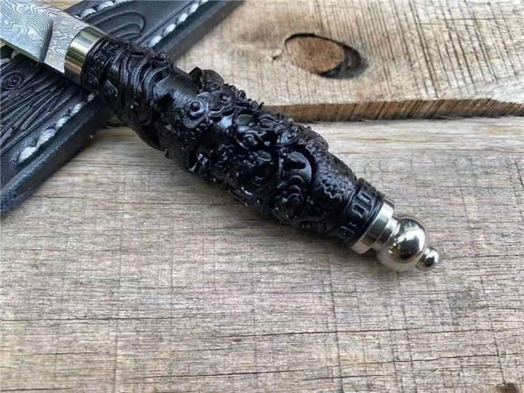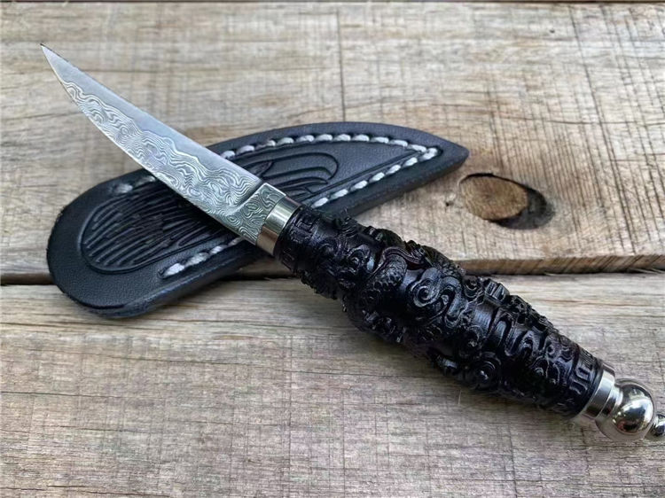 大马士革雕龙爪刀 总长:14.5cm 刃长:6.cm 刃厚:2.5mm 钢材:大马士革钢 硬度:59HRC 表面:大马士革原纹 柄材:精选檀木精雕龙 包装:高级礼品硬盒