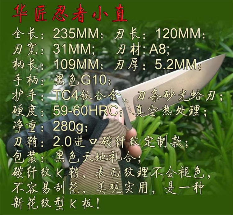 碳纤纹K鞘,表面纹理不会褪色,不容易刮花,美观实用,是一种新花纹型K板.忍者这个称谓正式使用是在日本江户时代,但忍者的历史可以追溯到更加久远的年代。据说在日本首次派遣"忍者"完成任务的是圣德太子。在当时,忍者普遍被称为"忍"(shinobi),同时各个时代各个地区对忍者也有其特有的称谓:如飞鸟时代称为"志能便(shinobi)",奈良时代称为"斥候",战国时代叫法很多,其中流传最广是"乱波",由武田信玄命名,而江户时代使用的就是和今天一样的"忍者"。江户时代是忍者这一名称正式确立的时期,同时也是日本在德川家族统治下和平时期的开始,这导致忍者失去了活动的舞台,作用越来越小,终至于淡出人们的视野。许多忍术也因而失传。关于忍者活动的最后记载,是1637年的"岛原之乱",忍者作为幕府的部下参与了这场战斗。忍者的工作,主要是为主君进行秘策、破坏、暗杀、收集敌方前线情报。忍者在特定时期有特定的含义,我们在和平年代赋于它应该是“隐者”对生活忍忍,对烦心事忍忍,对冲突忍忍,退一步海阔天空。大丈夫能屈能伸.忍者是工具,是生活器具,削枝生火,锤钓渔乐。宰鱼切肉切菜……