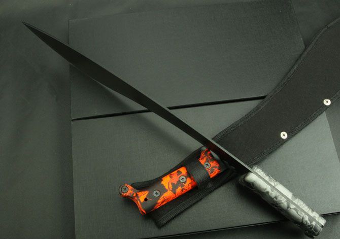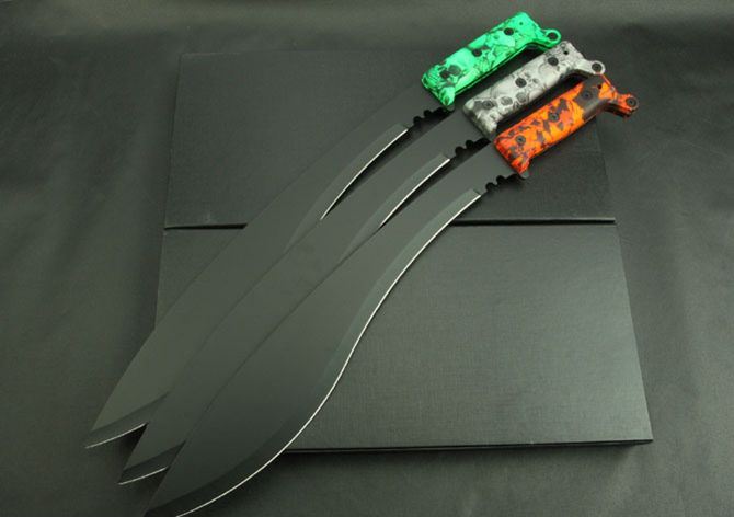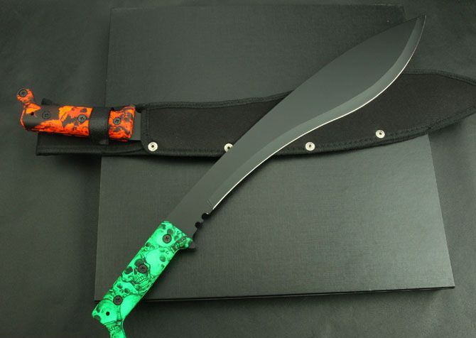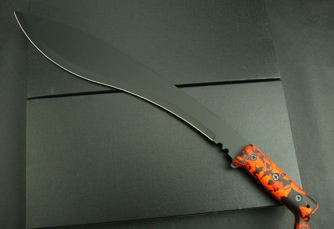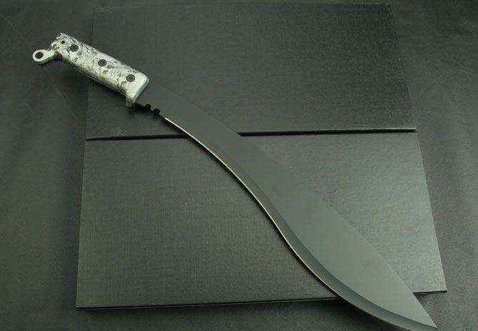 卡巴—鬼头野营刀三色柄(灰色、蓝色、棕色) 全 长:540mm 刃 长:370mm 柄 长:135mm 刃 宽:67mm 刃 厚:3mm 刃 材:3Cr13Mov 重 量:370g(含包装) 硬 度:56HRC 表 面: 氧化黑 柄 材:ABS彼履 锁 型:定锁 其 他:尼龙套