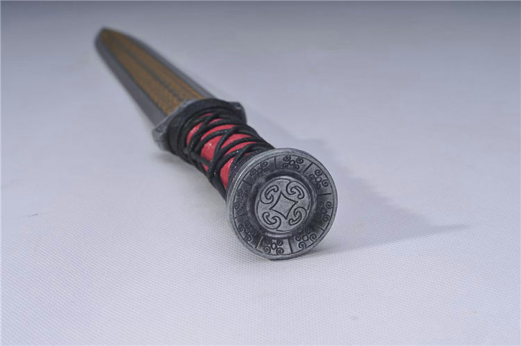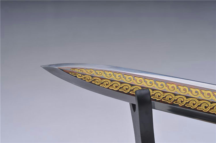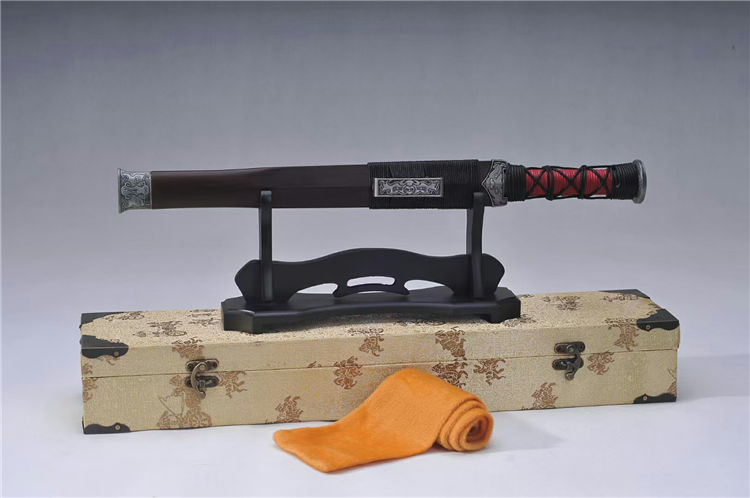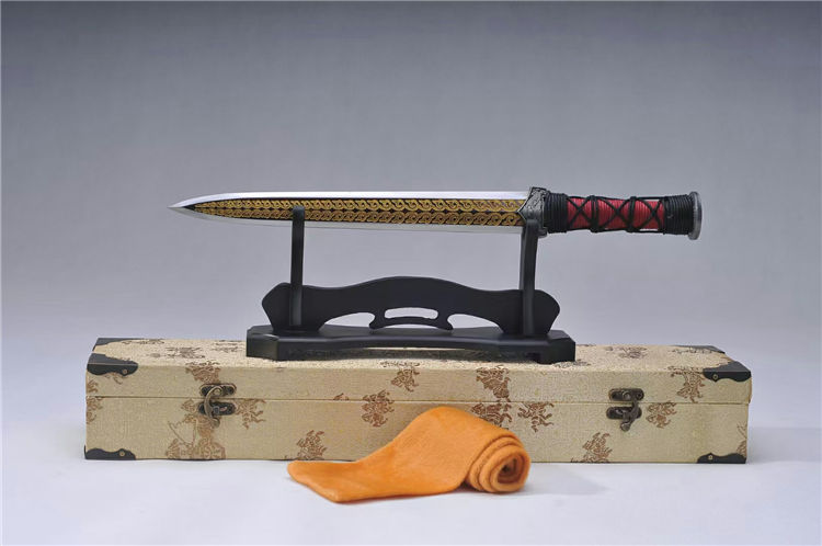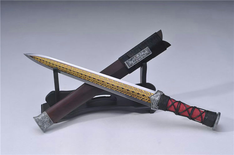 鎏铜赤壁小汉剑 全长:48cm 刃长:30cm 刃宽:3.4cm 花纹钢手磨鎏铜雕刻花纹剑条,酸枝木鞘,青古合金装,手工缠绳 配备:剑架,剑袋,锦盒,保养油