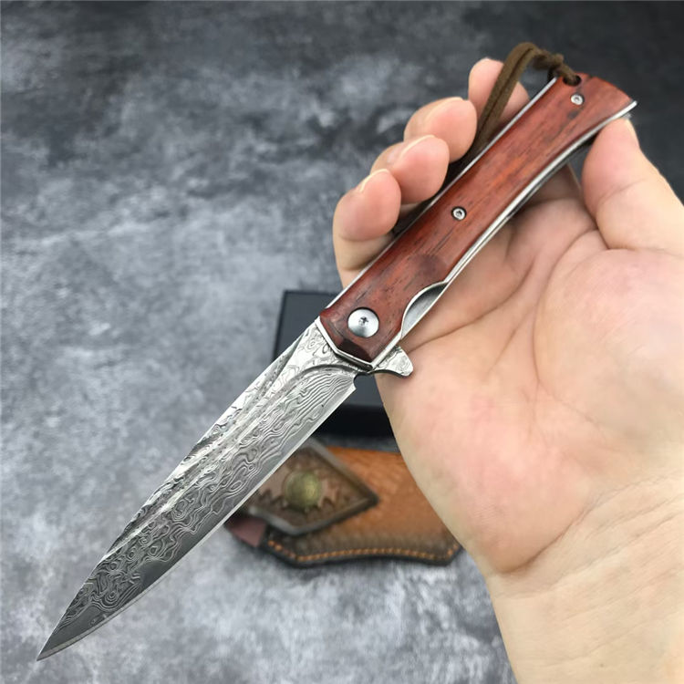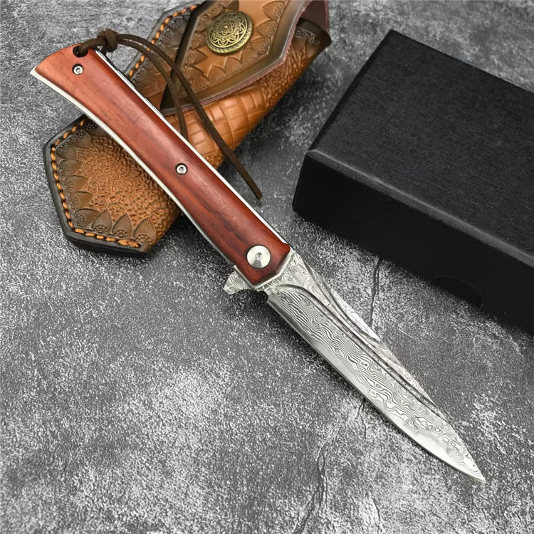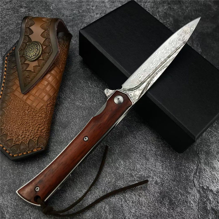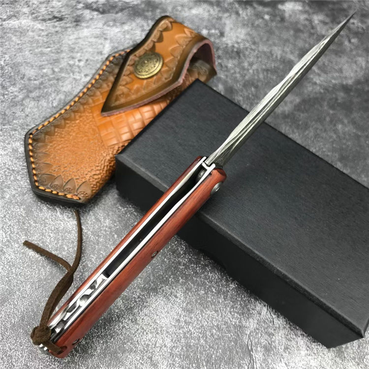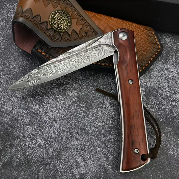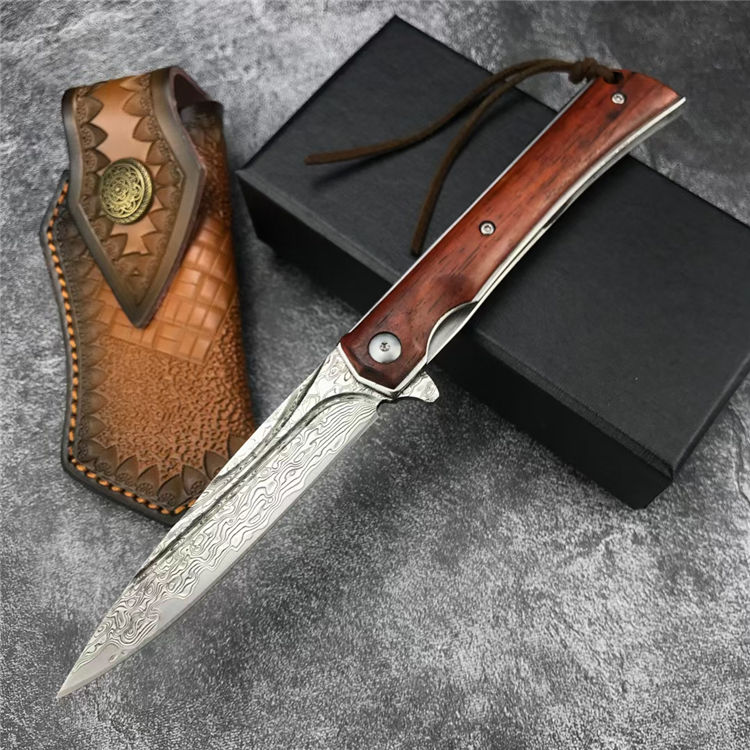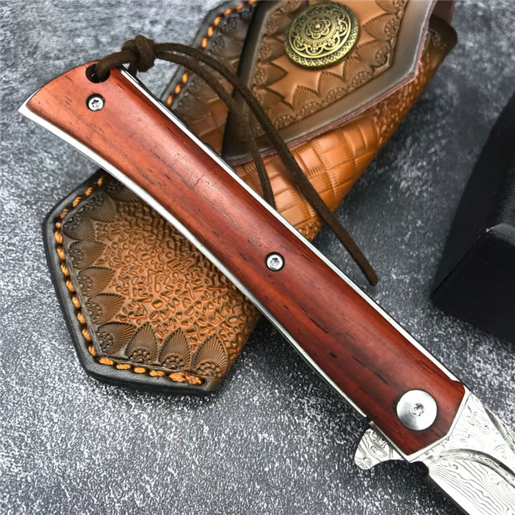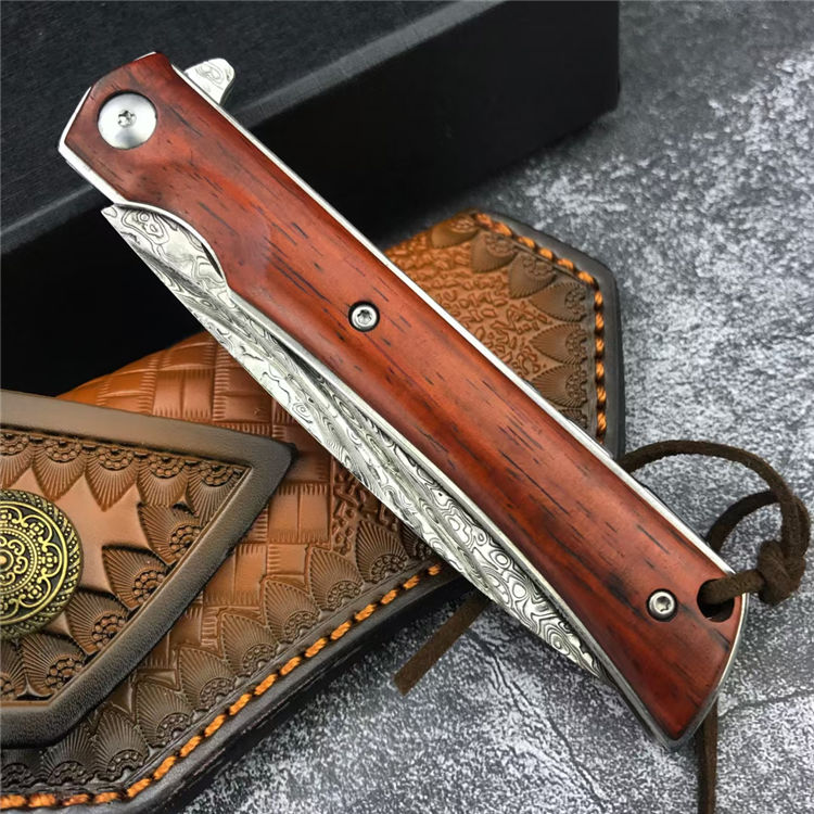 大马士革战旗折刀 全长:21.2CM 刃长:9.7CM 刃宽:2CM 刃材:大马士革钢 硬度:59 刃厚:2.5MM 柄长:11.5CM 柄材:红酸枝木 重量:210G 刀鞘:小牛皮雕花皮鞘