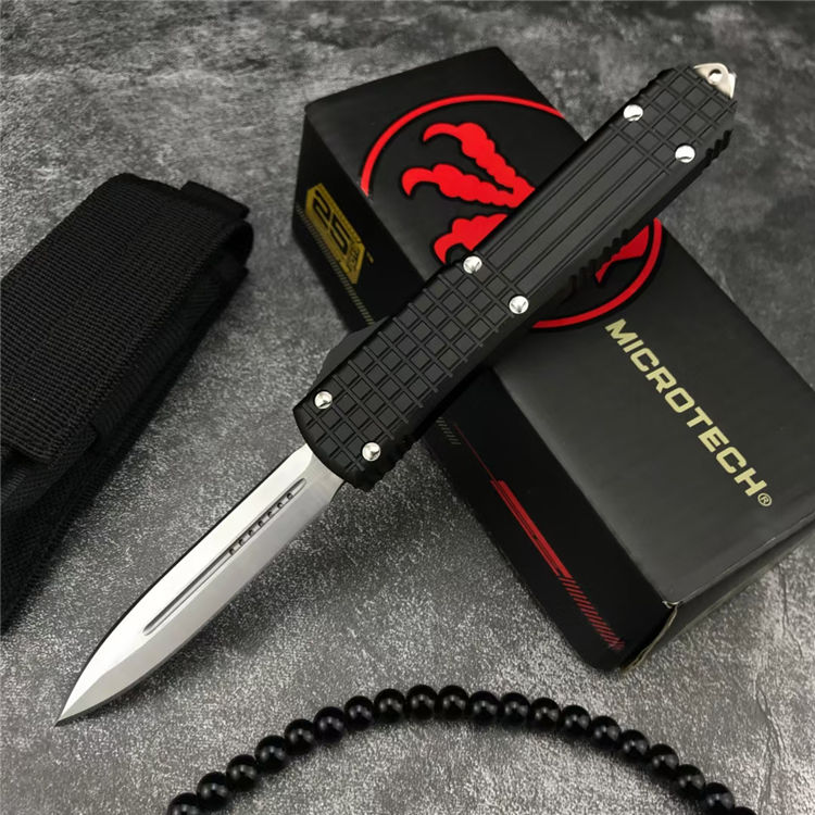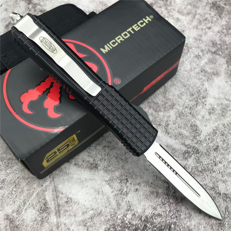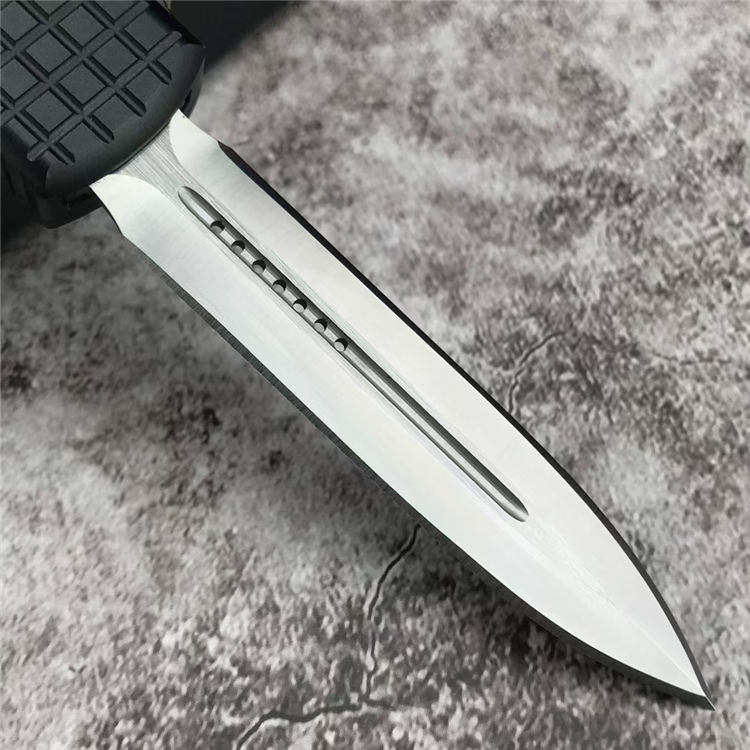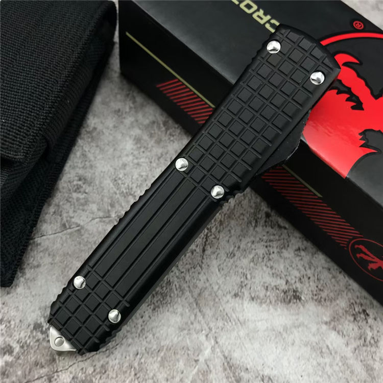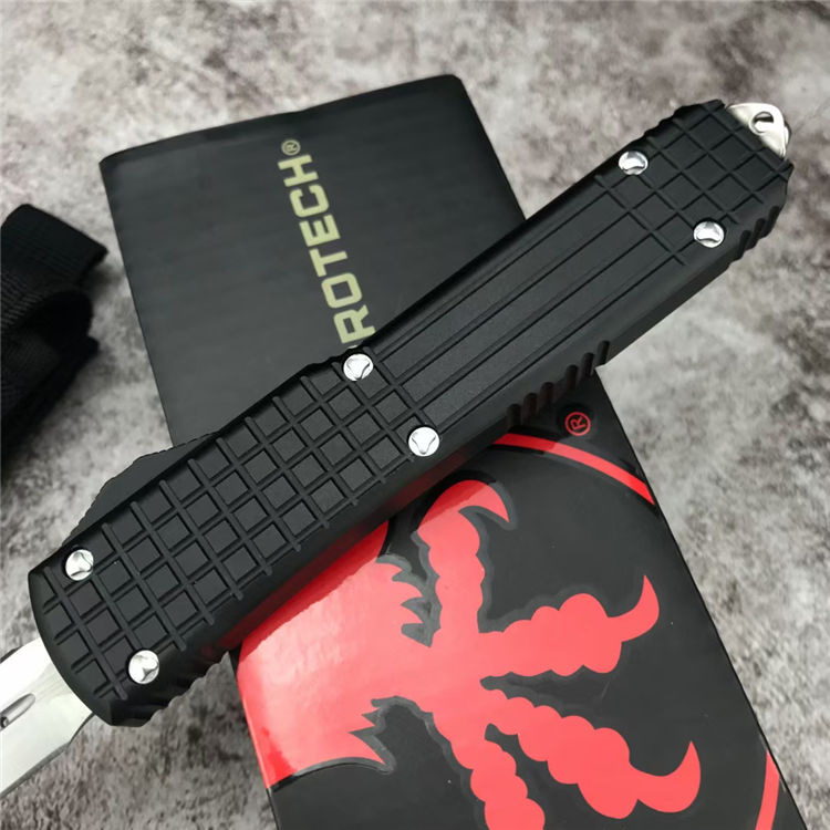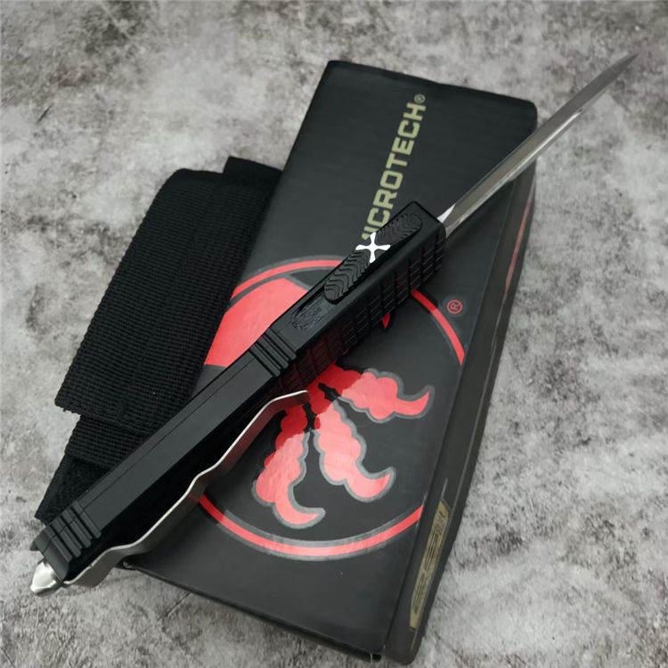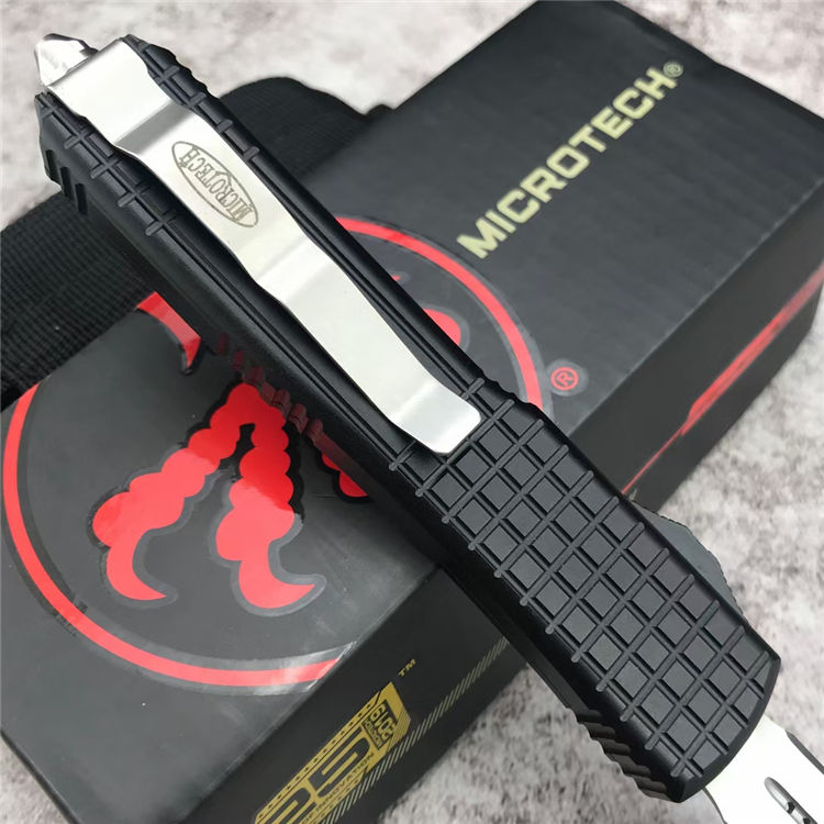 微技术海狼直出跳刀 总长:21.5CM 刃材:D2 刃长:8.5CM 刃宽:1.6CM 刃厚:0.3CM 柄材:铝合金(方格防滑纹) 重量:174g 附件:尼龙布袋,说明书,彩盒整刀用,CNC,电脑锣,线切割制作而成