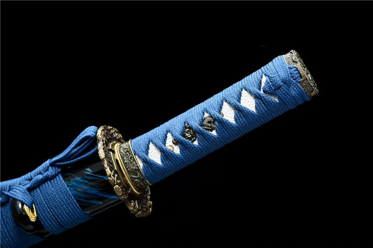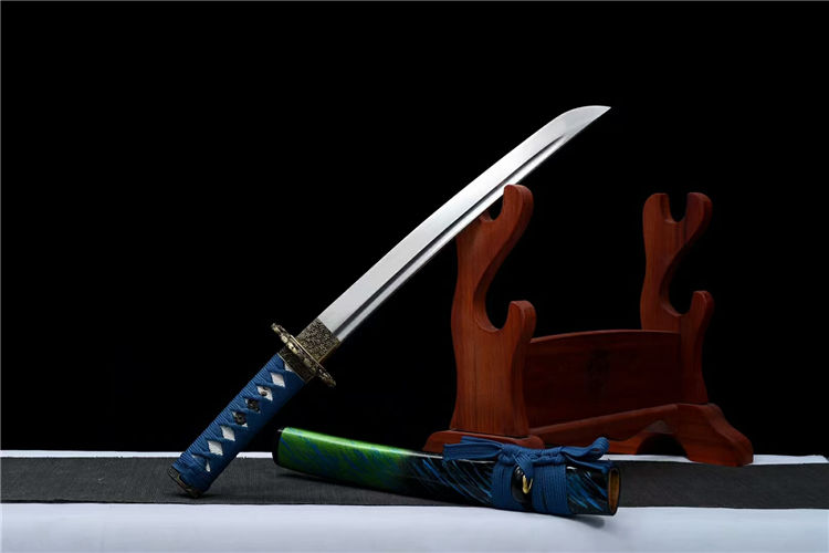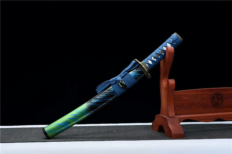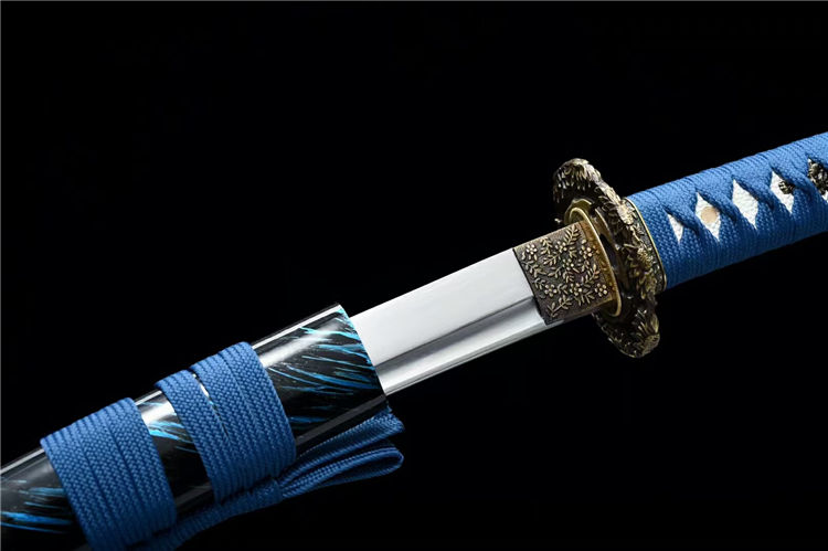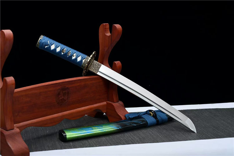 落羽武士刀 全长:55cm 刃长:33cm 柄长:17cm 刃宽:3.2cm 刃厚:0.6cm 材质:锰钢 重量:0.7KG 装具:锌合金刀镡。实木大漆鞘 配高端锦盒、
