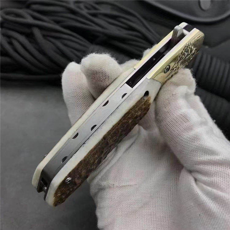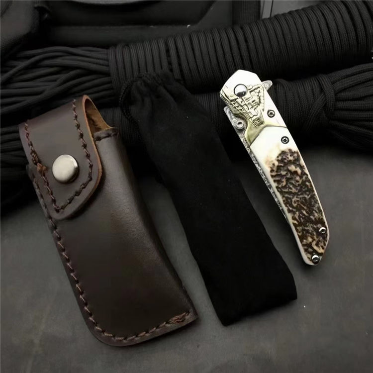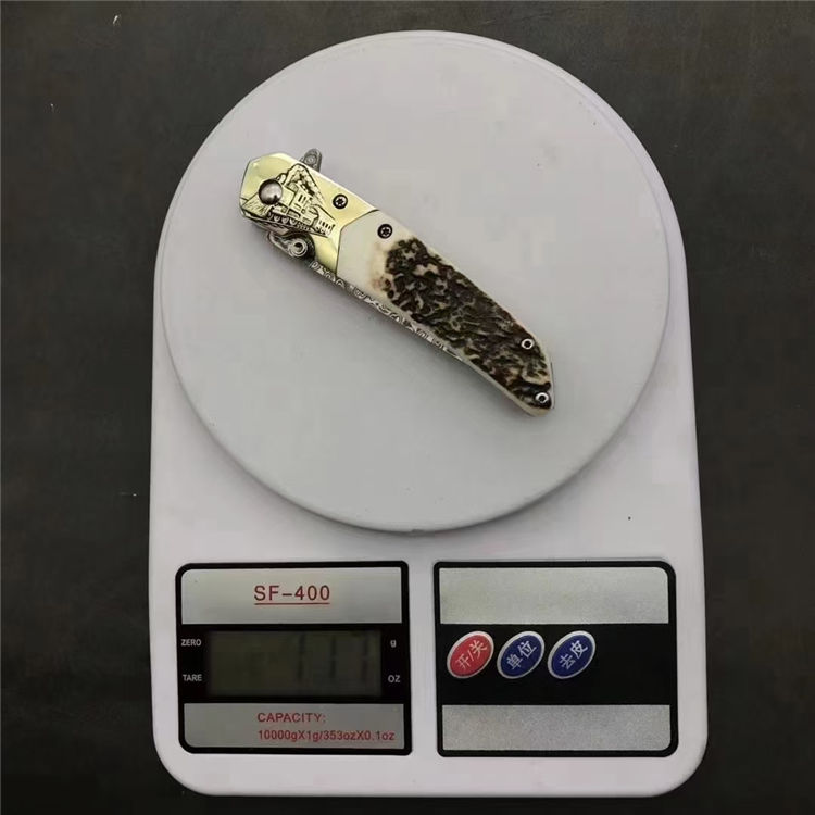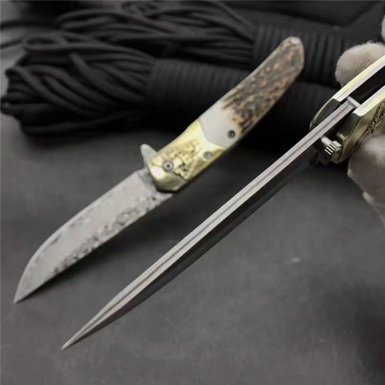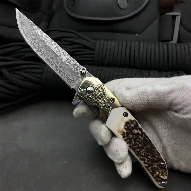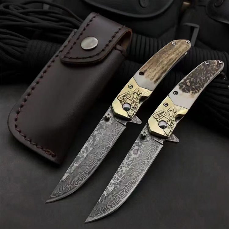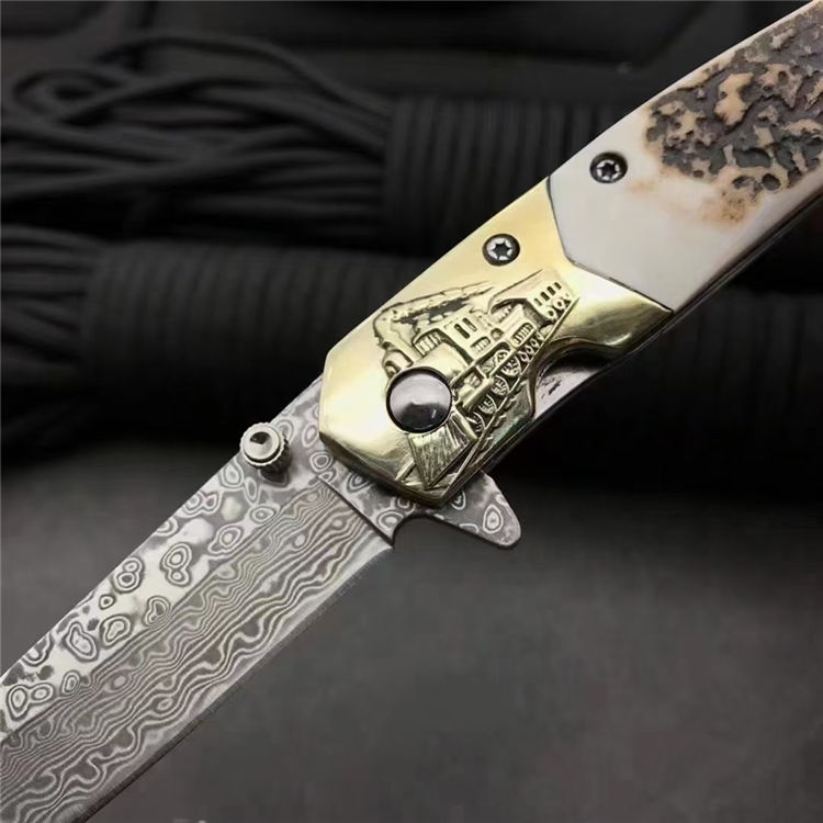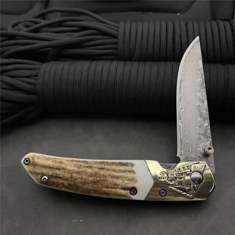 大马士革动力火车轴承折刀 总长:19cm 刀刃:8cm 折合:11cm 刃材:大马士革钢 硬度:59-60HRC 刃材厚度:2.7MM 柄材:白铜+鹿角 包装:银色小盒+黑色小礼袋