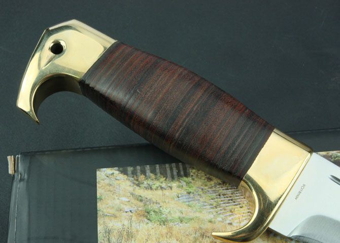 全 长:390mm 刃 长:230mm 柄 长:140mm 刃 宽:48mm 刃 厚:5.0mm 刃 材:9Cr18Mov 重 量:890g(含包装) 硬 度:58-60HRC 表 面:砂光 柄 材:双铜头+皮柄 锁 型:定锁 其 他:配牛皮套和原厂彩盒