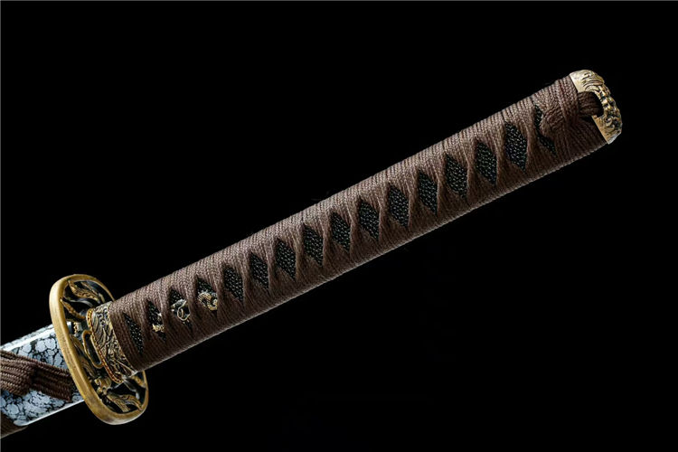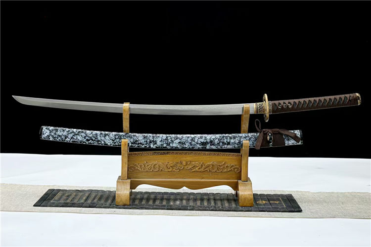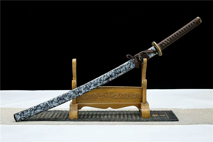 墨石武士刀 全长:103cm 柄长:24cm 刃长:73cm 刃厚:3cm 总重:1.4kg,标准重心 刃材:花纹钢折叠锻打 工艺:实木鞘外表汽车漆 装具:全铜装具 适于:收藏,送礼,防身,摆设等