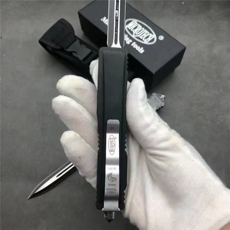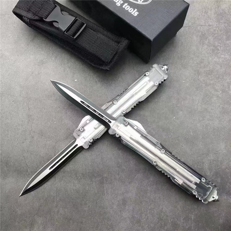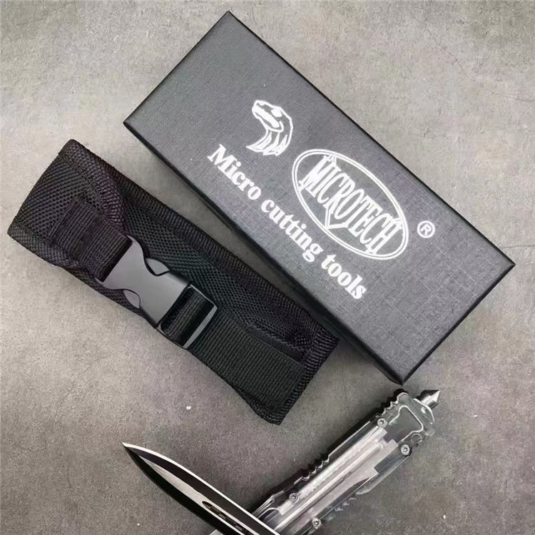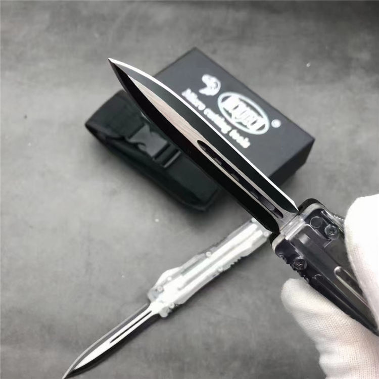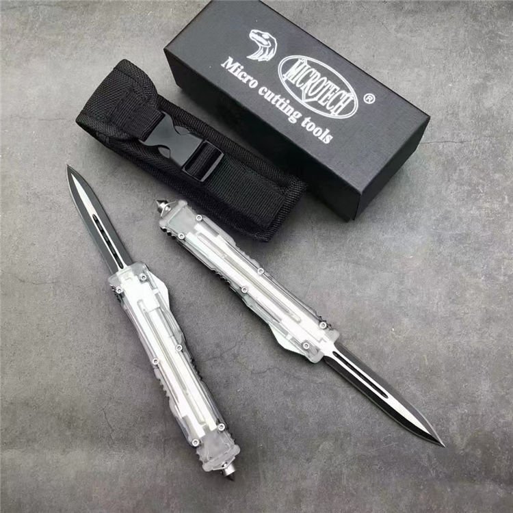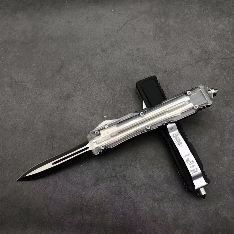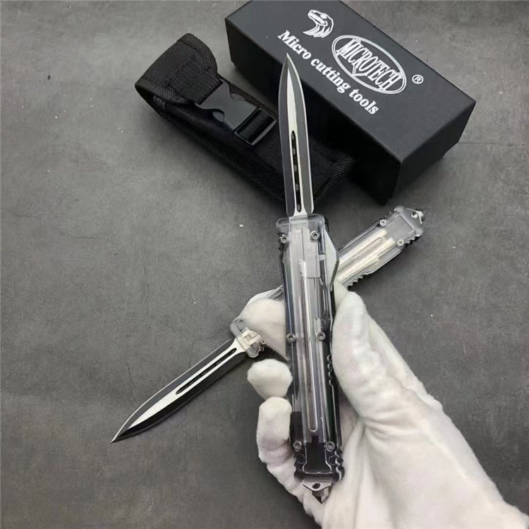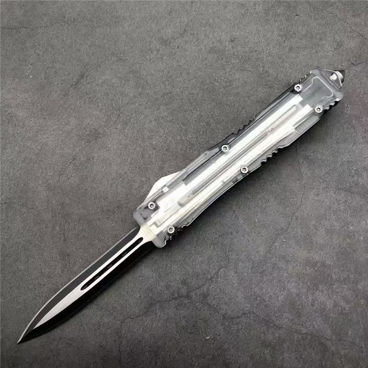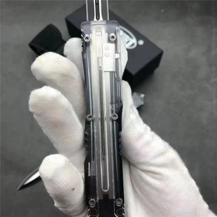 微技术透明弹簧跳刀 总长:18.5cm 刃长:7.5cm 手柄:11cm 厚度:0.3cm 刃宽:2cm 表面:灰钛 刃材:440c 热处理:真空深冷热处理 硬度:59HRC 柄材:铝合金+亚克力 开合:双动作,直推开关,自动弹出和收回(刀头比较牢固,只有很轻微的摇动) 包装:专用战术尼龙套+精品盒子