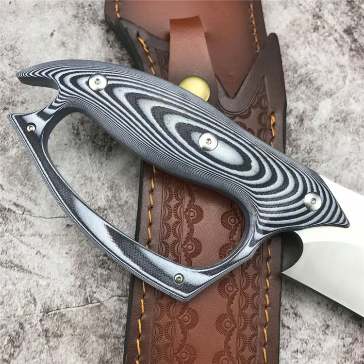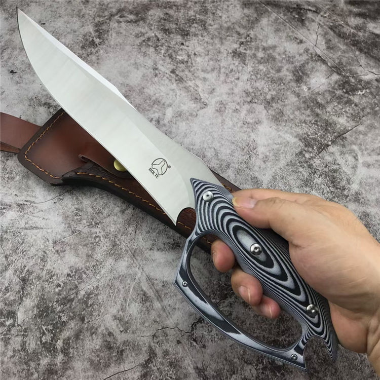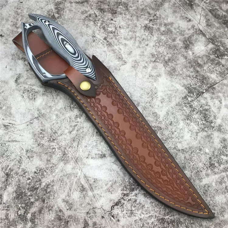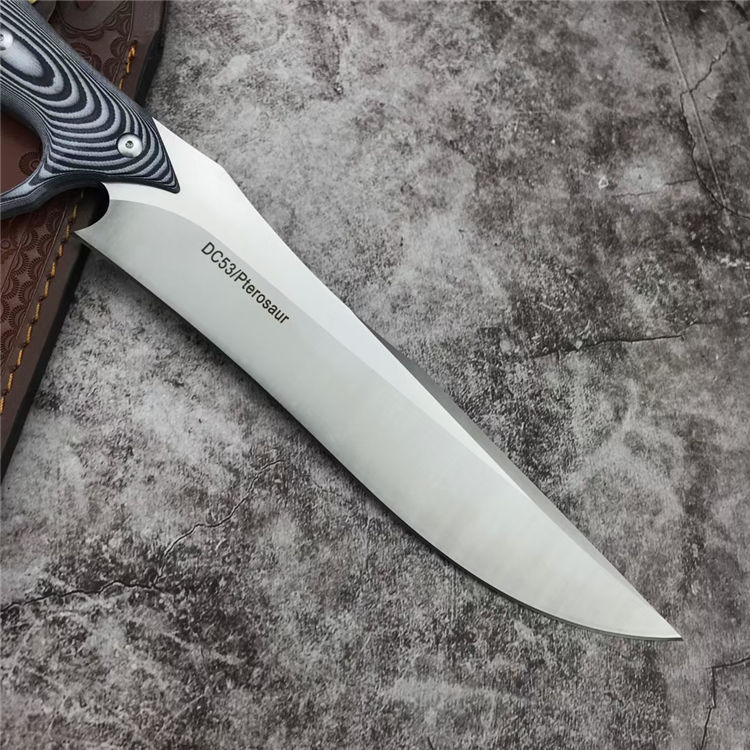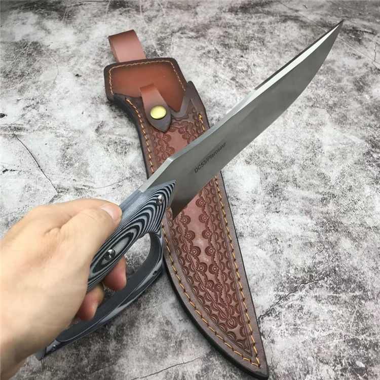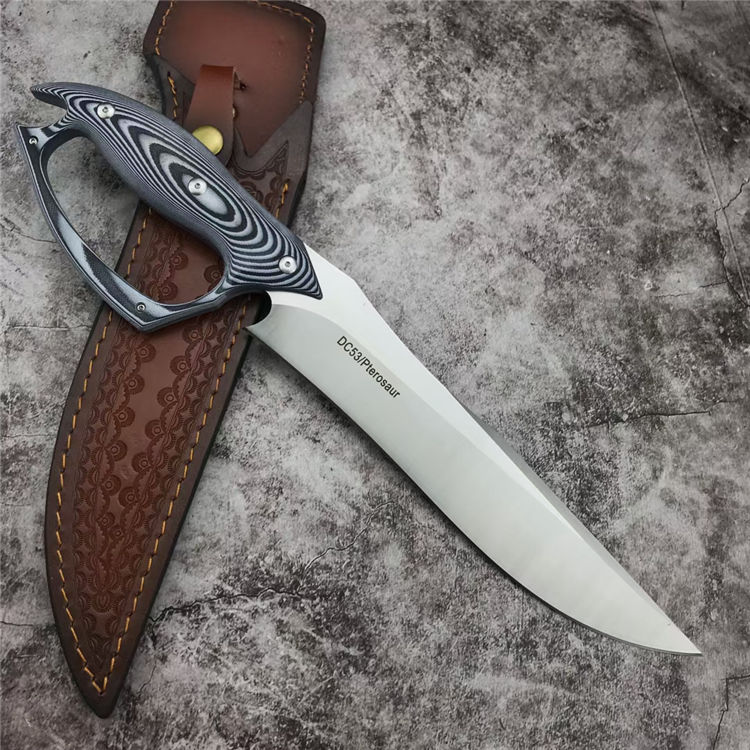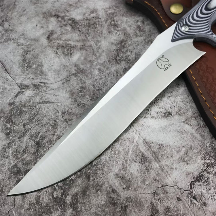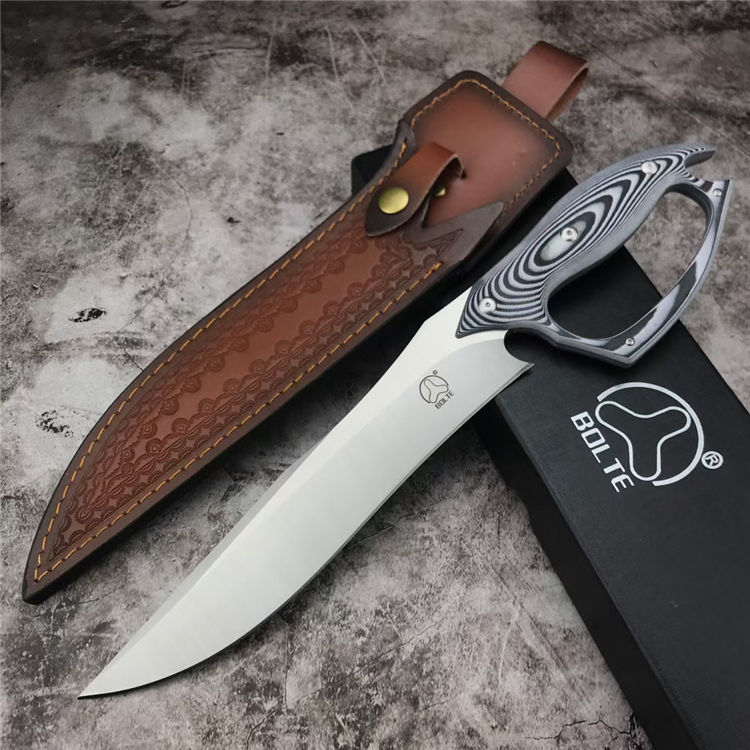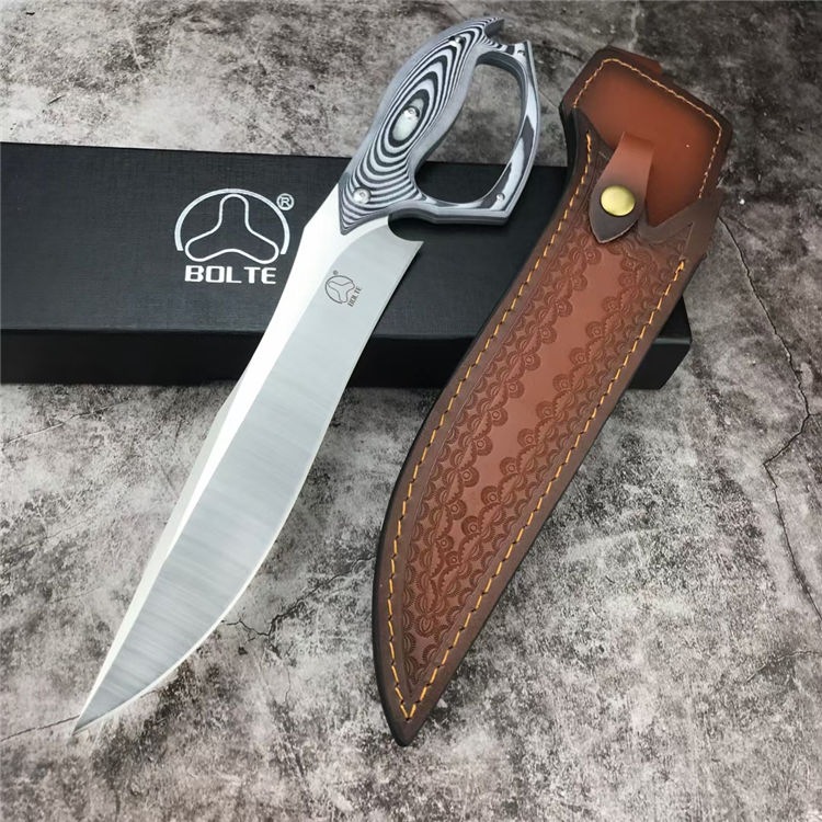 博尔特皮套款翼龙直刀 全长:37CM 刃长:21.8CM 刃宽:4CM 刃材:5CR13MOV 刃厚:5.5MM 柄长:15.2CM 柄材:双色G10 鞘材:牛皮雕花皮鞘 重量:456G 重量:772G(含盒子刀鞘)