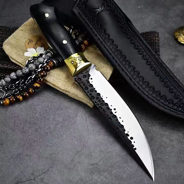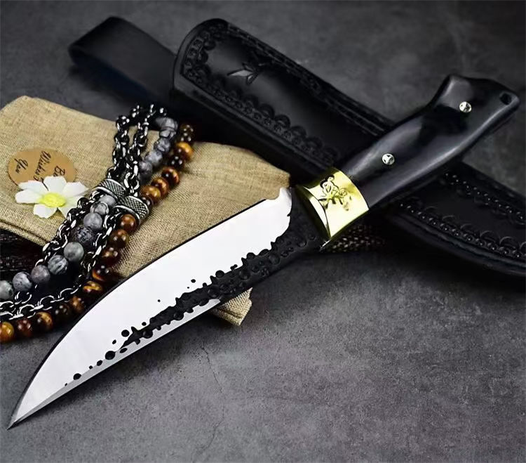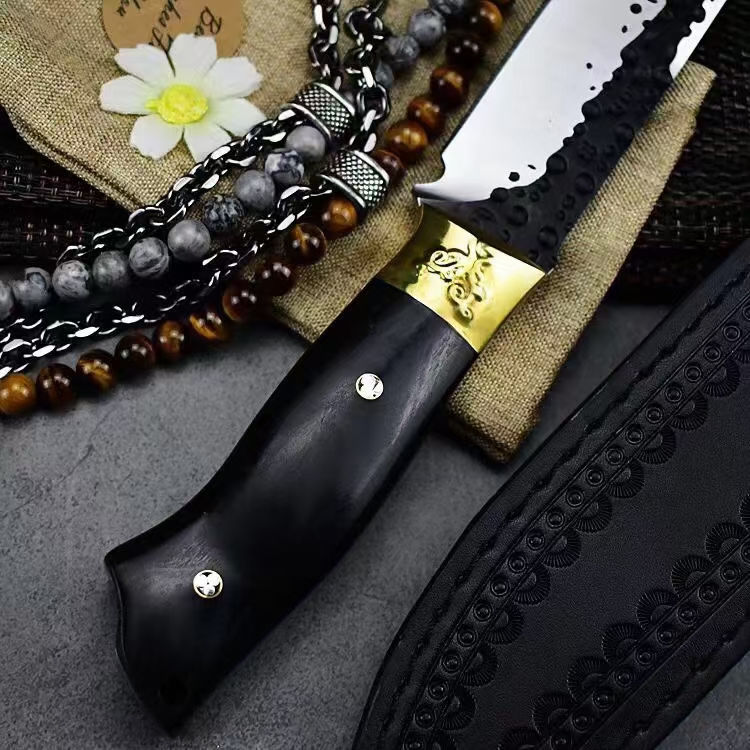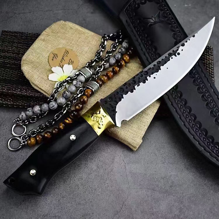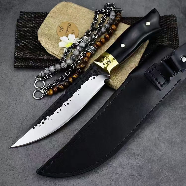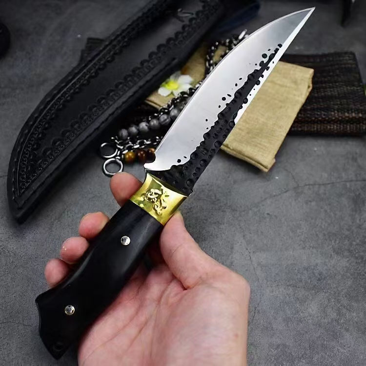 黑武者影刃直刀 全长:26.8CM 刃长:14.5CM 柄长:11.8CM 刃厚:5MM 柄材:铜头+黑彩木 刃材:9CR18MOV马氏体不锈钢 表面:表面煅打,数控磨 皮套:雕花皮套 重量:约302克