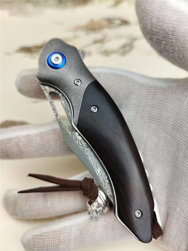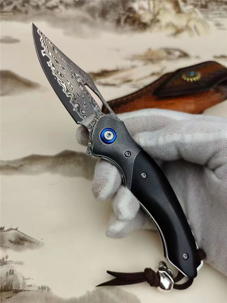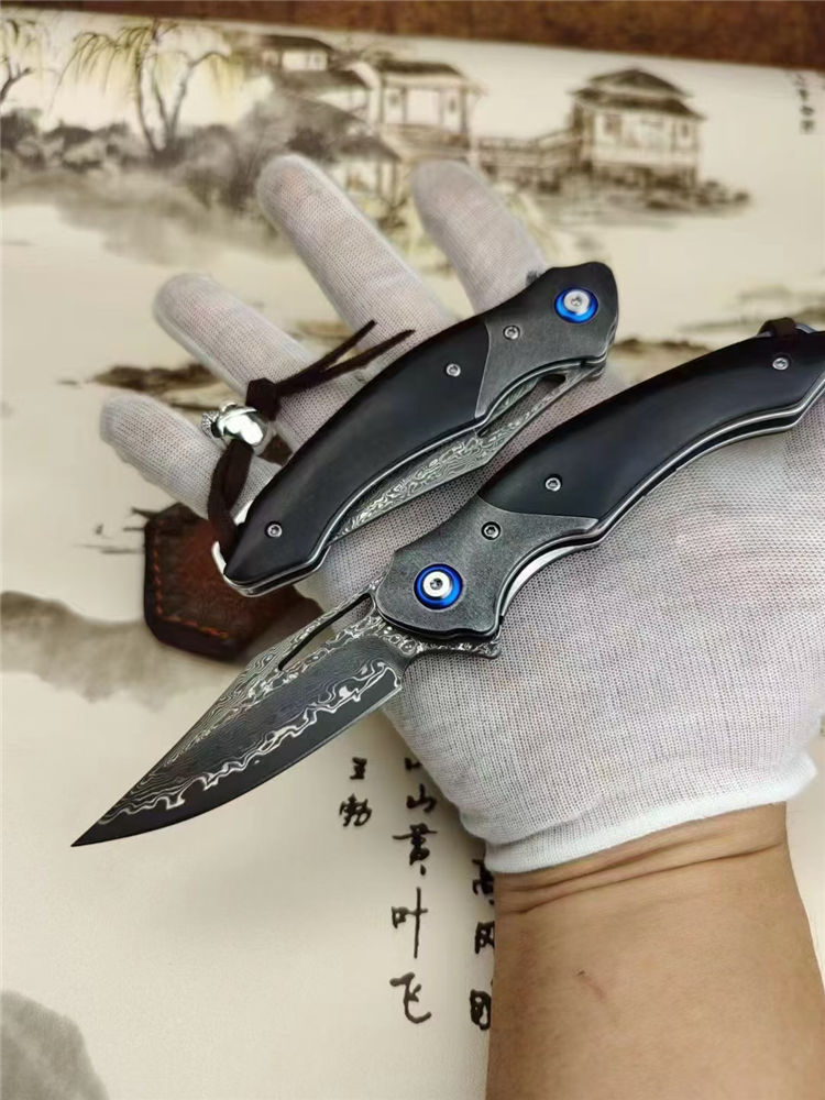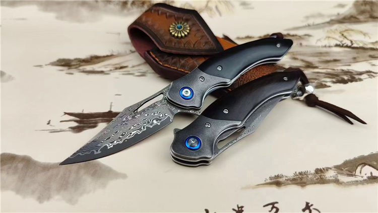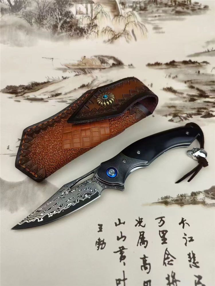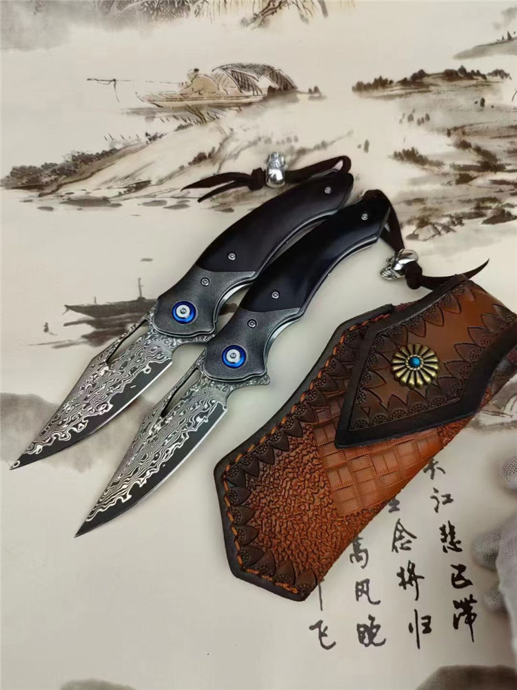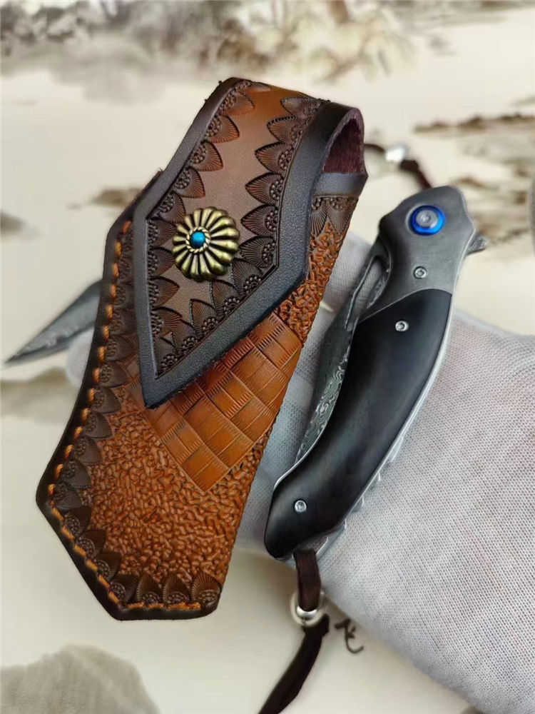 大马士革蜥蜴龙折刀 总长:20.5cm 刃长:9cm 刃厚:3.5cm 钢材:进口VG10钢芯大马士革 表面效果:复古黑白锻造纹理 硬度:60-62HRC真空热处理 柄材:老树黑檀+钢头石洗 皮套:意大利进口手工雕花植鞣雕花牛皮套 包装:精品礼品盒子包装
