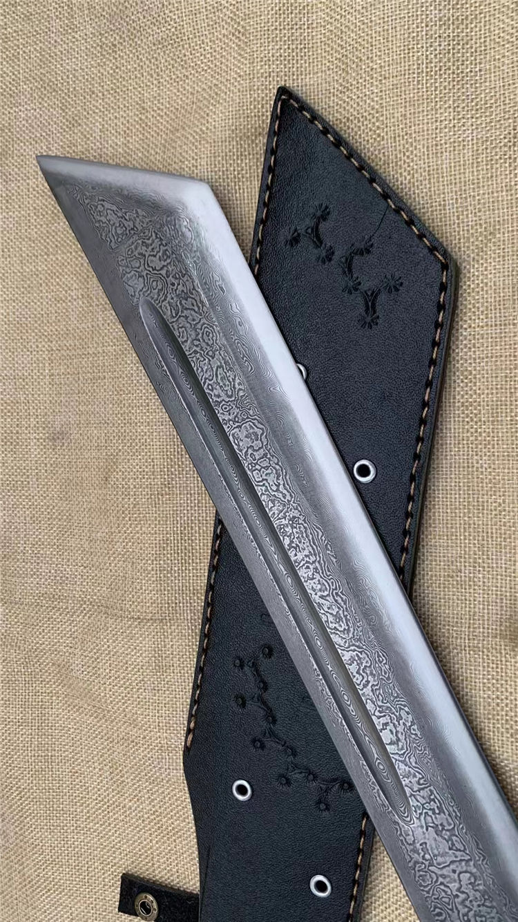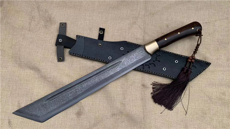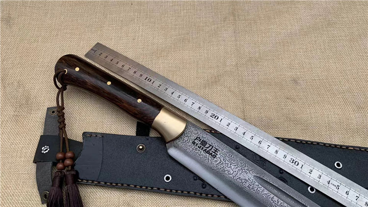 户撒刀高端开山刀 全长:52cm 刀长:36cm 把长:16cm 刀宽:5.5cm 刃厚:0.8cm 刀把龙骨一体刀身为百炼折花手工锻打此刀钢火好,手感好,又大气