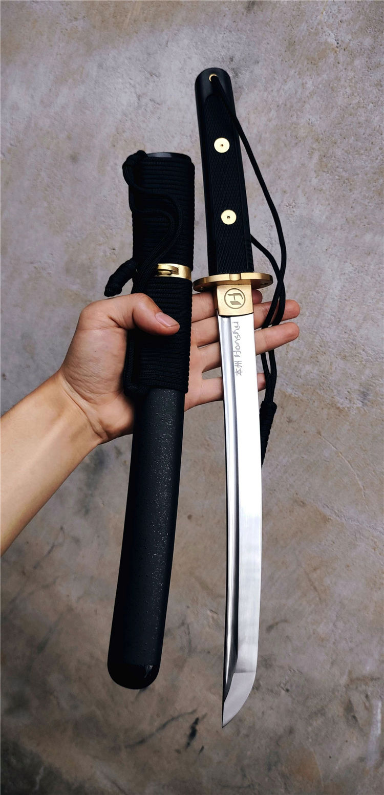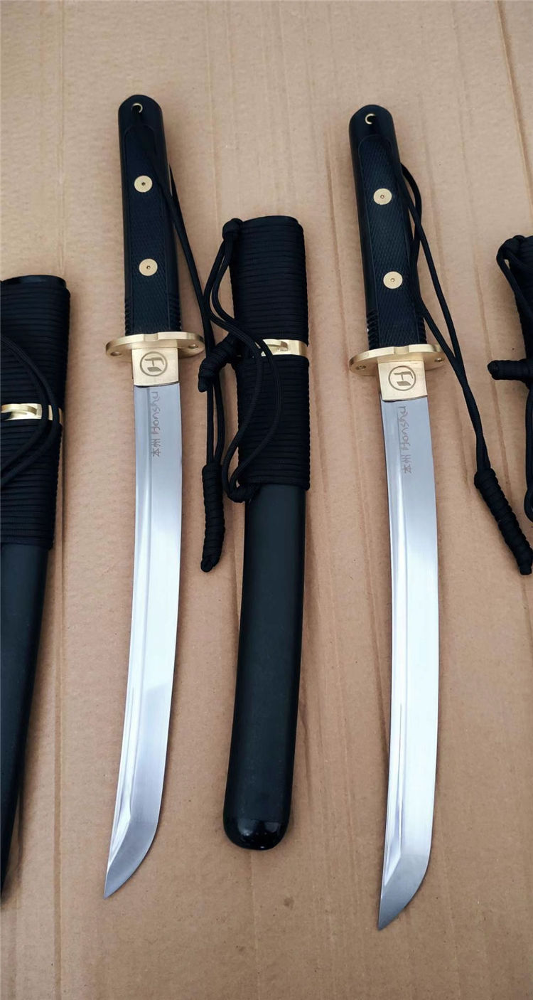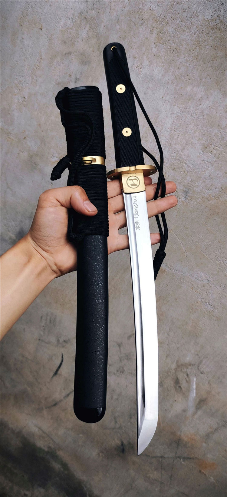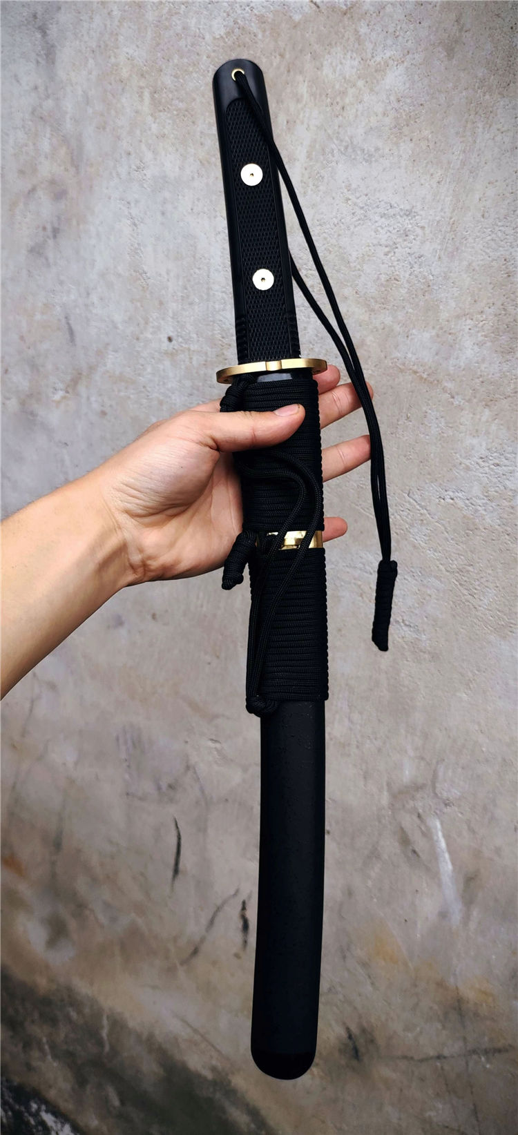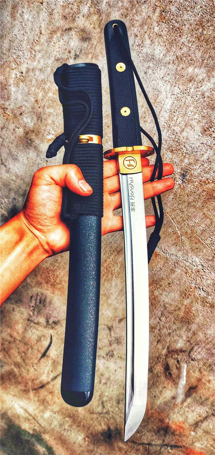 黑金款战术武士刀 全长:52.6cm 刃长:28.7cm 刀身:1095进口钢锻造,手工拉丝,柄为色ABS 柄绳为特种作战伞兵绳,纯铜刀盘刀夹