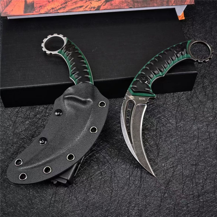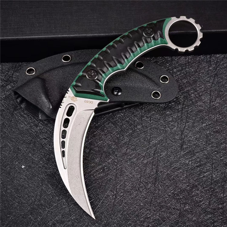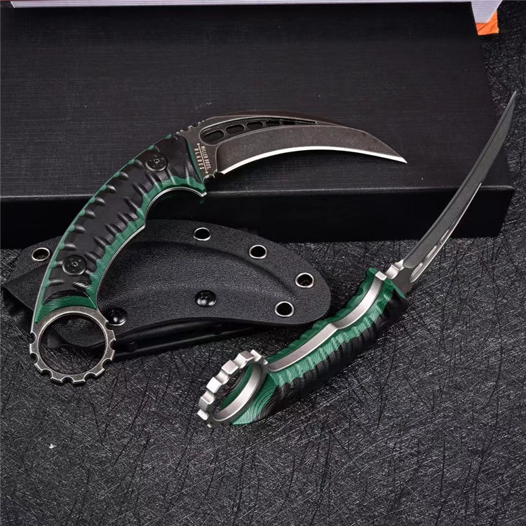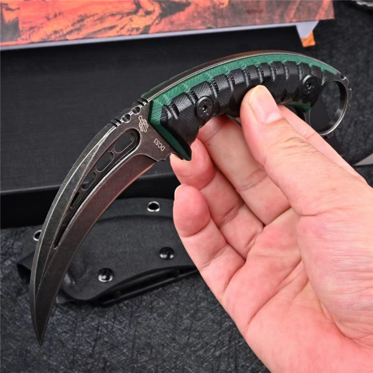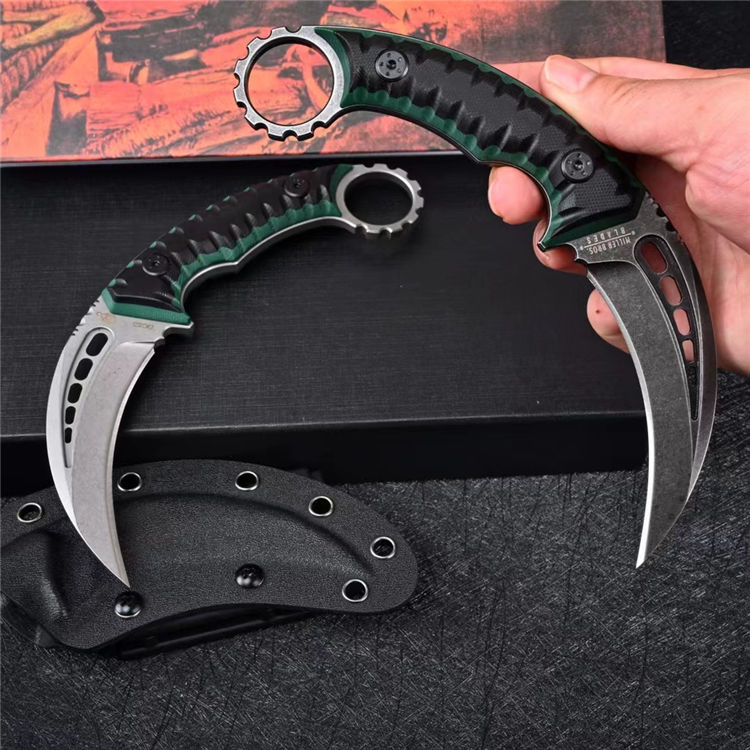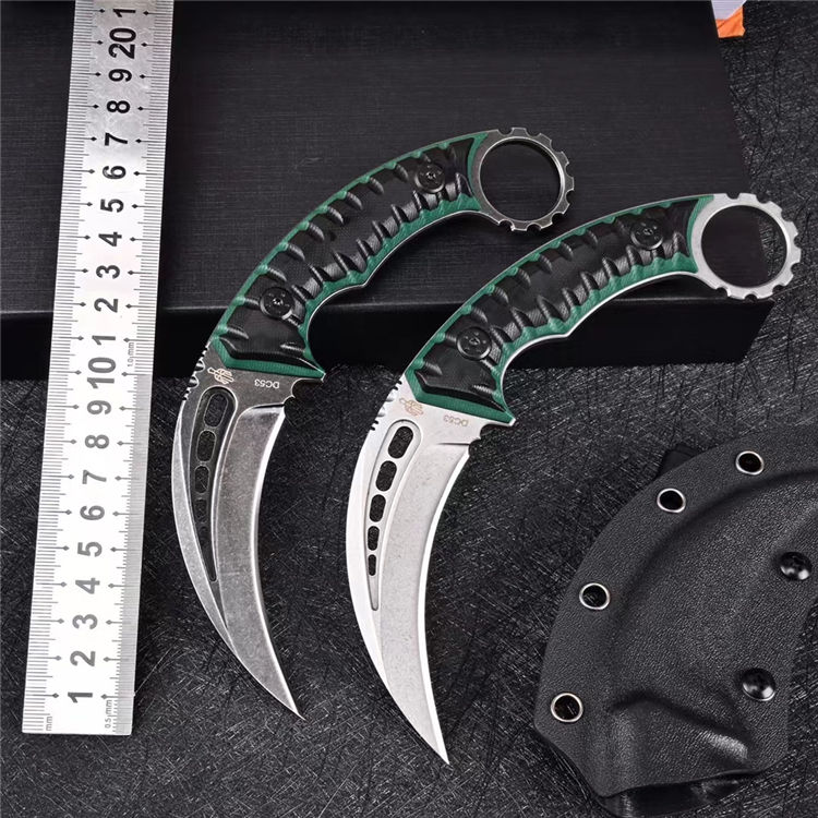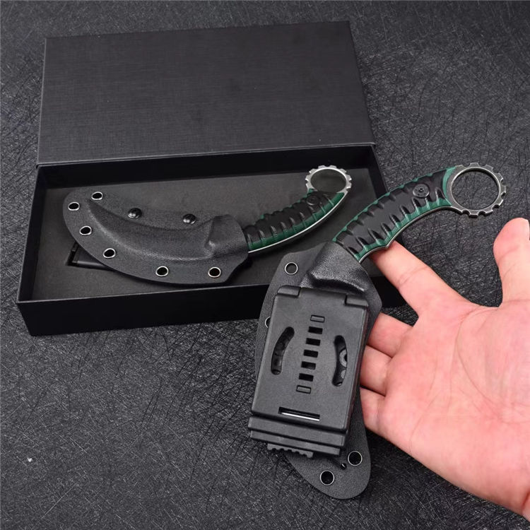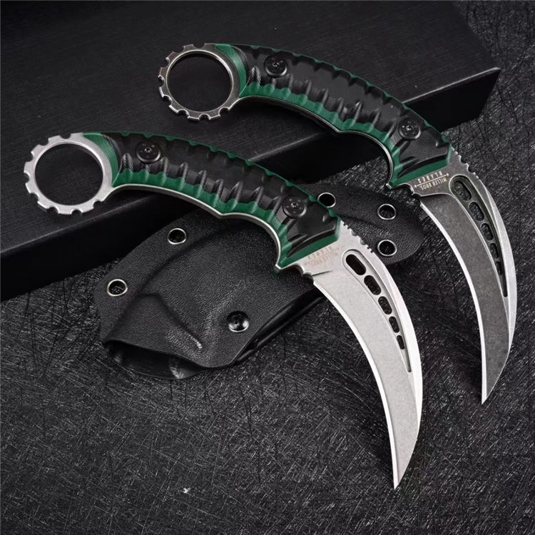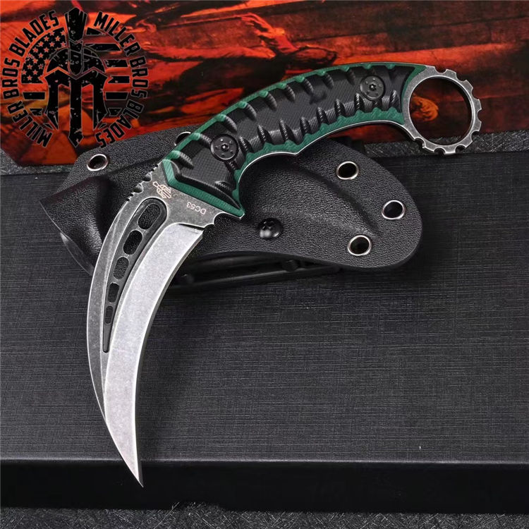 米勒兄弟M27爪刀 品牌名称:Miller Bros Blades米勒兄弟 型号:M27 总长:190mm 刃长:85mm 柄长:115mm 刃厚:5mm 刃宽:29mm 净重:177.2g(单刀) 毛重:400.6g 钢材:DC53 柄材:双色G10 硬度:60 HRC 刀鞘:kydex鞘 表面处理:沧桑石洗 包装:黑色盒子