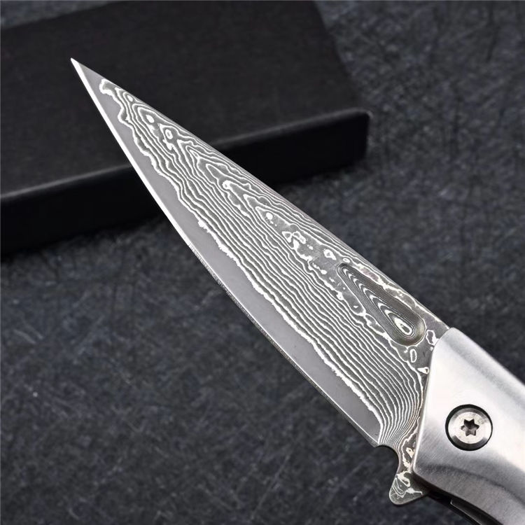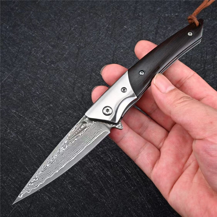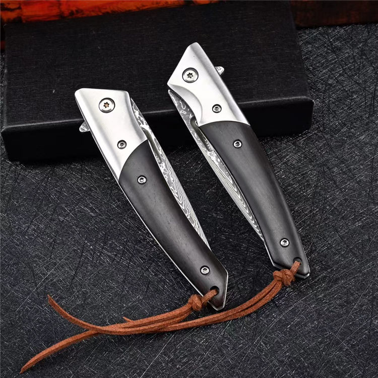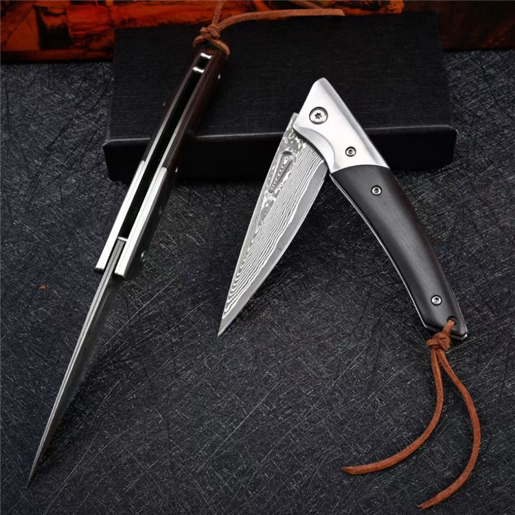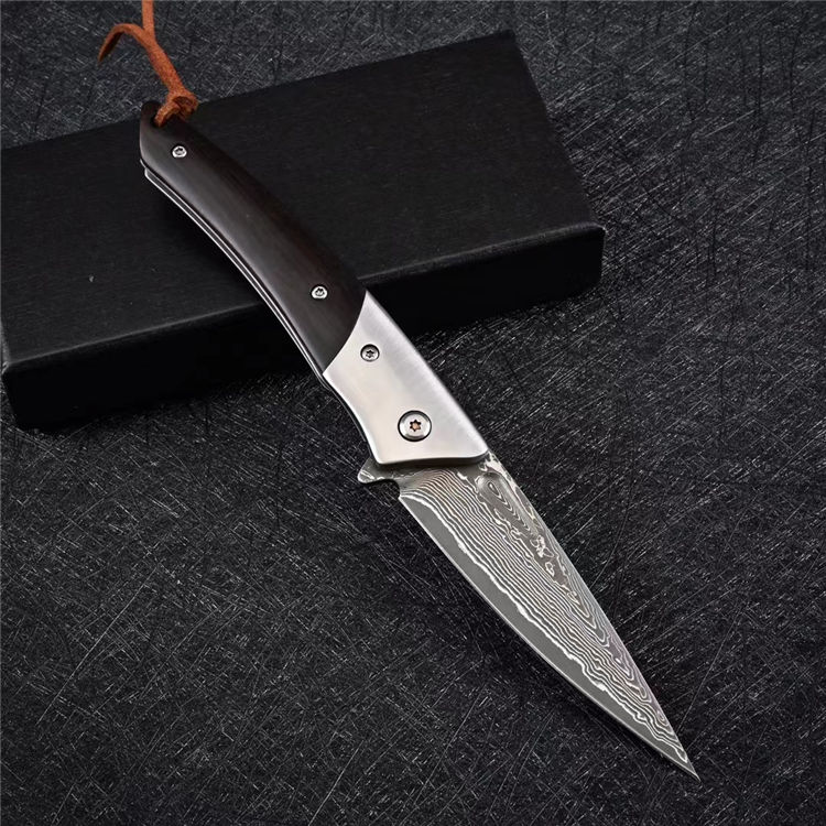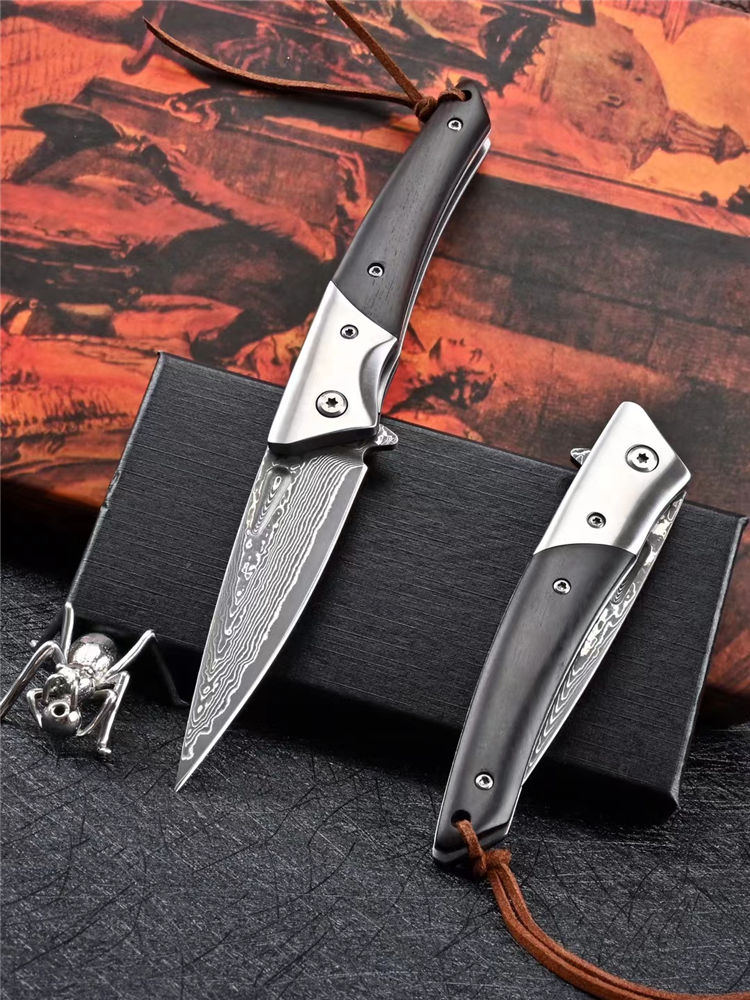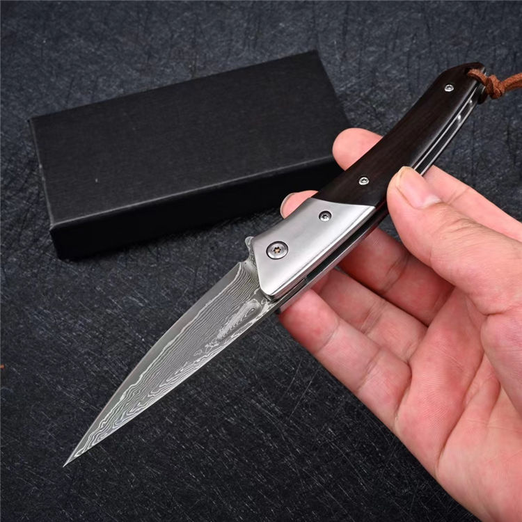 大马士革穿梭机折刀 总长:193mm 刃长:83mm 柄长:115mm 刃厚:2.8mm 刃宽:23mm 净重:96.2g 毛重:140.7g 钢材:VG10大马士革钢 柄材:不锈钢+黑檀木 硬度:60-61HRC 表面处理:大马士革纹 包装:黑色盒子