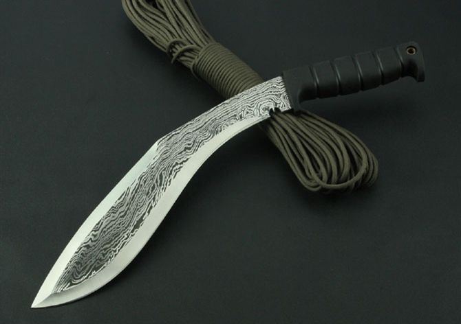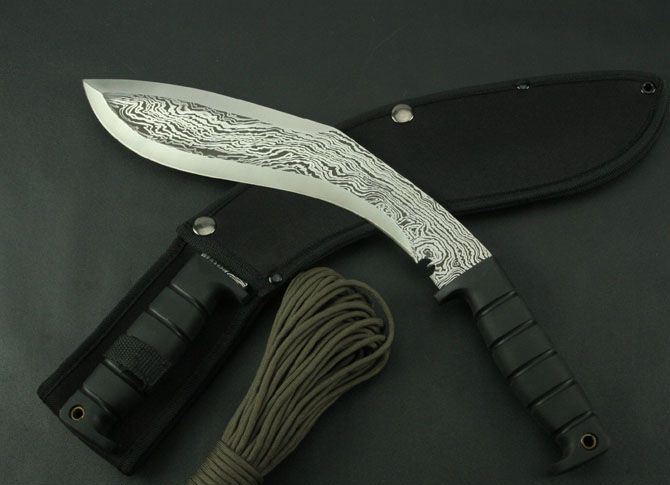 卡巴—081狗腿(腐蚀) 全 长:420mm 刃 长:270mm 柄 长:128mm 刃 宽:58mm 刃 厚:3.1mm 刃 材:5Cr13Wov 重 量:610g(含刀套) 硬 度:56HRC 表 面:腐蚀 柄 材:ABS(塑胶) 锁 型:定锁 其 他:配尼龙套
