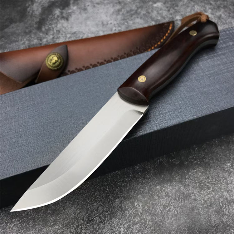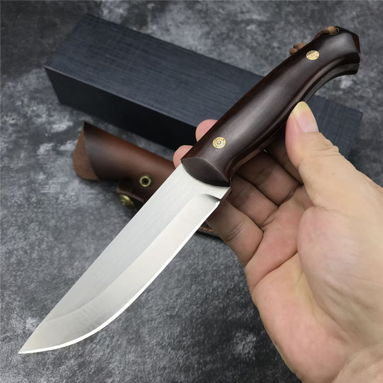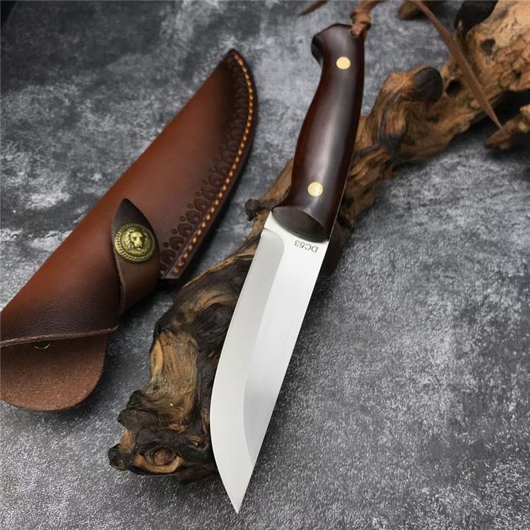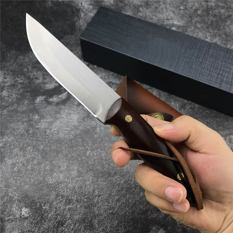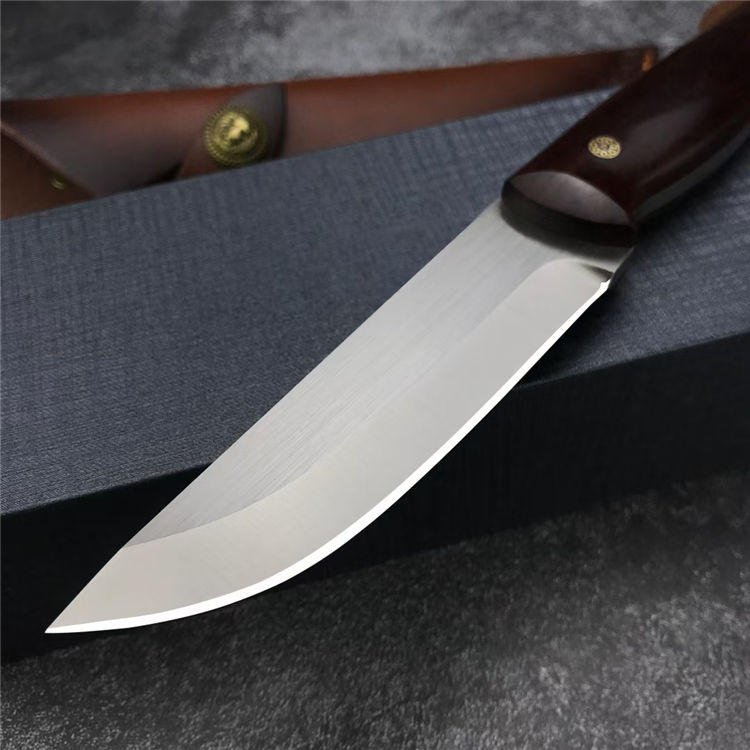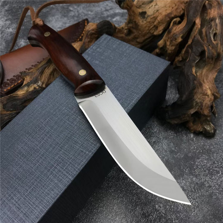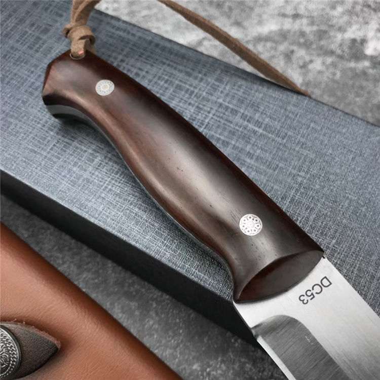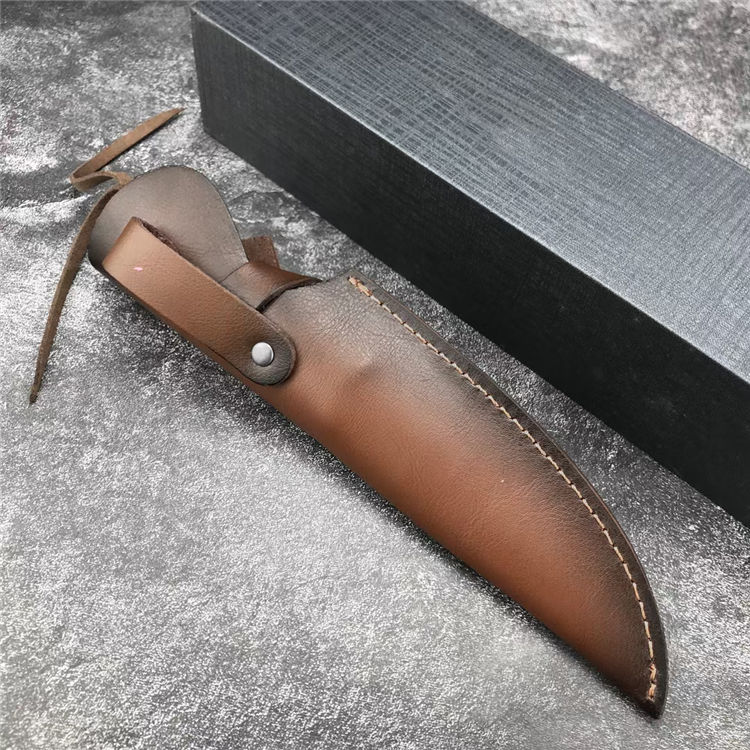 小蟒蛇直刀 全长:21.9CM 刃长:11.2CM 刃宽:2.8CM 刃材:DC53 硬度:60 刃厚:5MM 柄长:10.7CM 手柄:黑檀木 重量:220G 总重量:473G(含盒子刀鞘) 刀鞘:雕花牛皮鞘