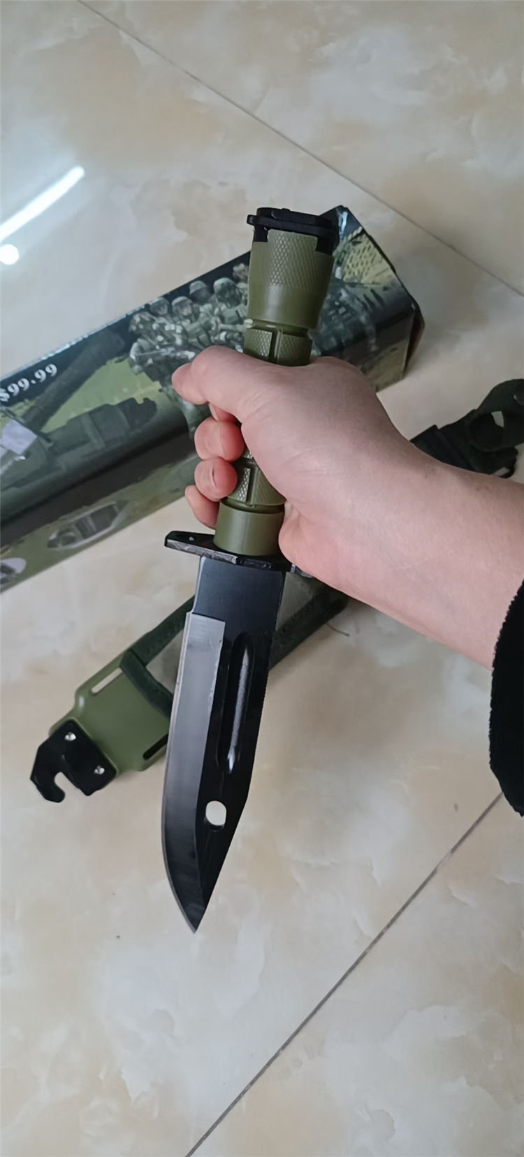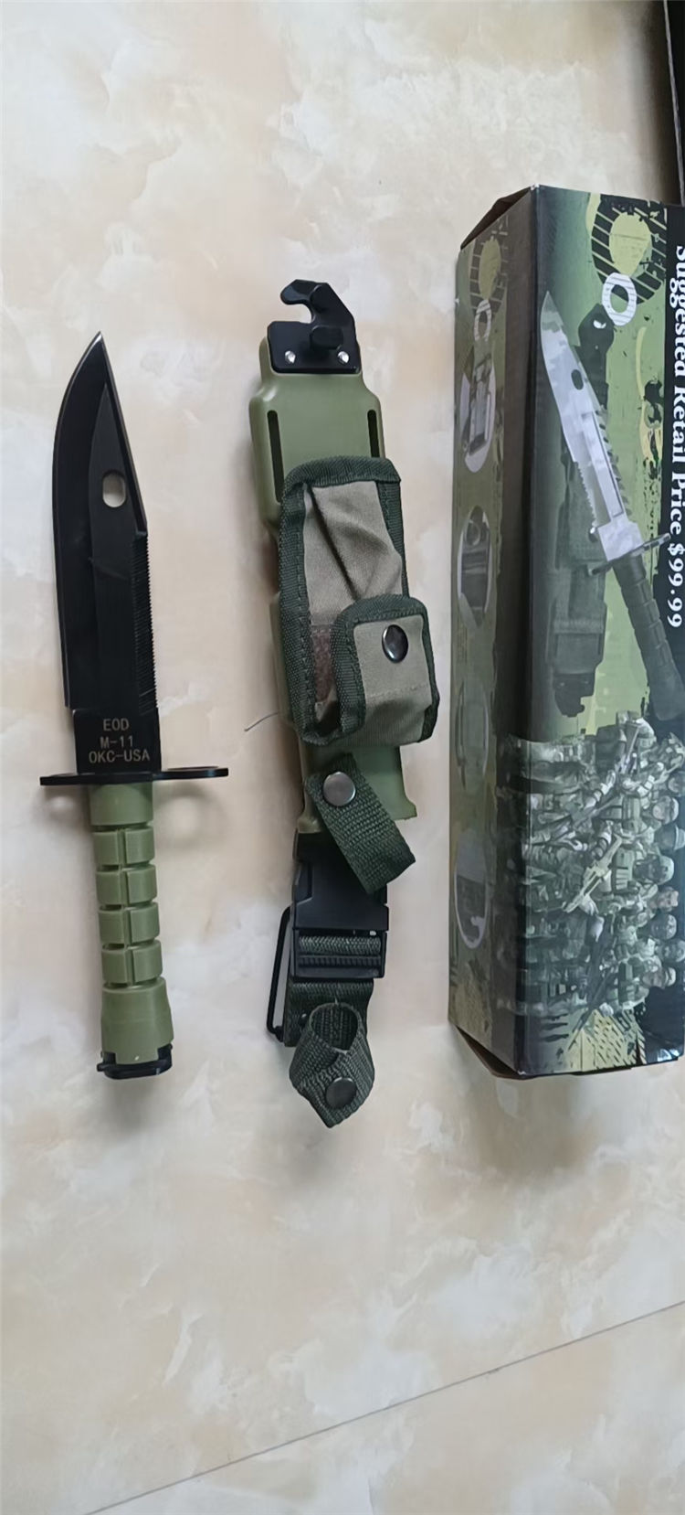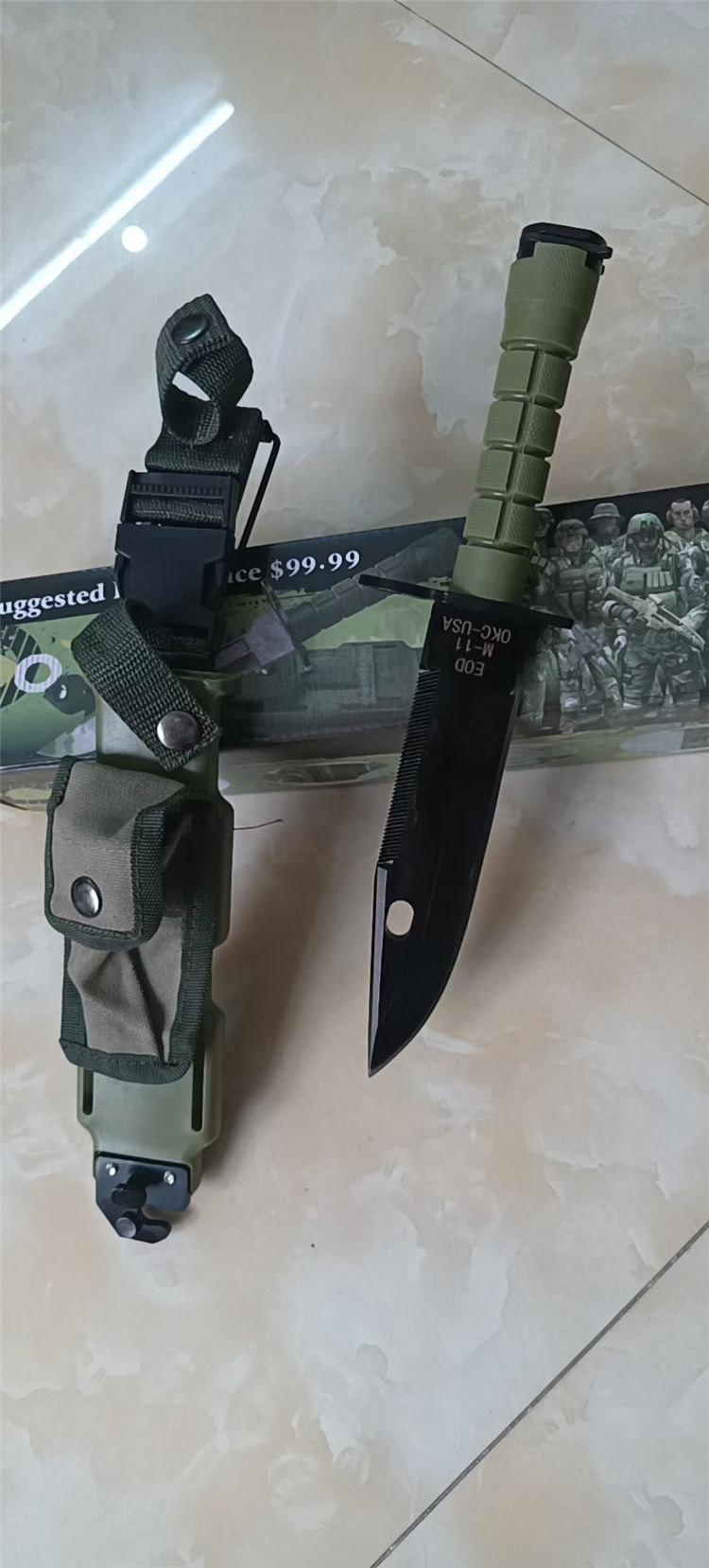 改版M11军刺 全长:30cm 刃长:18cm 柄长:12cm 刃厚:5mm 刃材:4CR13 硬度:56HRC 重量:含包装660g 表面:发黑 柄材:ABS 刀鞘:ABS