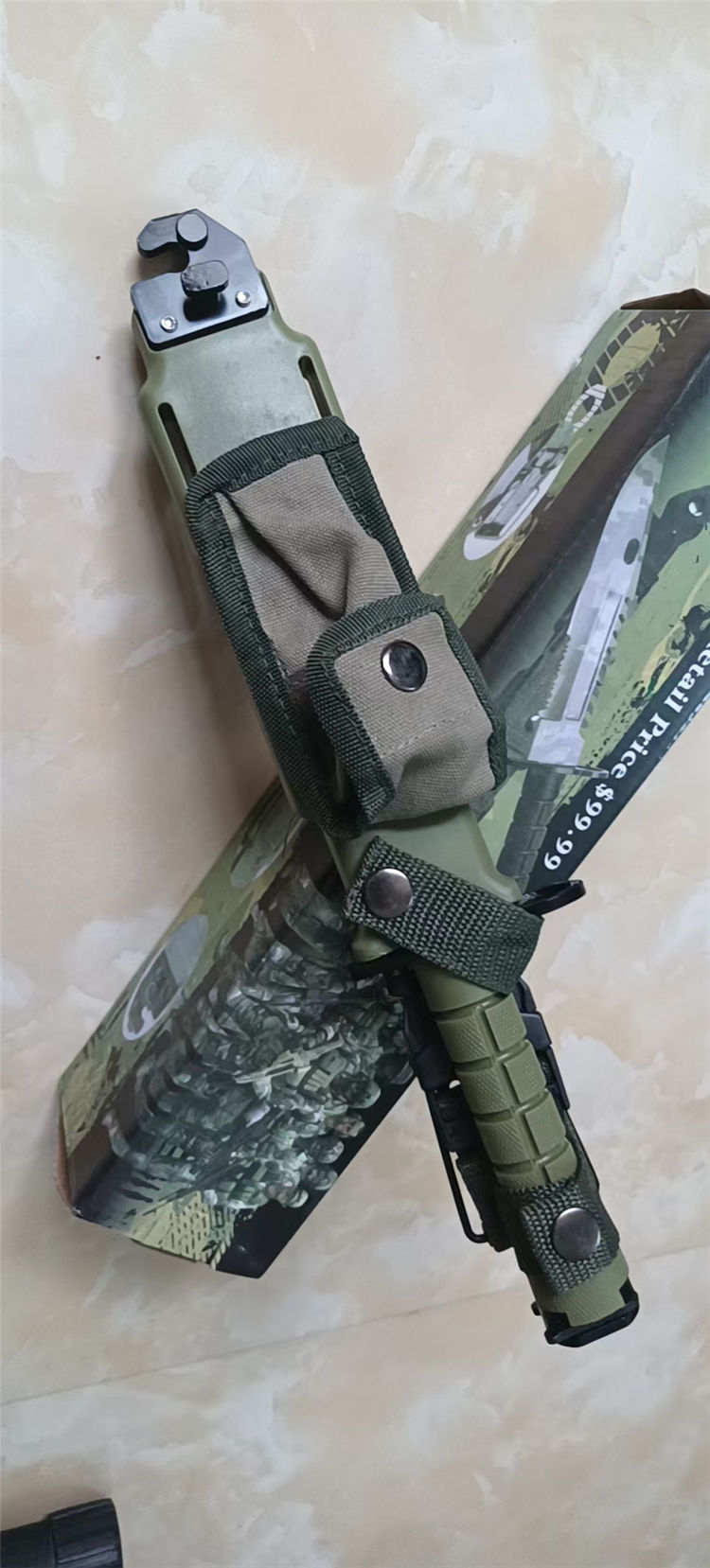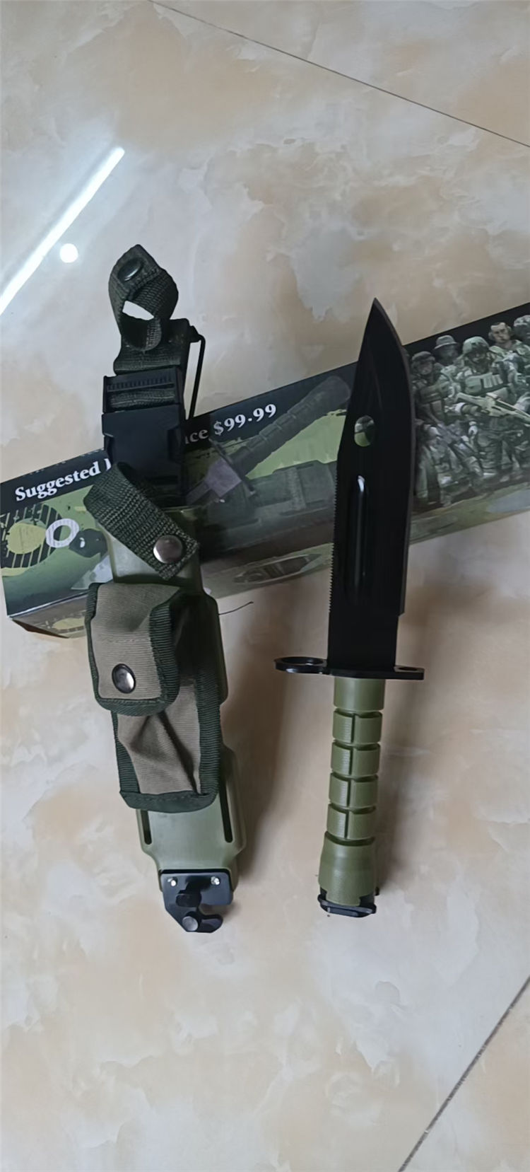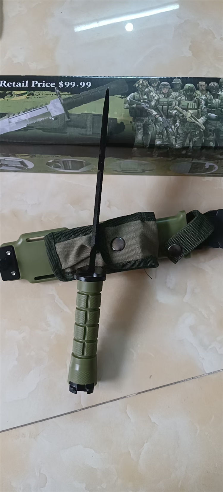 改版M11军刺 全长:30cm 刃长:18cm 柄长:12cm 刃厚:5mm 刃材:4CR13 硬度:56HRC 重量:含包装660g 表面:发黑 柄材:ABS 刀鞘:ABS