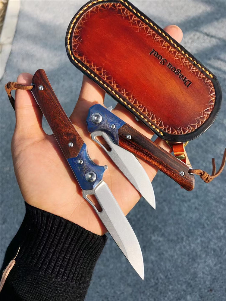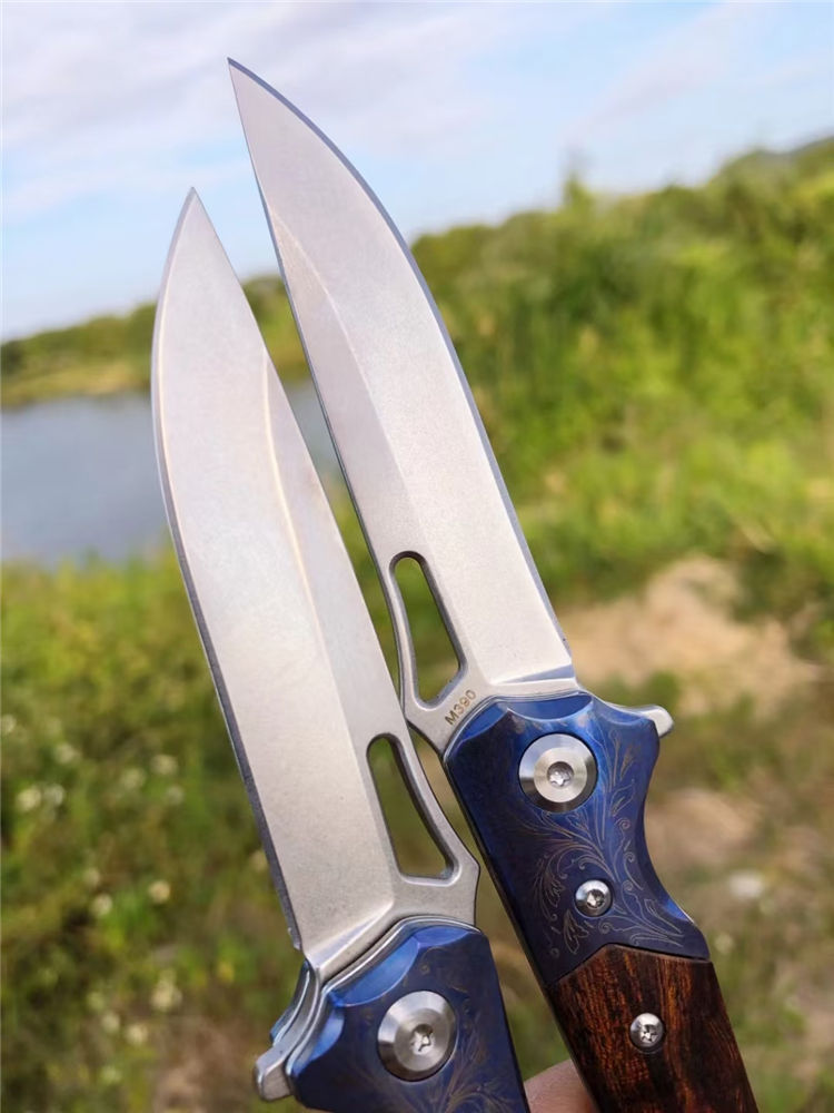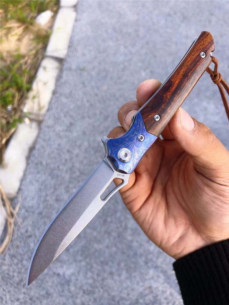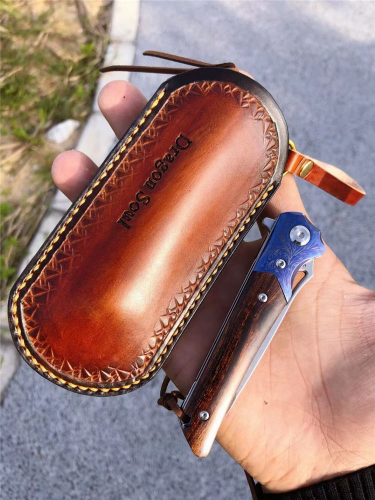 M390雅智折刀 总长:18.2cm 刃长:7.9cm 柄长:10.3cm 厚度:3.2mm 宽度:1.9cm 刃材:奥地利进口M390粉末钢(真空冷热处理) 硬度:61-62HRC 柄材:TC4钛合金烤蓝处理后雕花钢铁+进口美国沙漠铁木 开刃方式:水冷二次开刃 皮套:意大利手工雕花头层牛皮套 结构:陶瓷滚珠轴承,陶瓷定位珠