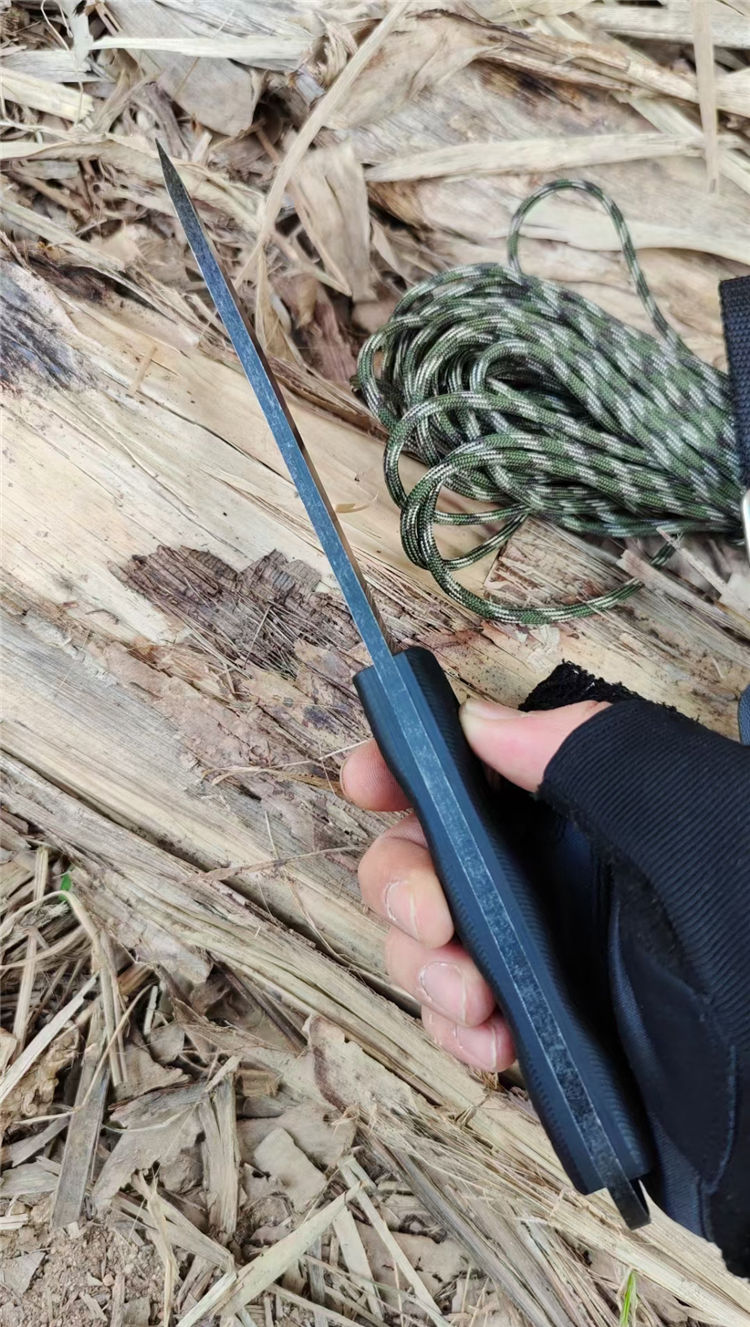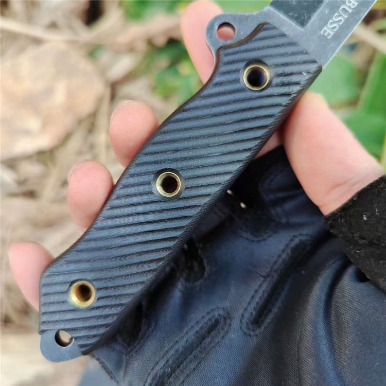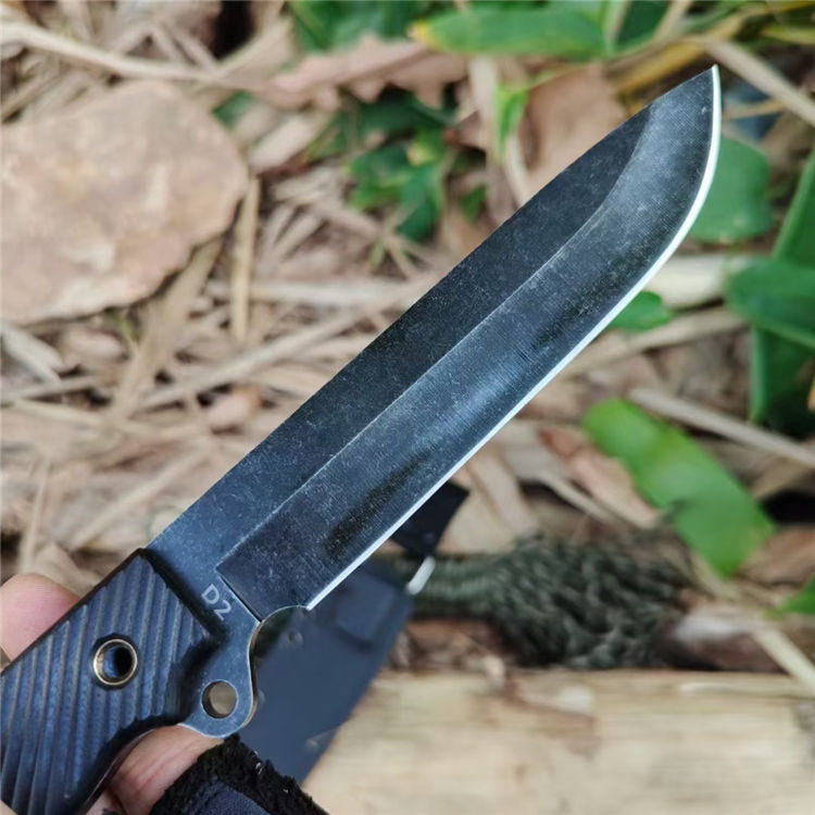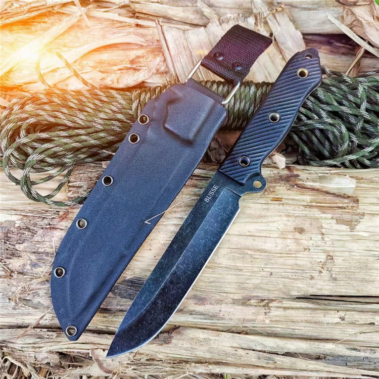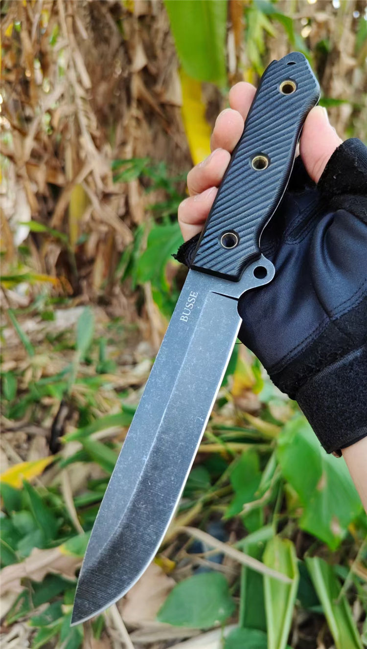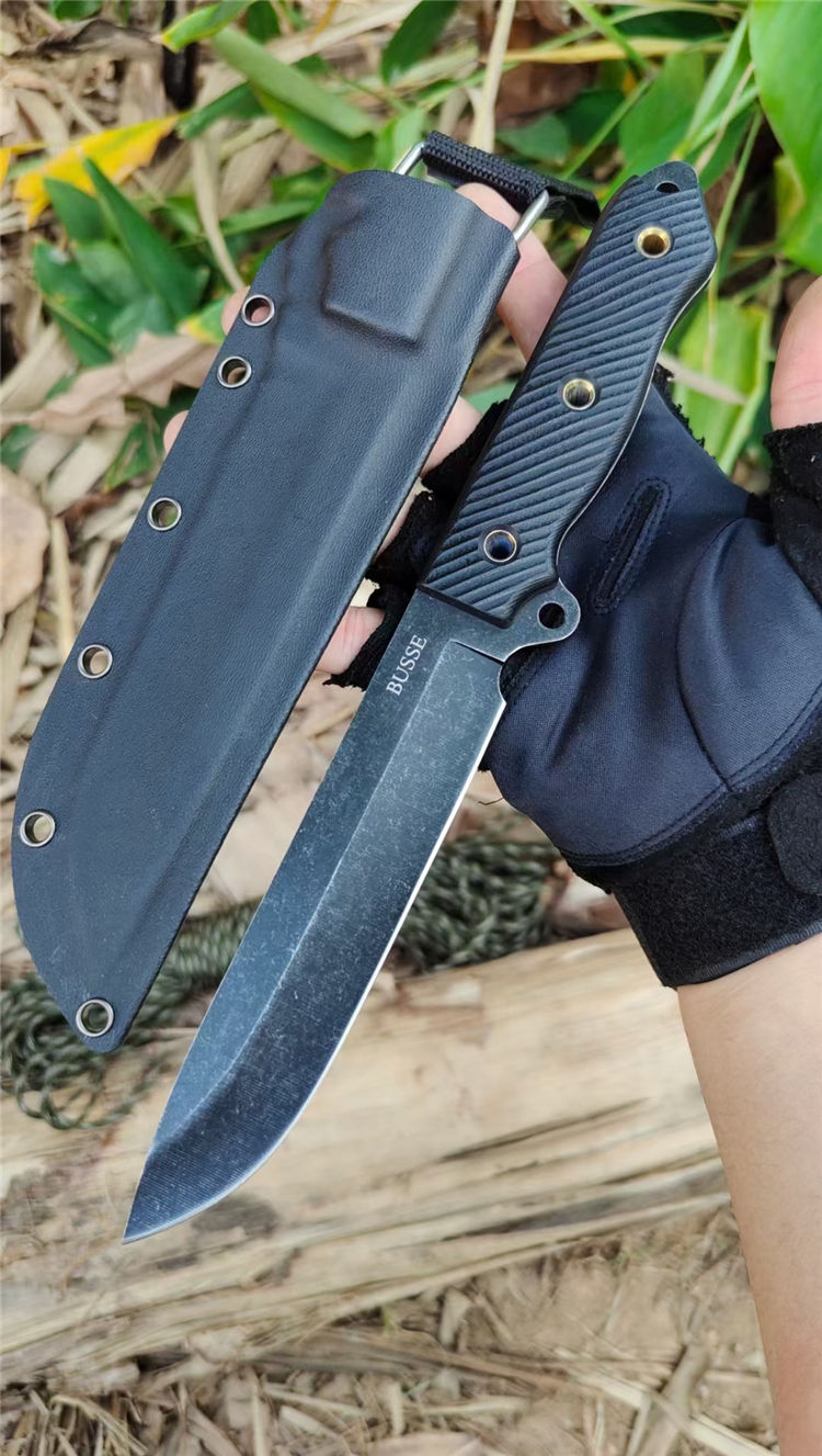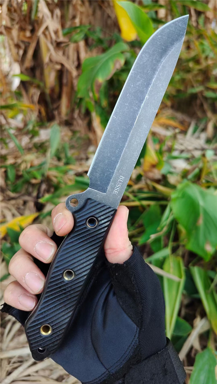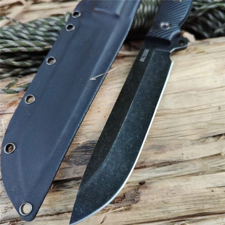 巴斯黑熊直刀 总长:29CM 刃长:15CM 柄长:13CM 钢材:进口D2高速钢 硬度:59~61HRC 表面:沧桑石洗自然做旧 柄材:高密度G10 刃厚:4.8MM 刃宽:3CM 重量:392克(含鞘) 刀套:K鞘(黑色色) 结构:D2一体全钢