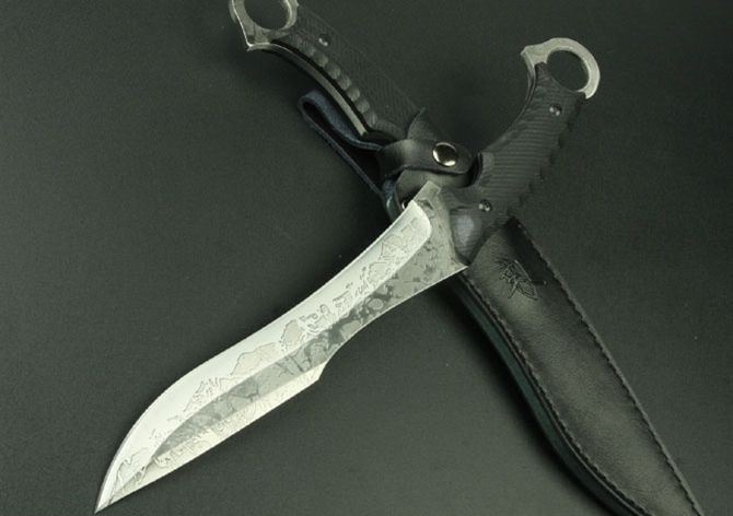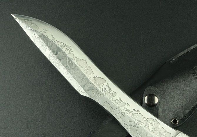 菊男—将神弯刀 全长:39CM 刃长:23CM 刃材:7Cr17 硬度: 60HRC 刃厚: 0.58CM 刃宽:3.6CM (最宽处) 柄长: 17CM 重量:680g 柄材: 米卡塔 刀鞘:皮套