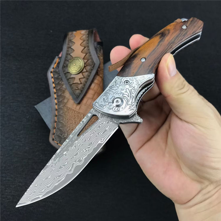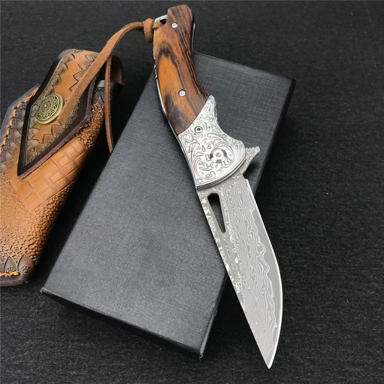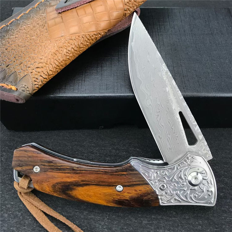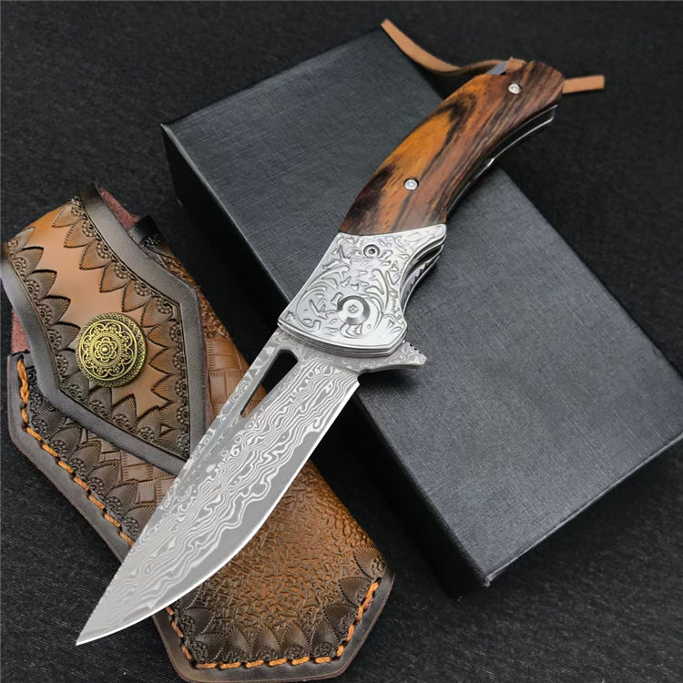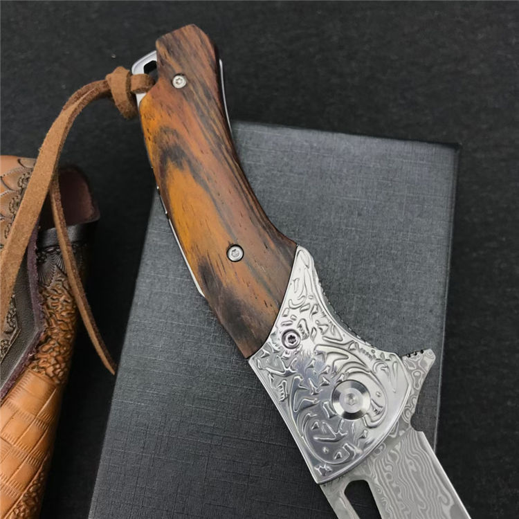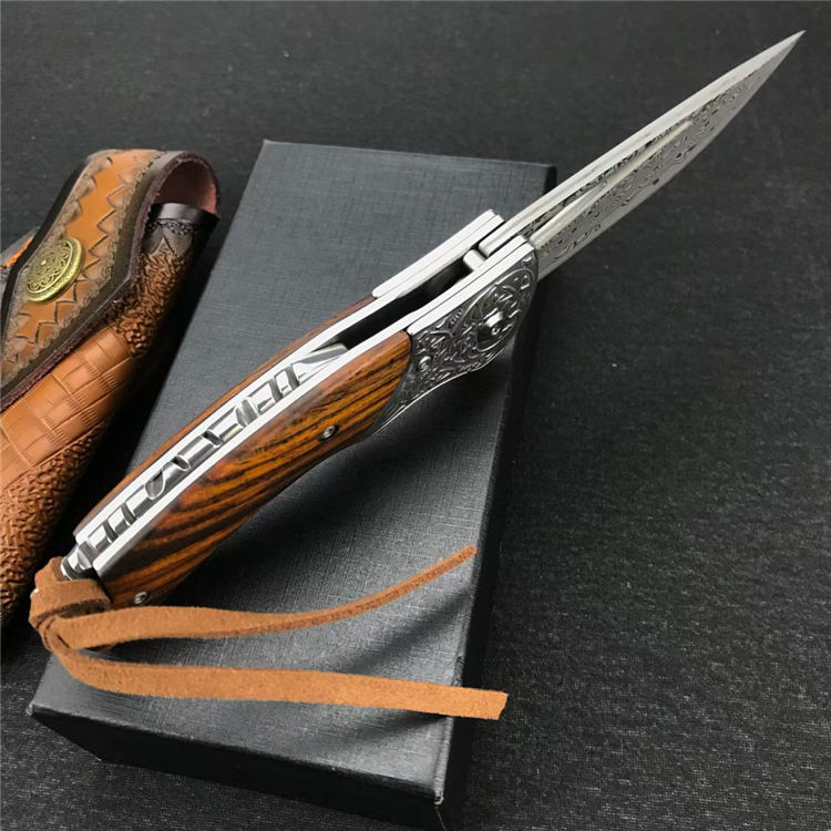 大马士革碎花折刀 全长:19.4CM 刃长:8.4CM 刃宽:2.3CM 刃厚:3MM 刃材:大马士革钢 柄长:11CM 手柄:酸枝木 重量:174G 总重量:269G(含皮鞘盒子) 刀鞘:牛皮雕花刀鞘