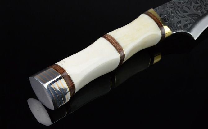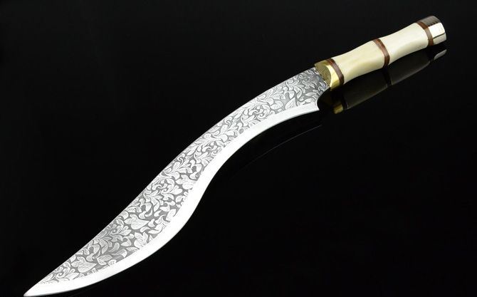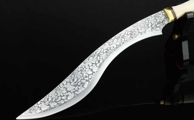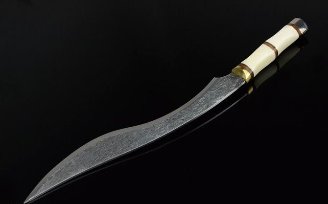 月牙扎花弯刀 全 长: 60.8cm 刃 长: 40.3cm 刃 厚: 4.7mm 刃 宽: 6.6cm(最宽处) 刃 材: 420 硬 度: 57HRC 刀 重: 2260克(含包装) 表 面: 扎花 柄 材: 铜+钢+皮+野骨 结 构: 一体龙骨 刀 鞘: 牛皮